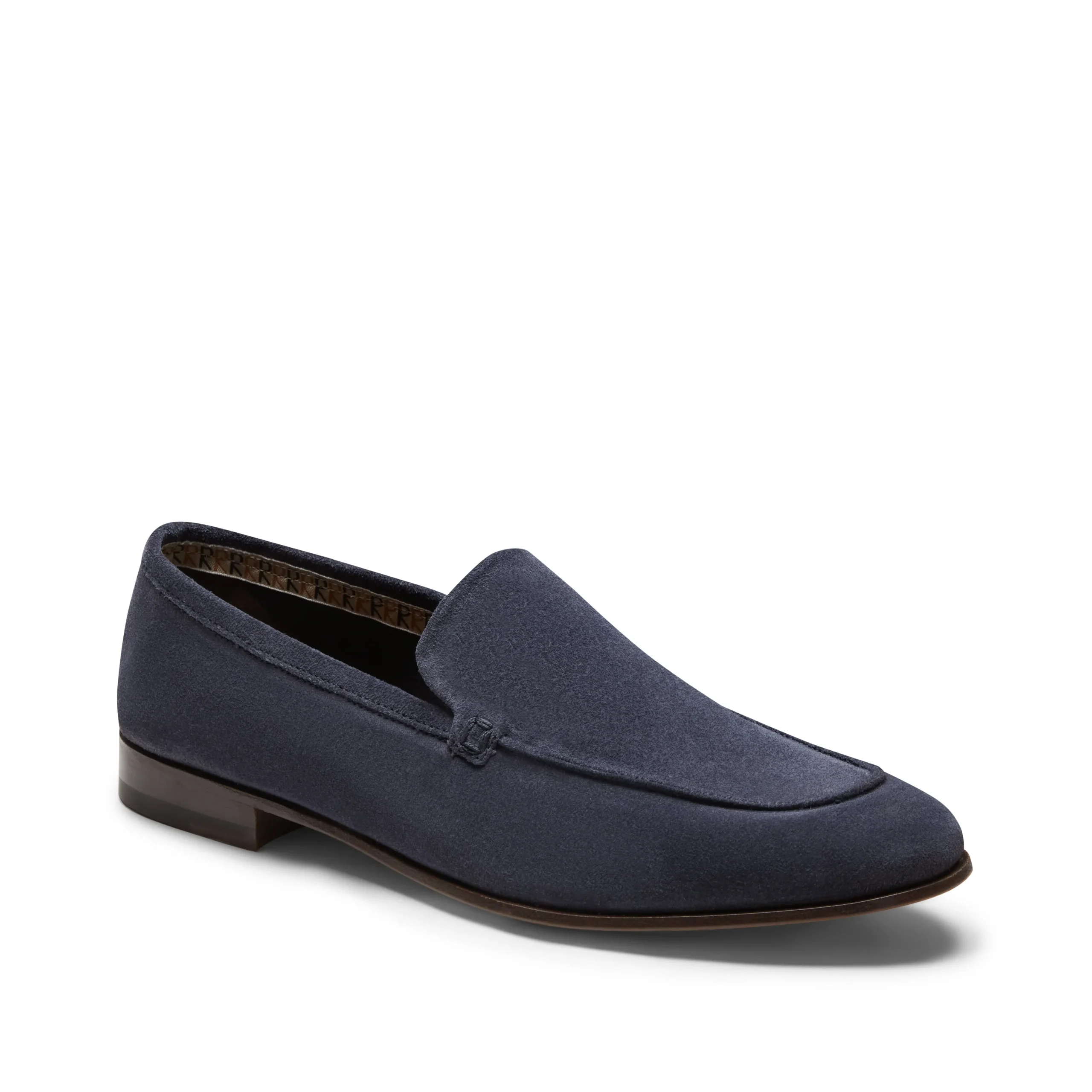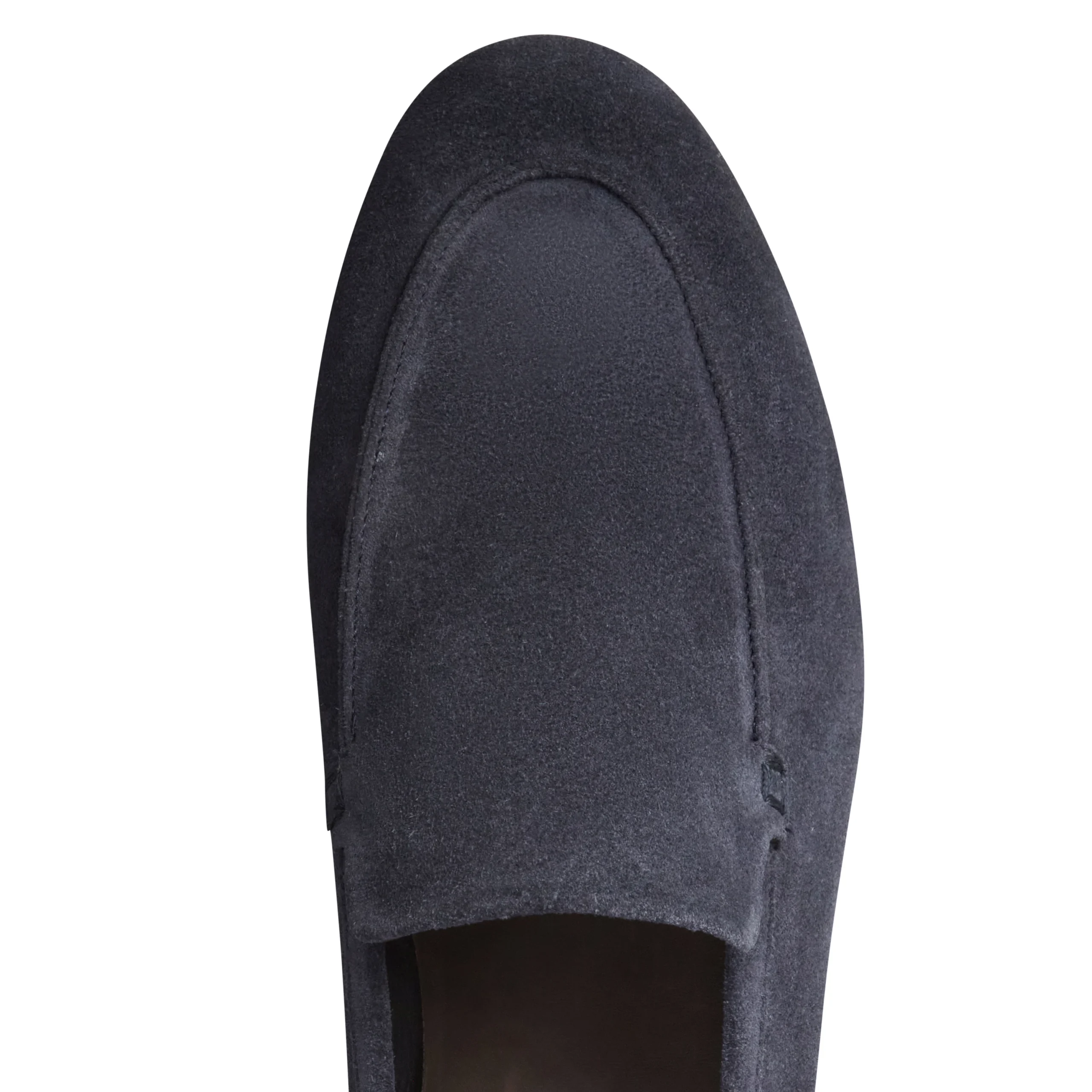 Mocassino con fascetta destrutturato e sfoderato della linea Estate realizzato in morbida pelle scamosciata color blu navy. Calzatura leggera e flessibile. Profilo logato all’interno.