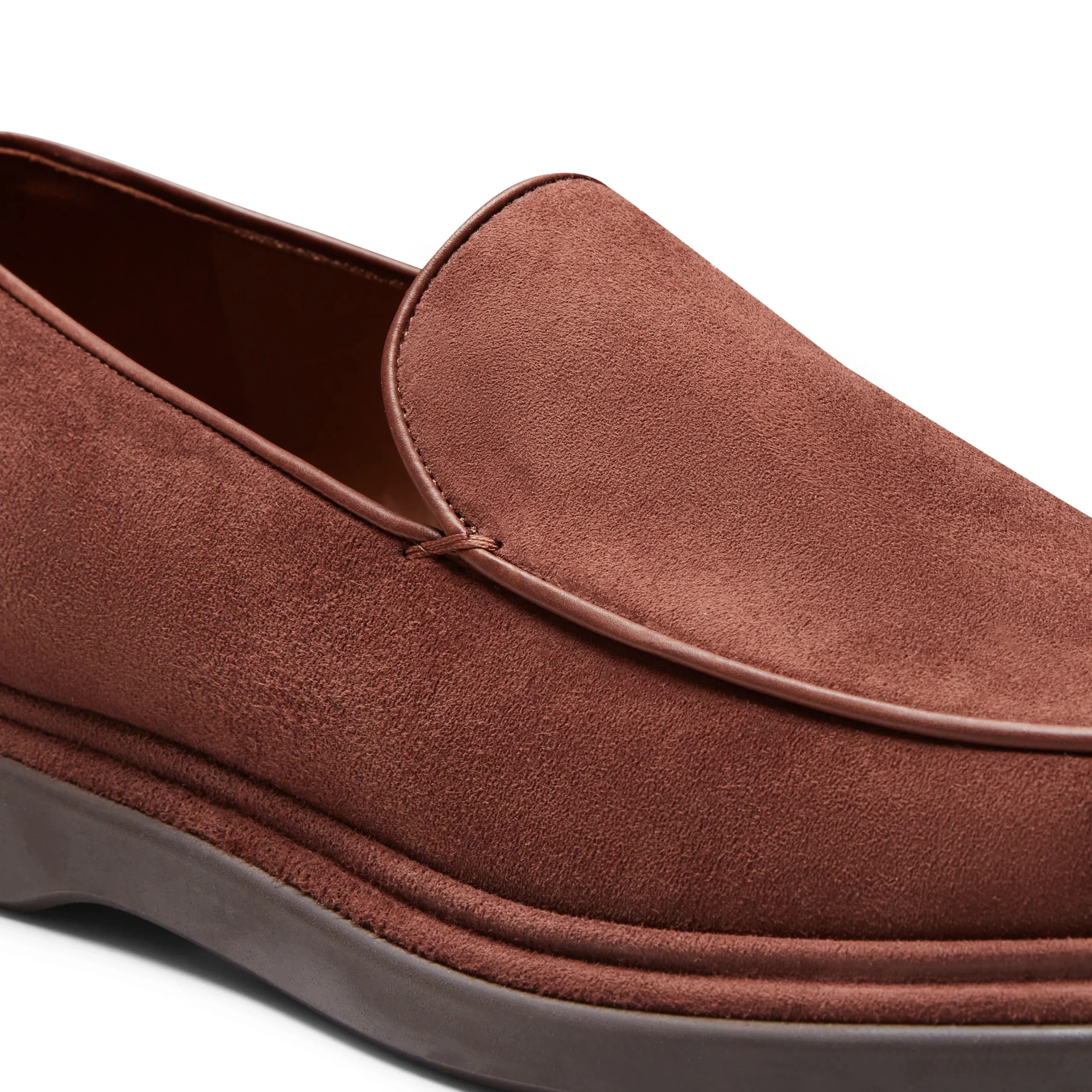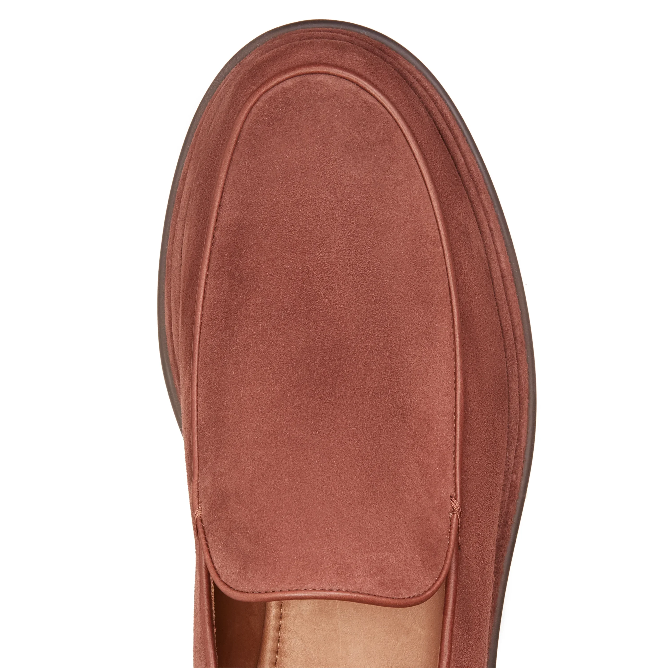 Raffinato mocassino liscio dalla forma quadrata realizzato in morbida pelle scamosciata color mandorla. Calzatura destrutturata dal look informale si caratterizza per dettagli di stile come il guardolo ricoperto della stessa pelle della tomaia.