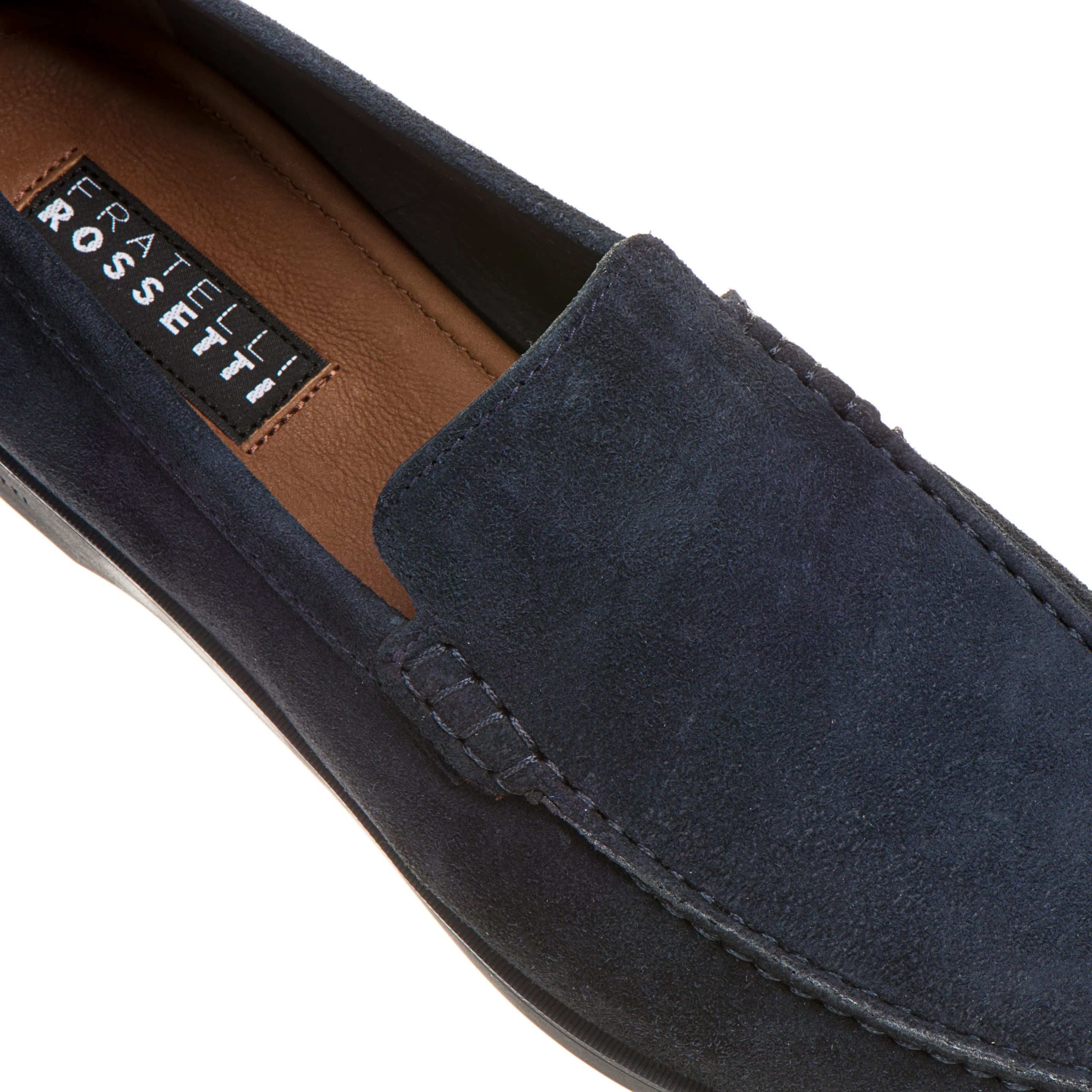 Mocassino realizzato in morbida pelle scamosciata blu marine con costruzione tubolare. Questa lavorazione prevede che la tomaia venga intagliata e cucita direttamente su forma, con lapplicazione finale della mascherina, conferendo alla calzatura unestetica ricercata e versatile. Il fondo in gomma con particolare texture, ne accentua il comfort.