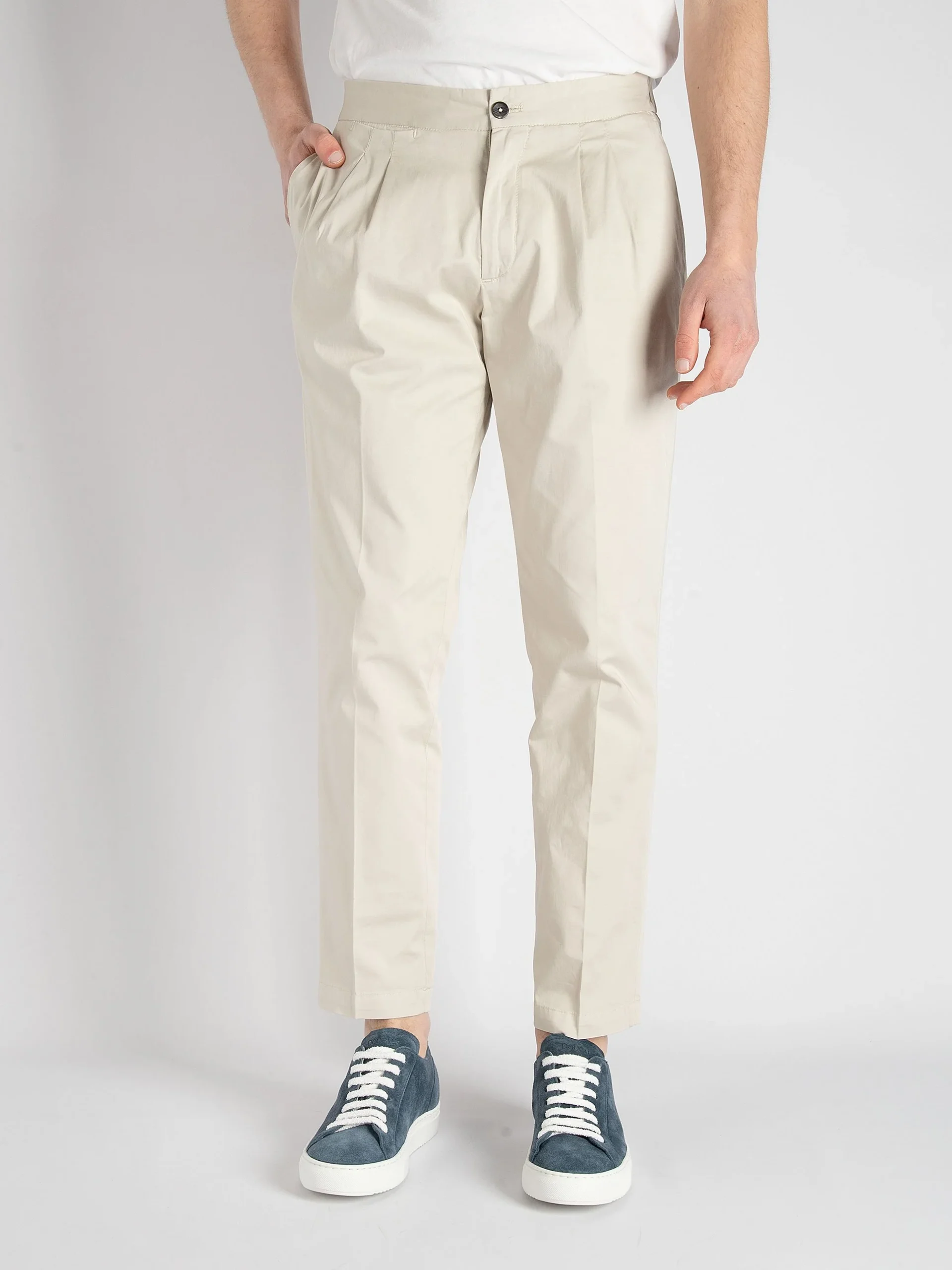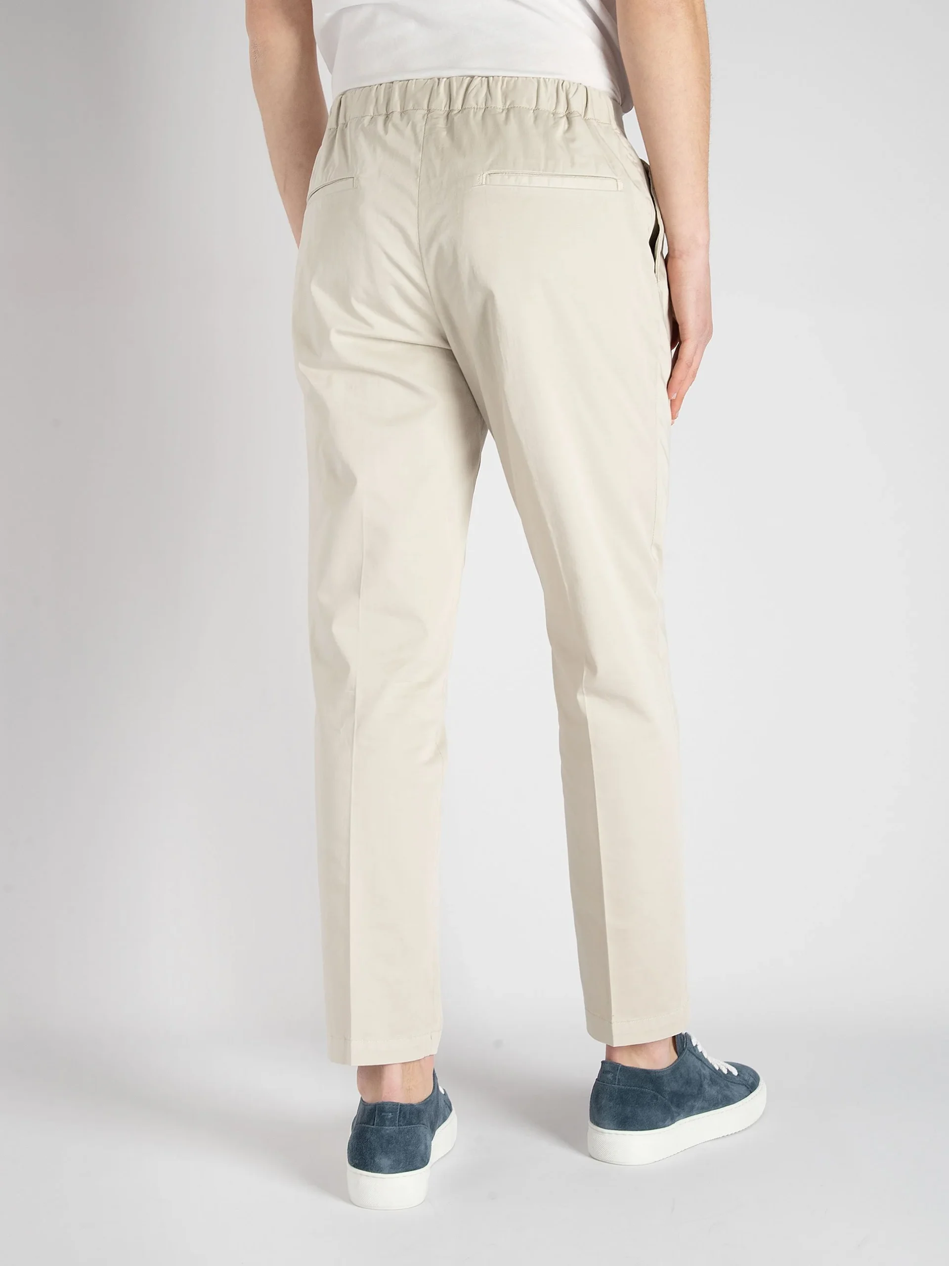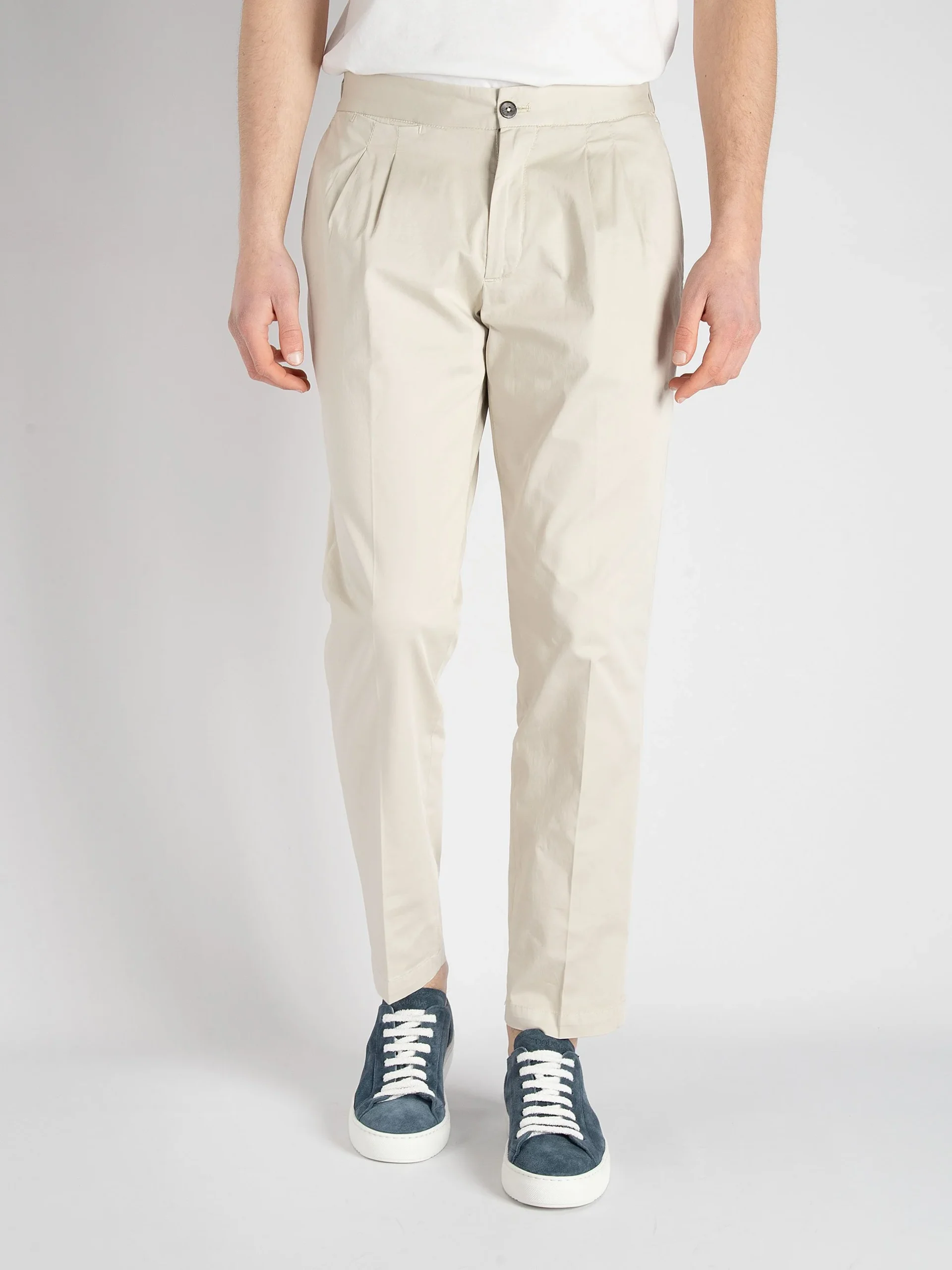 Mod: DVR10G002 GESSO Pantalone sartoriale in raso di cotone. Chiusura centrale con bottone singolo e zip. Bottone in legno lavorato. Montante ibrido in vita, con inserto elastico sul retro. Laccio in cotone interno. Doppia pence in vita, gamba regolare e fondo 17cm. Composizione: 96% cotone, 4% elastan. 100% prodotto in Italia. Il modello è alto […]