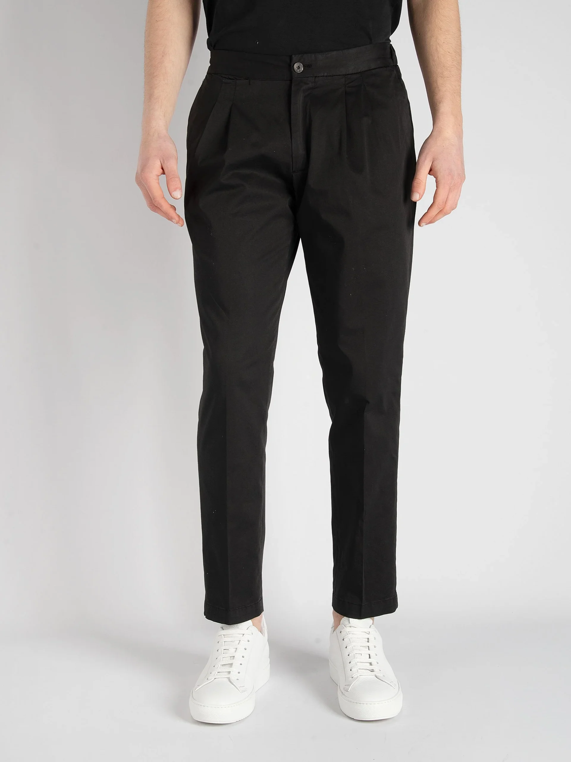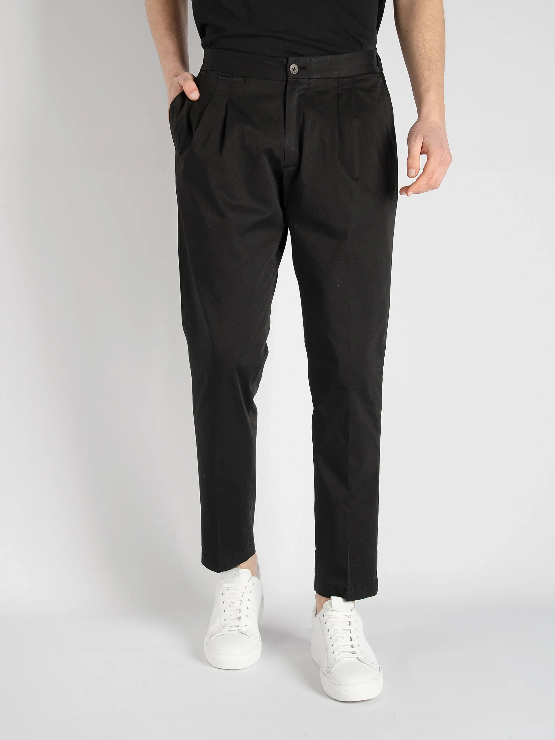 Mod: DVR10G002 TC001 NERO Pantalone sartoriale in raso di cotone. Chiusura centrale con bottone singolo e zip. Bottone in legno lavorato. Montante ibrido in vita, con inserto elastico sul retro. Laccio in cotone interno. Doppia pence in vita, gamba regolare e fondo 17cm. Composizione: 96% cotone, 4% elastan. 100% prodotto in Italia. Il modello è […]