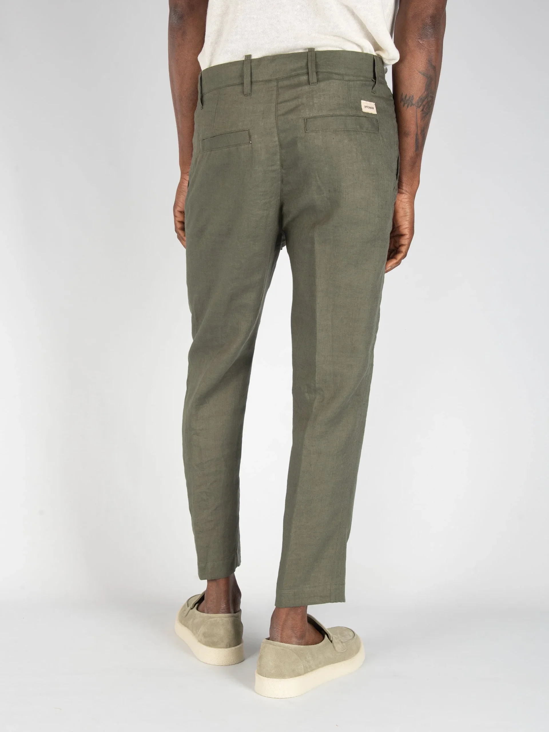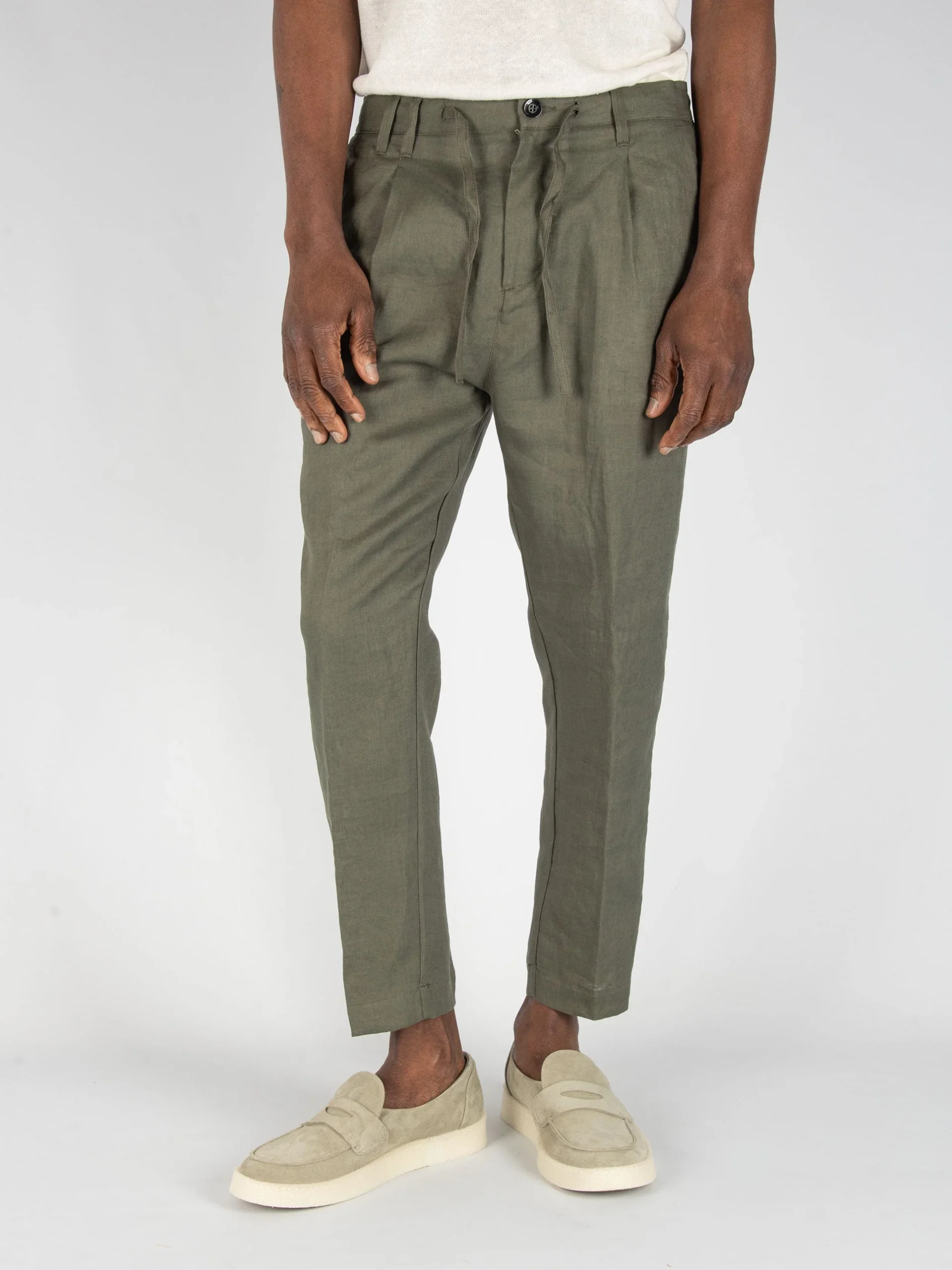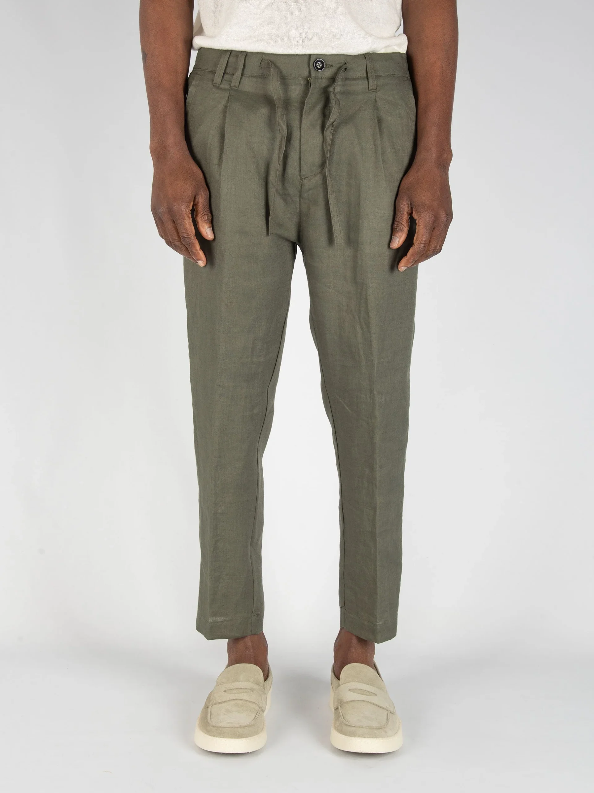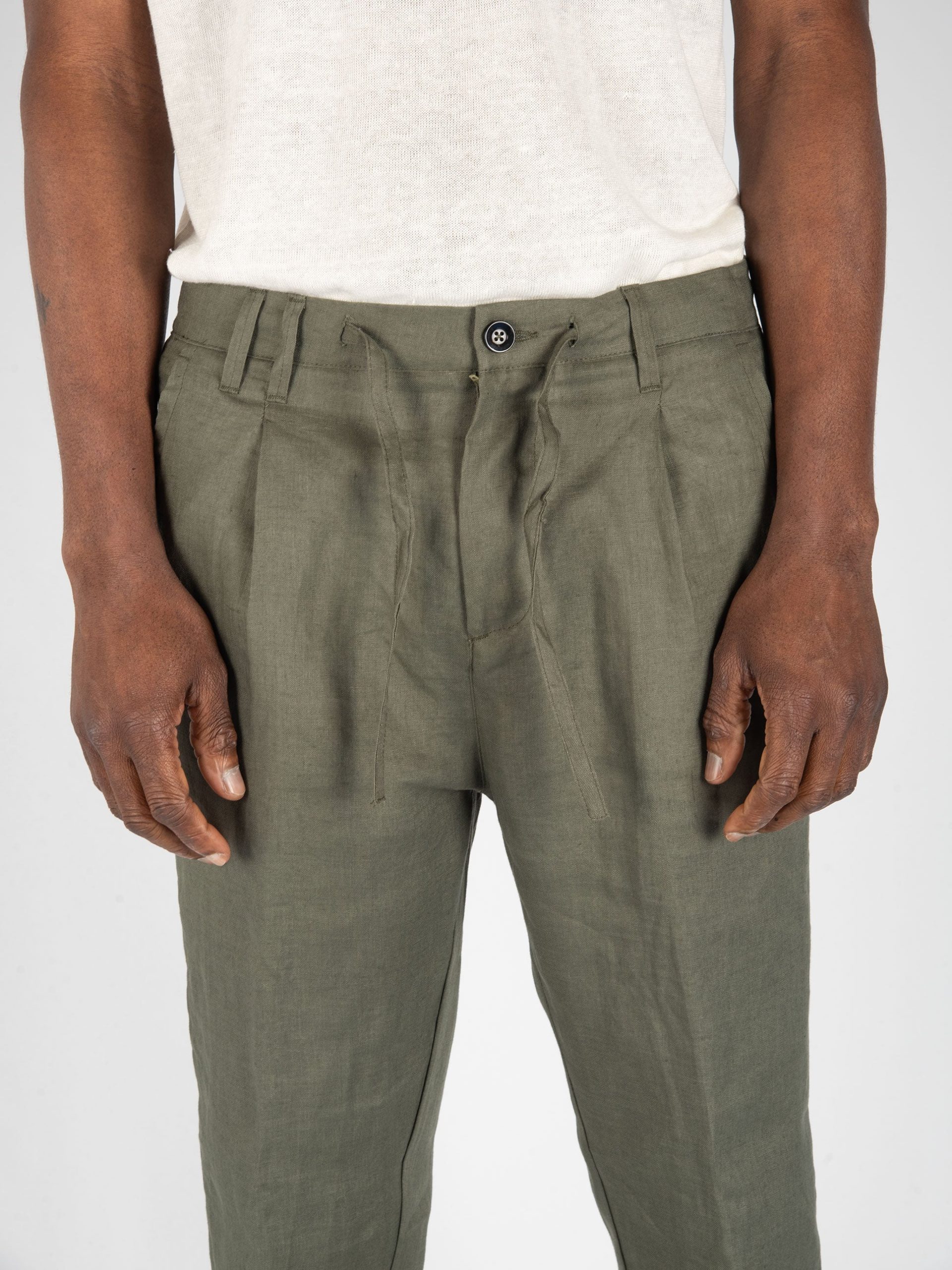 Mod: 0246208723 MILITARE Pantalone con micro pences in Lino. Chiusura ad un bottone con zip e laccetto in vita. Tasche ventre piatto e dietro a soffietto. Vestibilità morbida. Fondo 16 cm con orlo macchina. Composizione 100% lino. Il modello è alto 183cm e pesa 71kg: indossa una taglia 46.