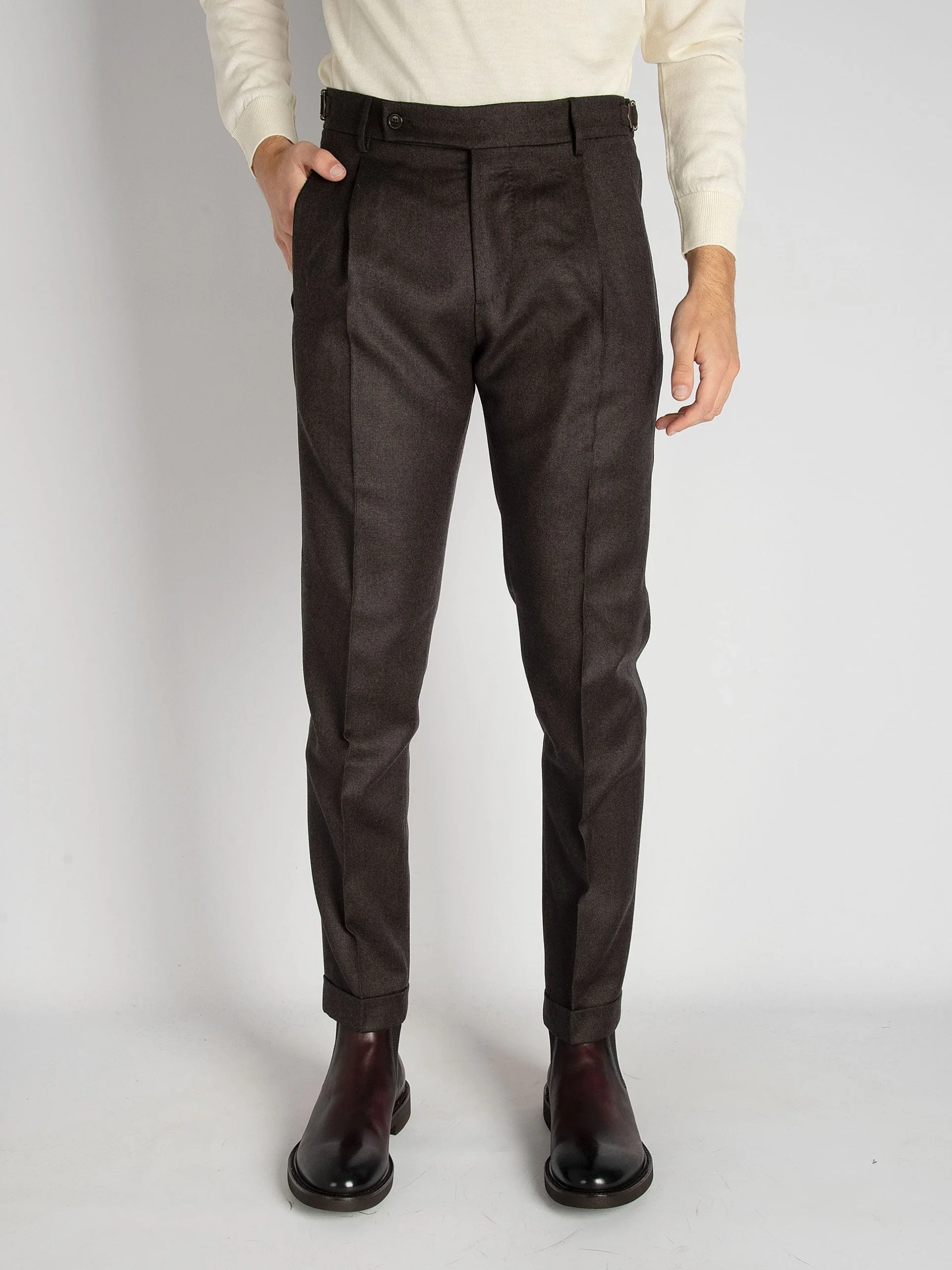Mod: RETRO RO5470 MARRONE Chino sartoriale in 100% lana Vergine. Allacciatura sartoriale con bottoni e zip in metallo. Tasca filo sul fianco, tasche filo con bottone sul retro. In dotazione essenza per profumare il capo. Cinturini sui fianchi per regolare la vita. Orlo con risvolto 4 cm, con possibilità di essere allungato fino a 7 […]