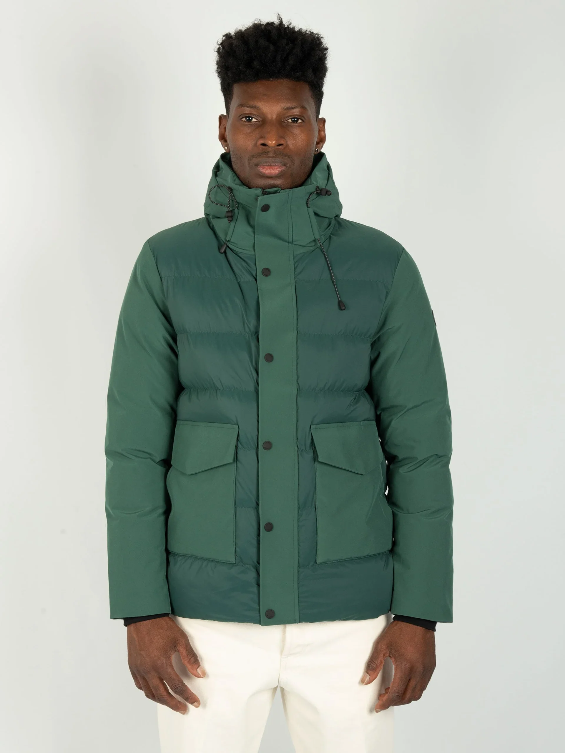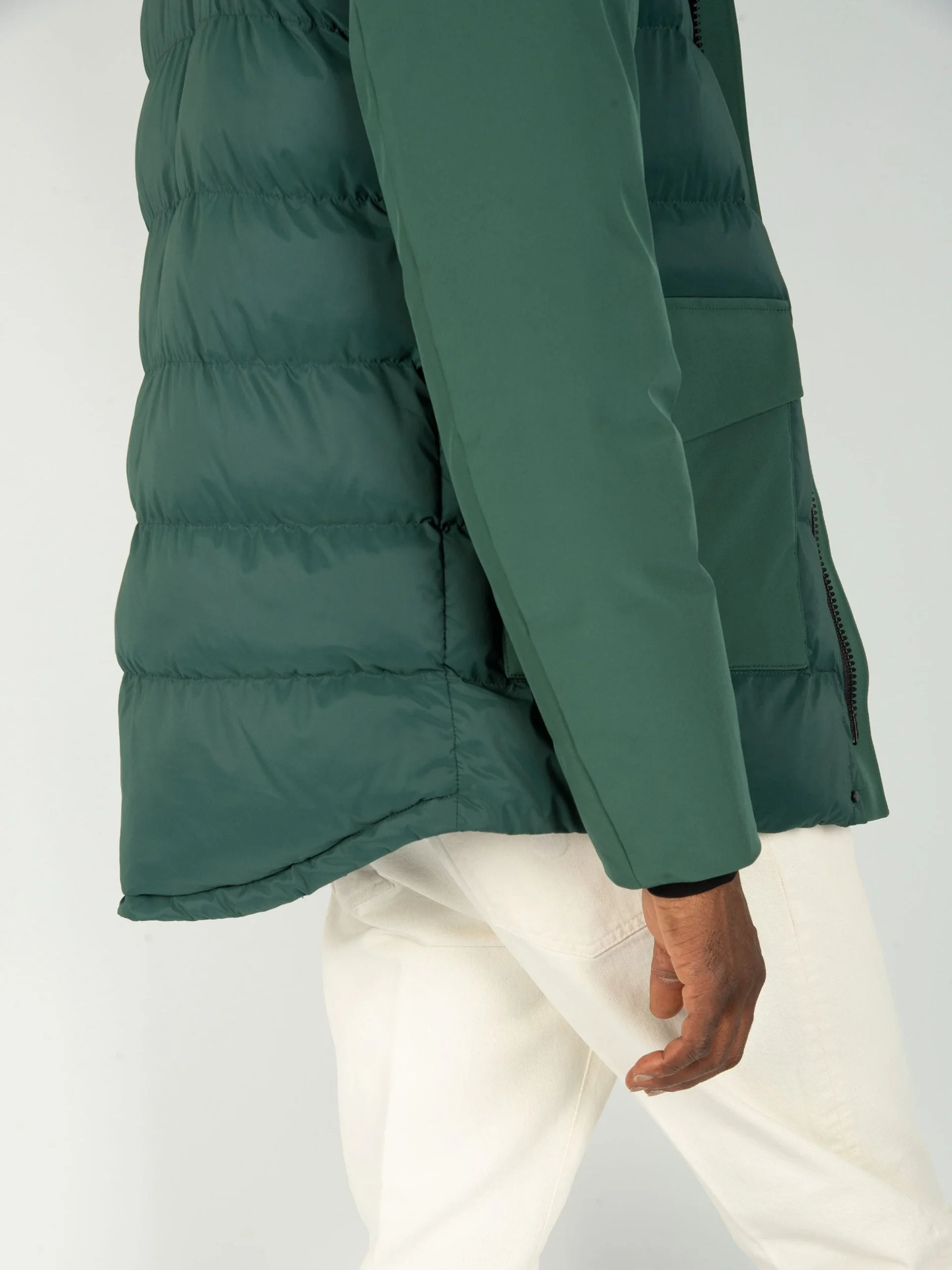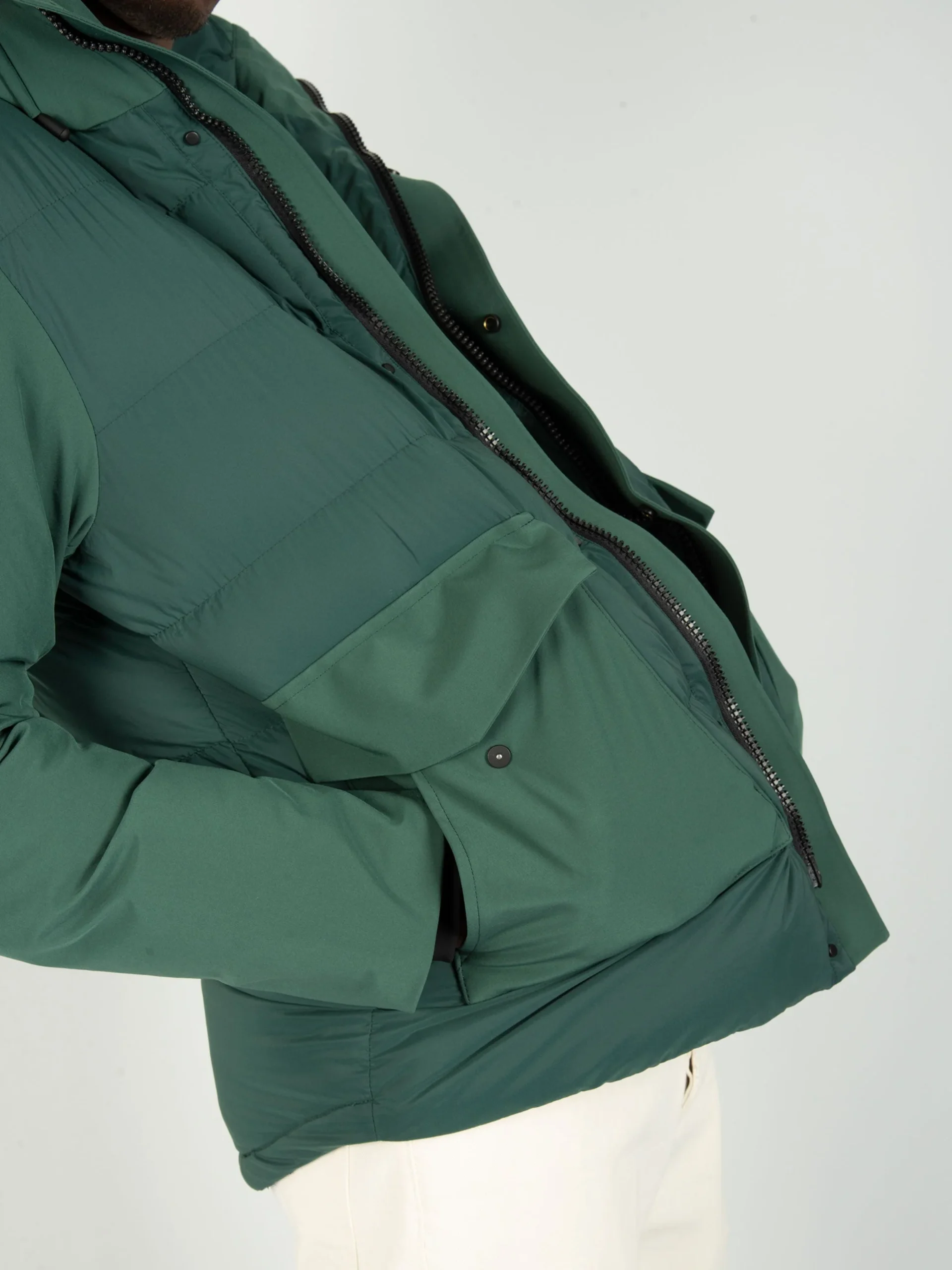 - Piumino in nylon opaco con particolari in tessuto tecnico, imbottitura in materiale tecnico isolante “PRIMALOFT” con cappuccio Japan.