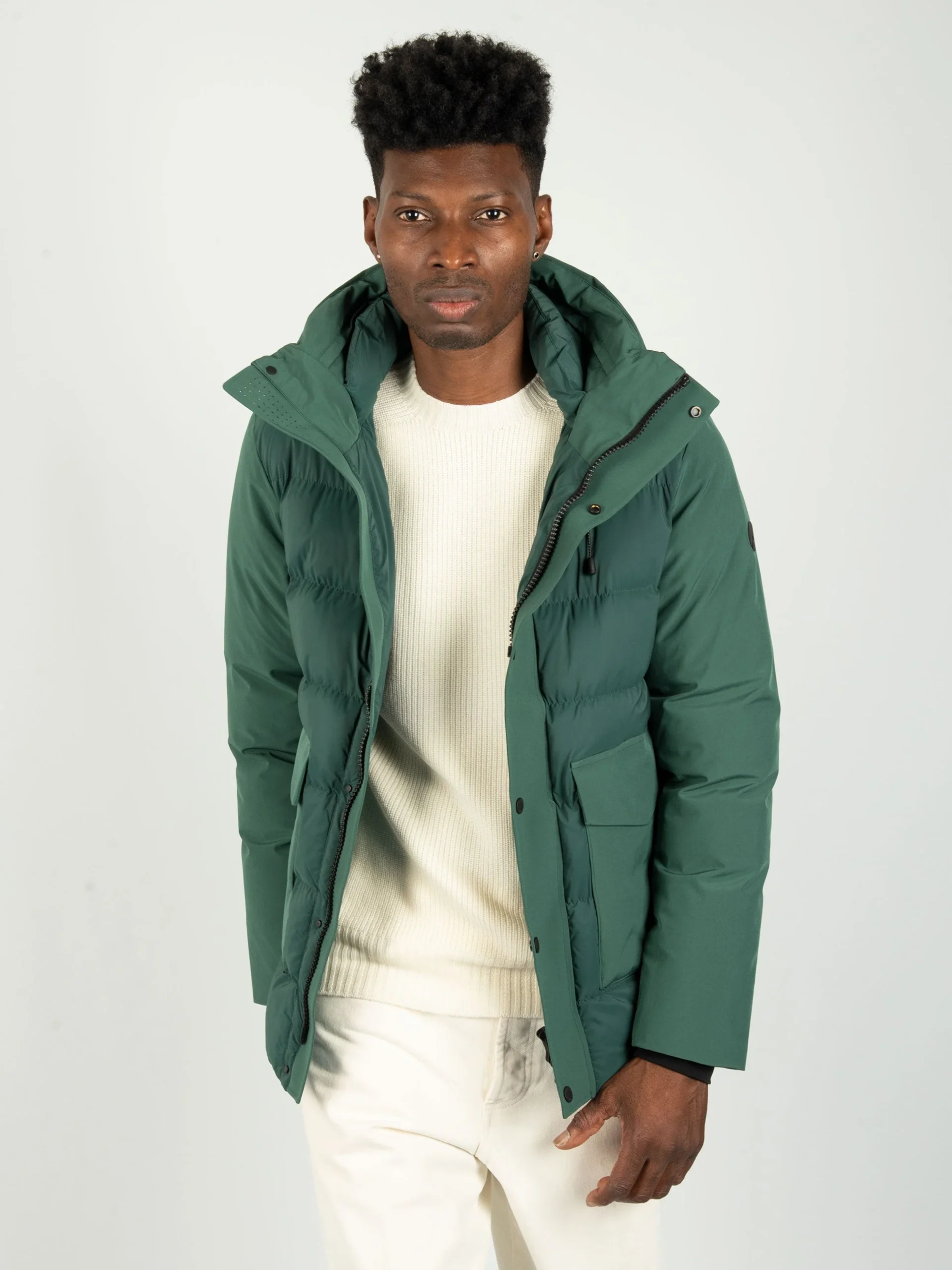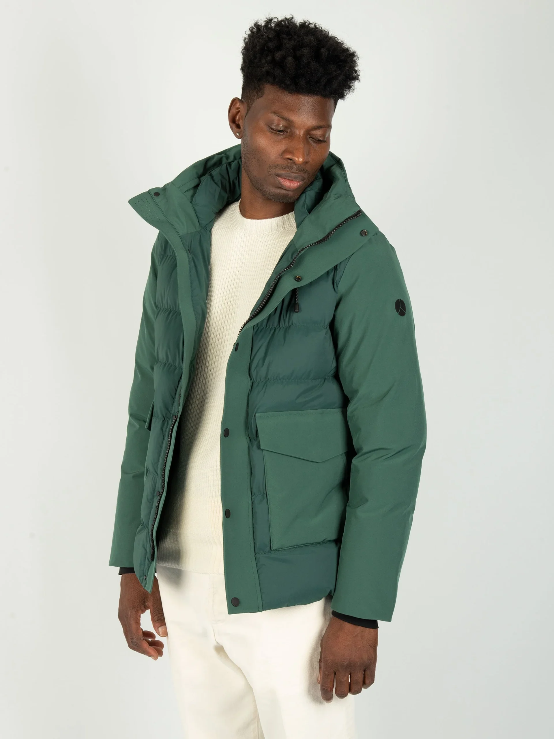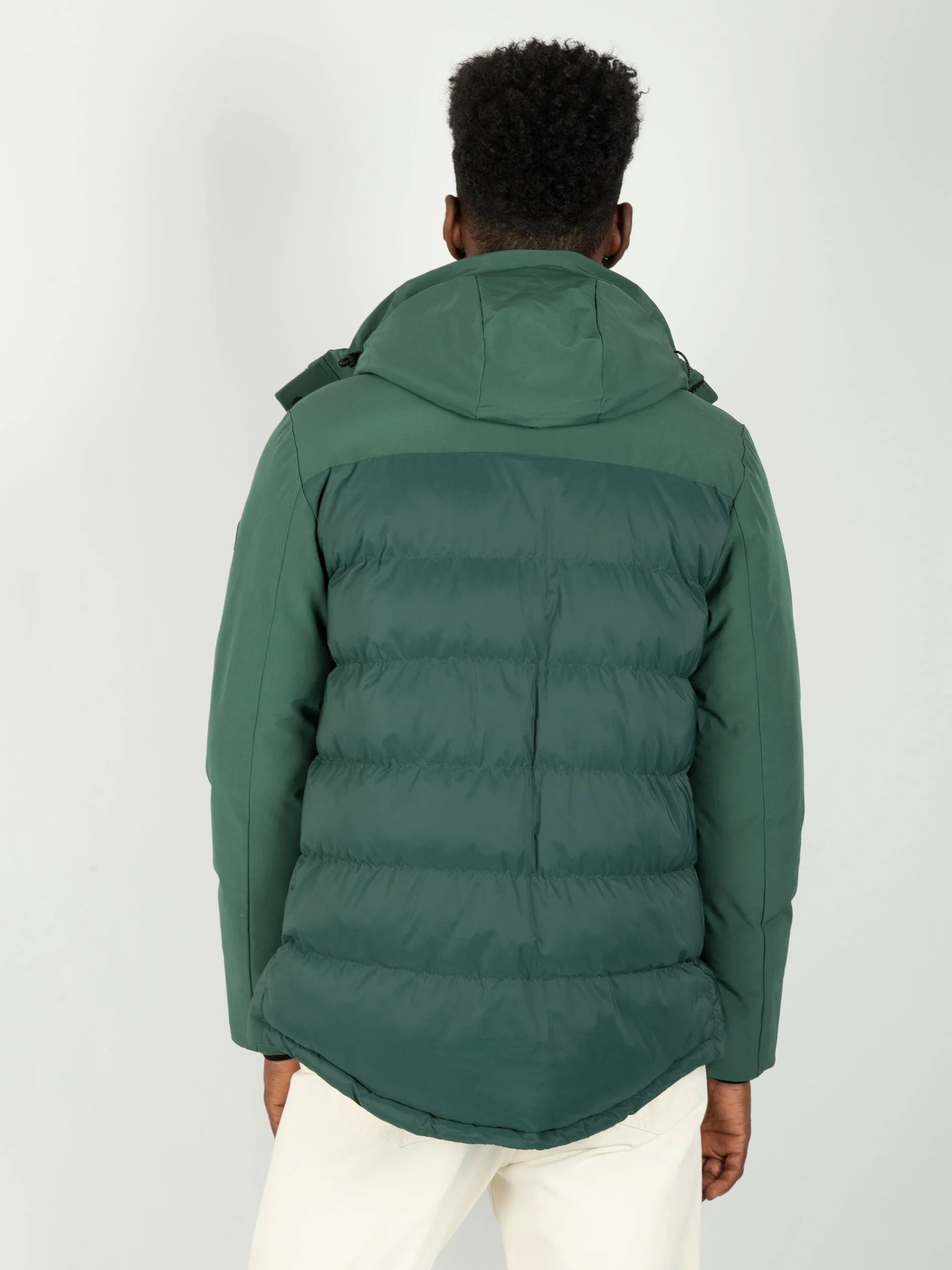 - Piumino in nylon opaco con particolari in tessuto tecnico, imbottitura in materiale tecnico isolante “PRIMALOFT” con cappuccio Japan.