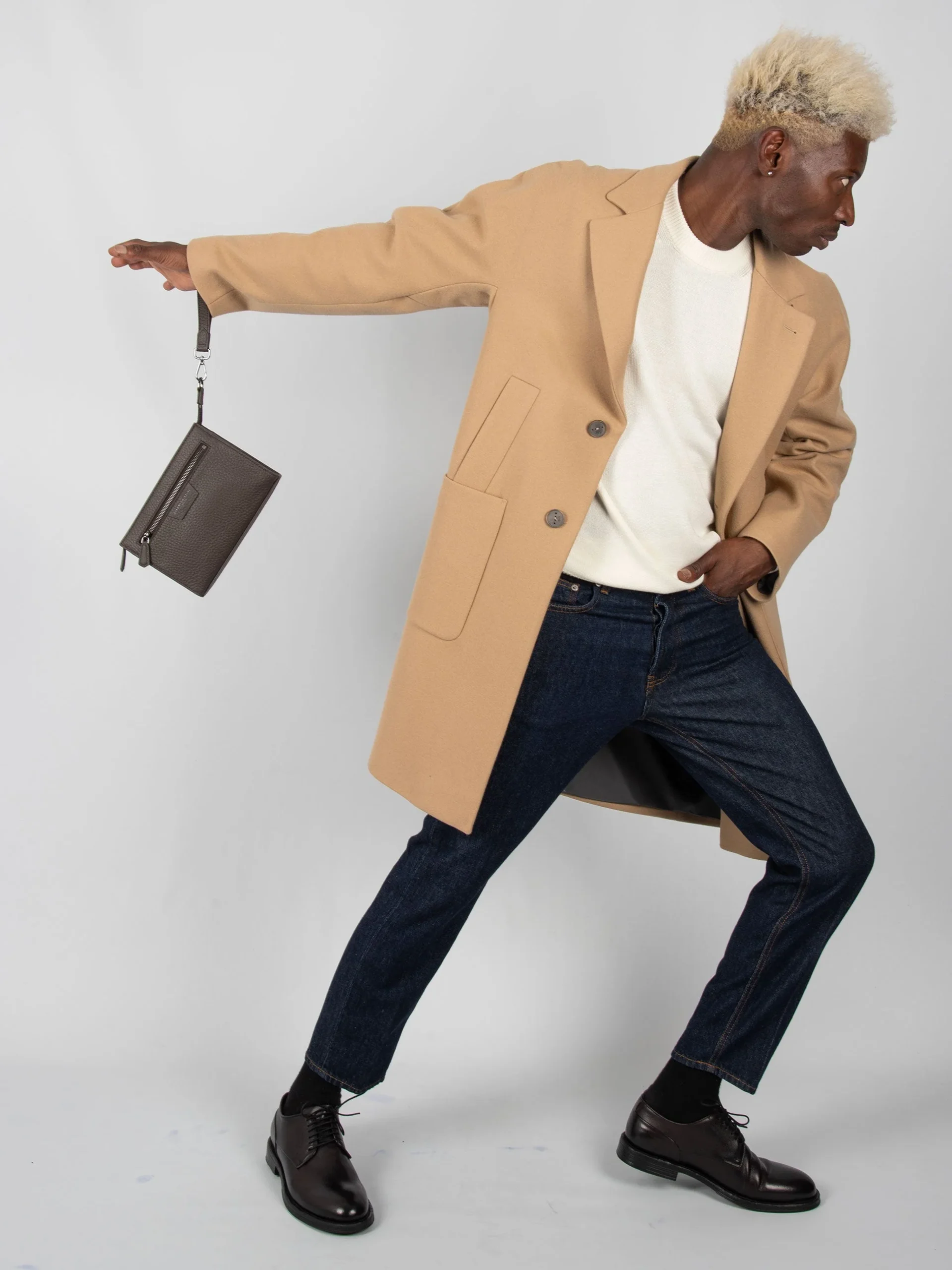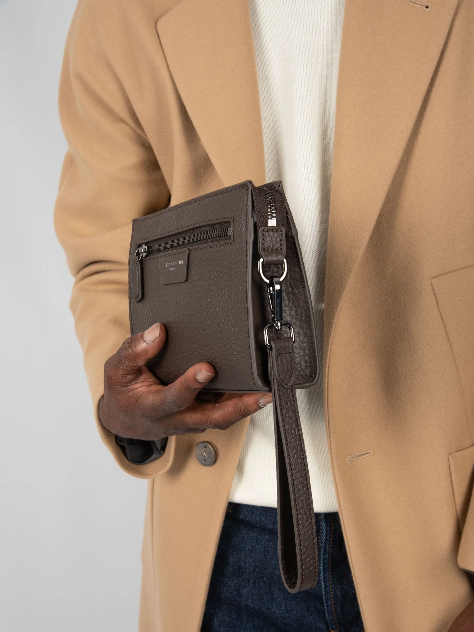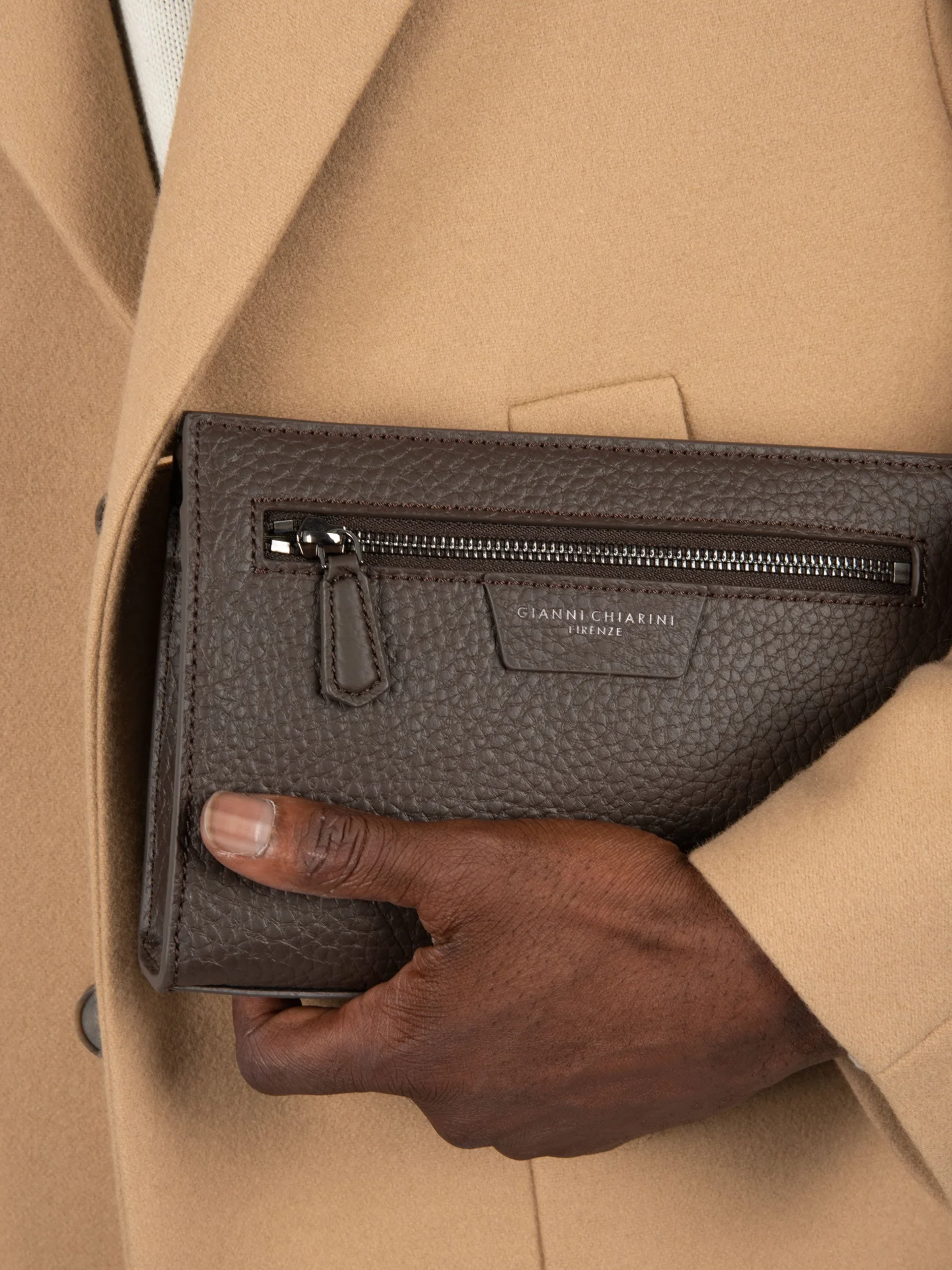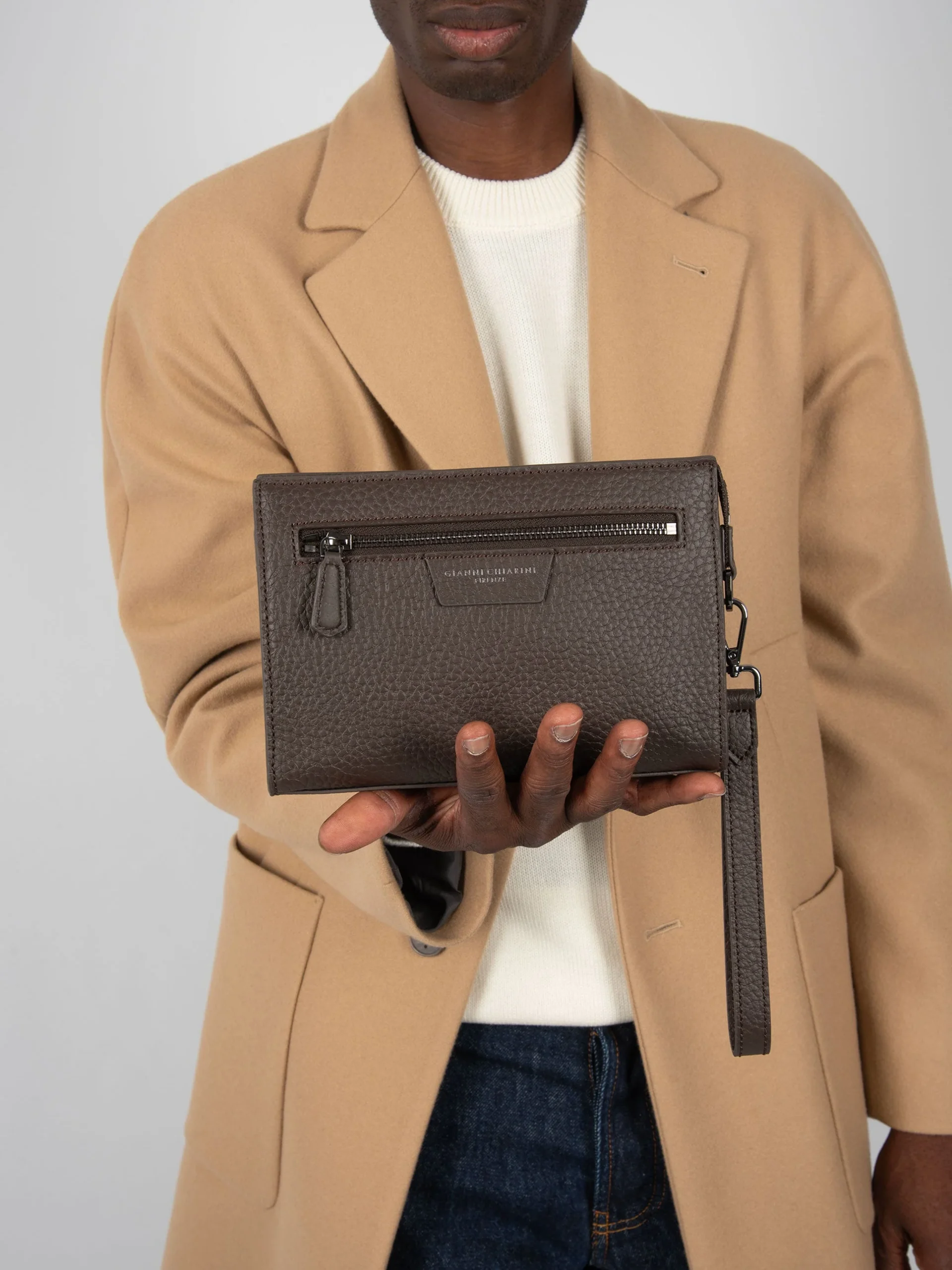 - Pochette in pelle martellata.