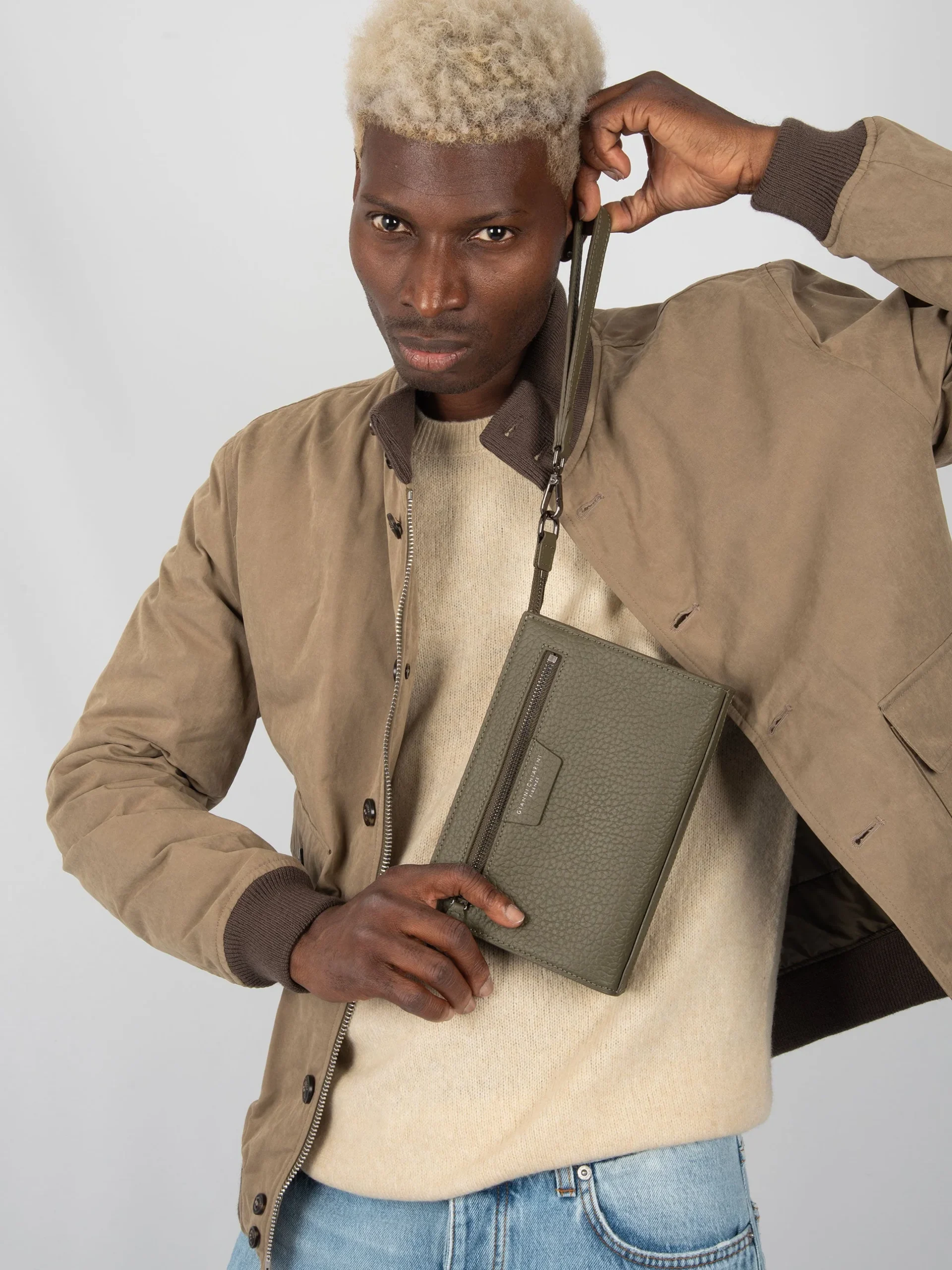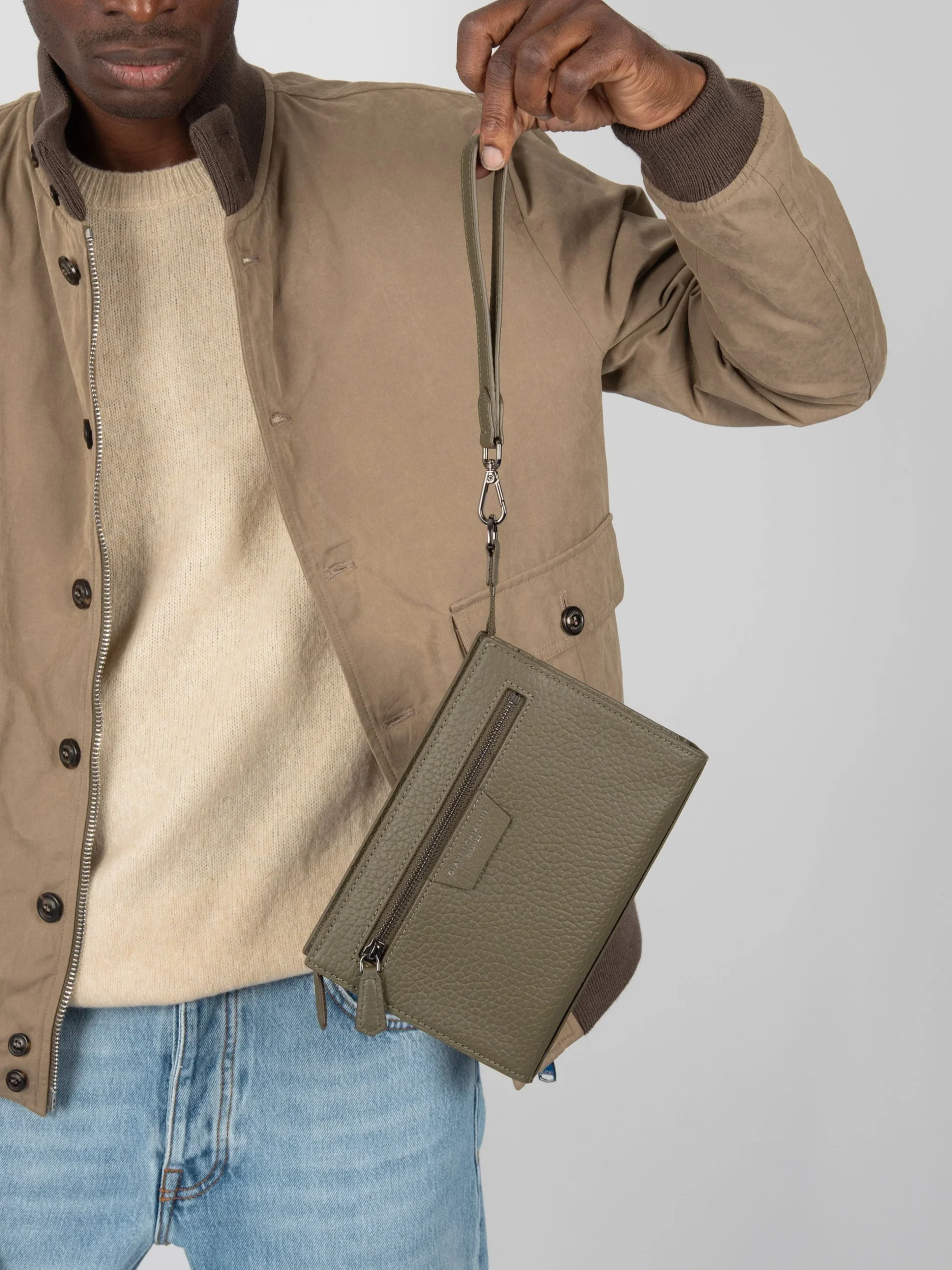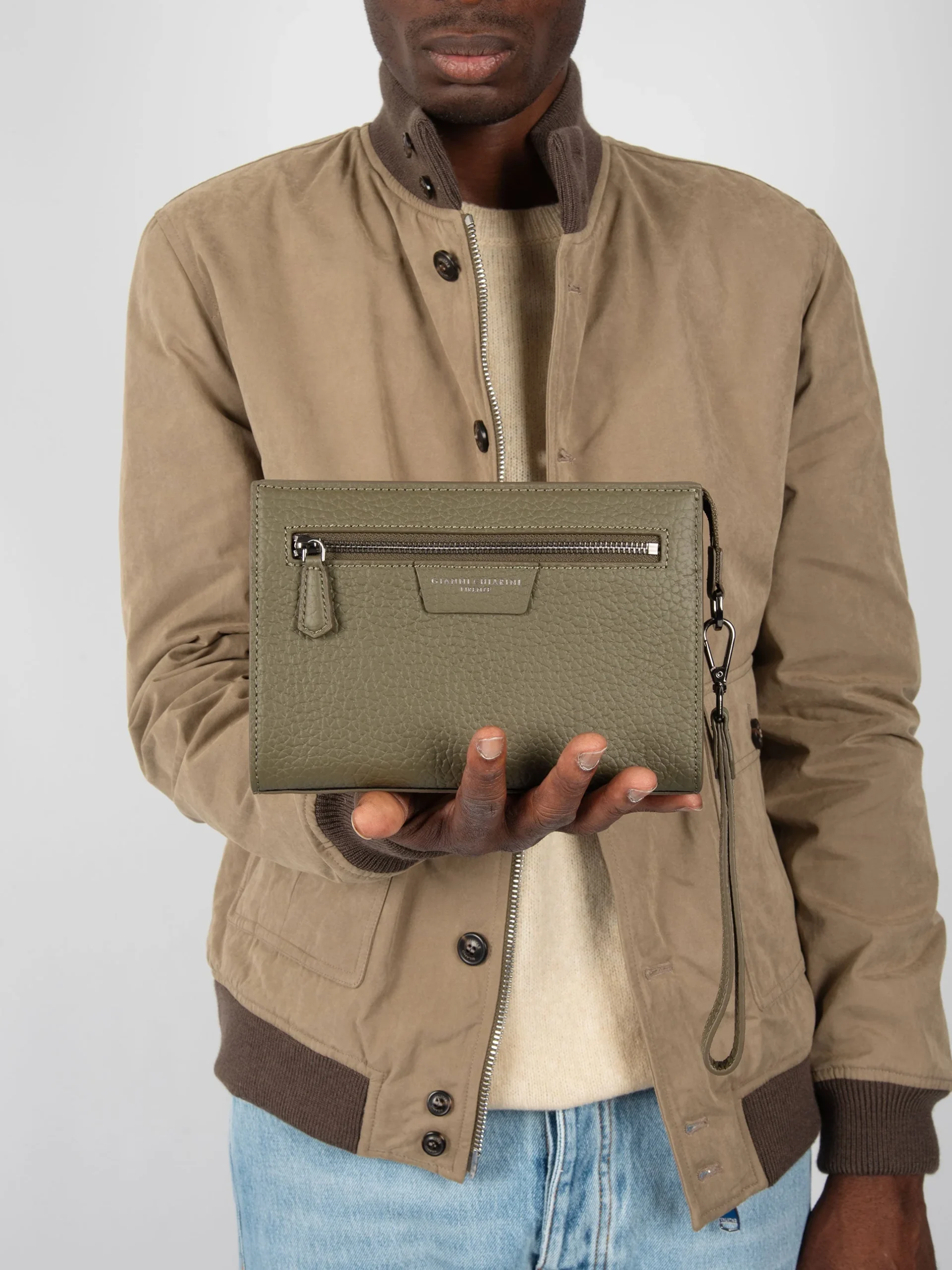 Mod: BSU B18290 QNT OLIVA Pochette in pelle martellata. Chiusura con zip in metallo. Dotata di manico rimovibile. Tirazip in vera pelle. Fodera interna con tasche interne. Made in Italy.