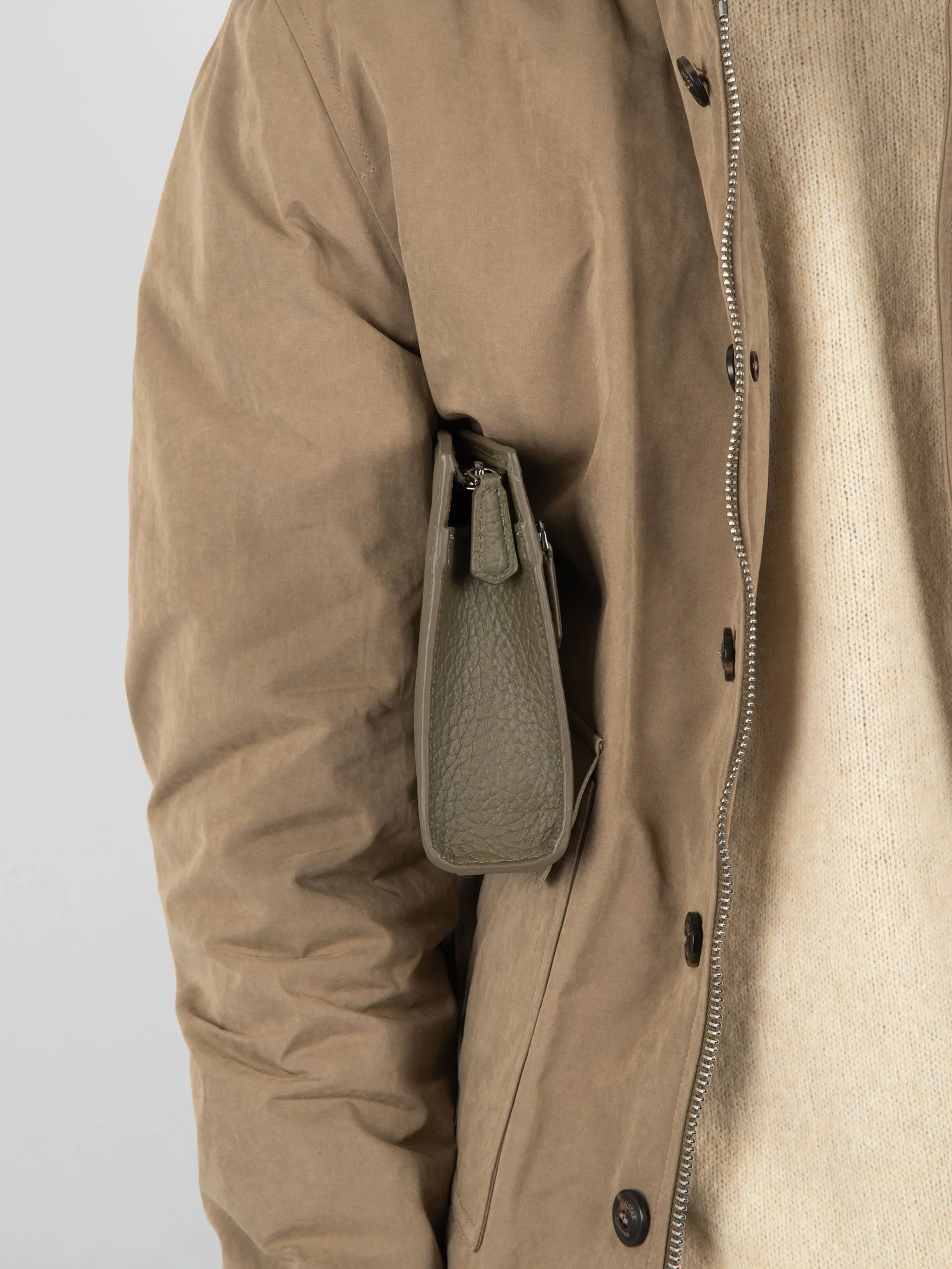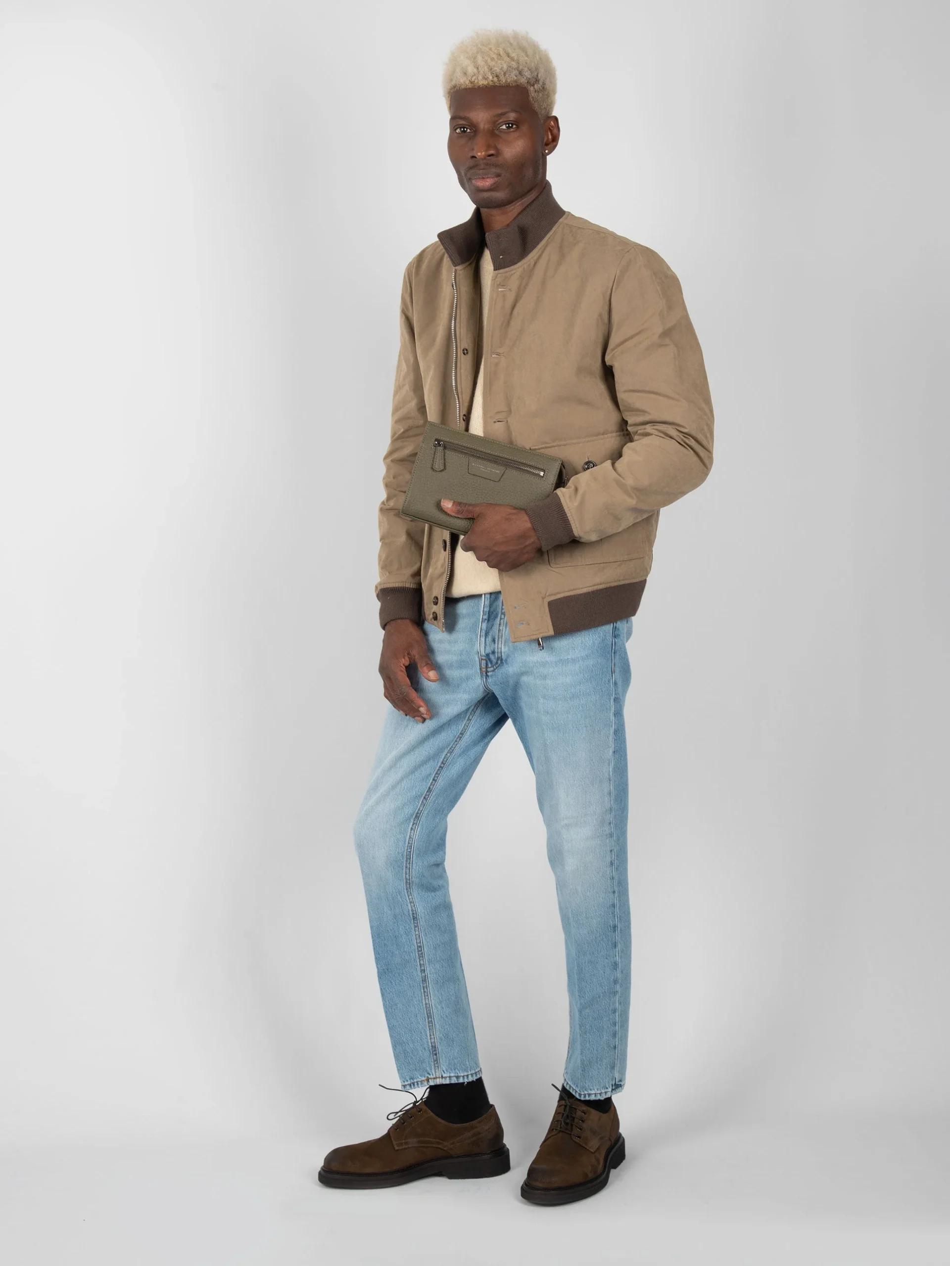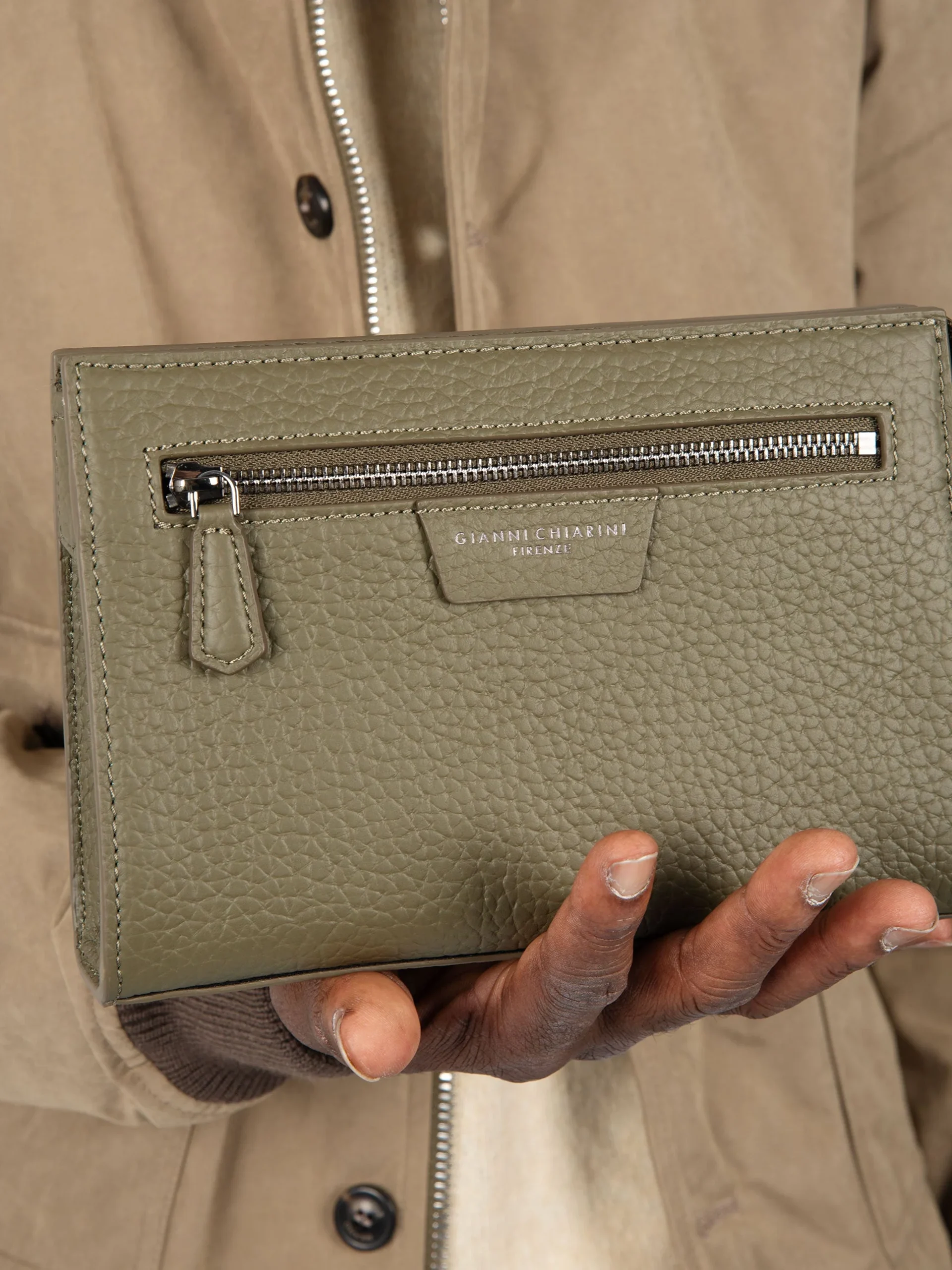 Mod: BSU B18290 QNT OLIVA Pochette in pelle martellata. Chiusura con zip in metallo. Dotata di manico rimovibile. Tirazip in vera pelle. Fodera interna con tasche interne. Made in Italy.