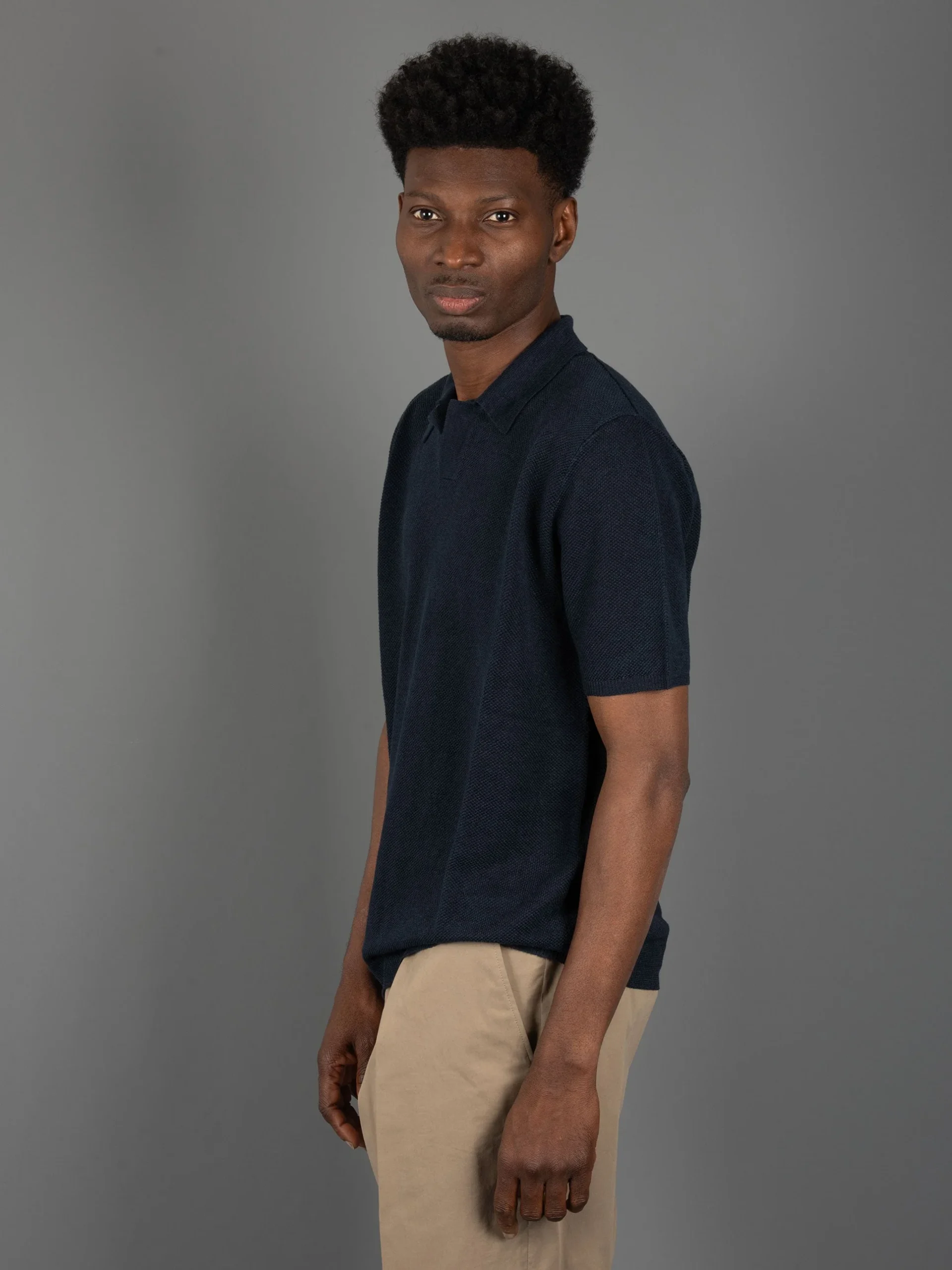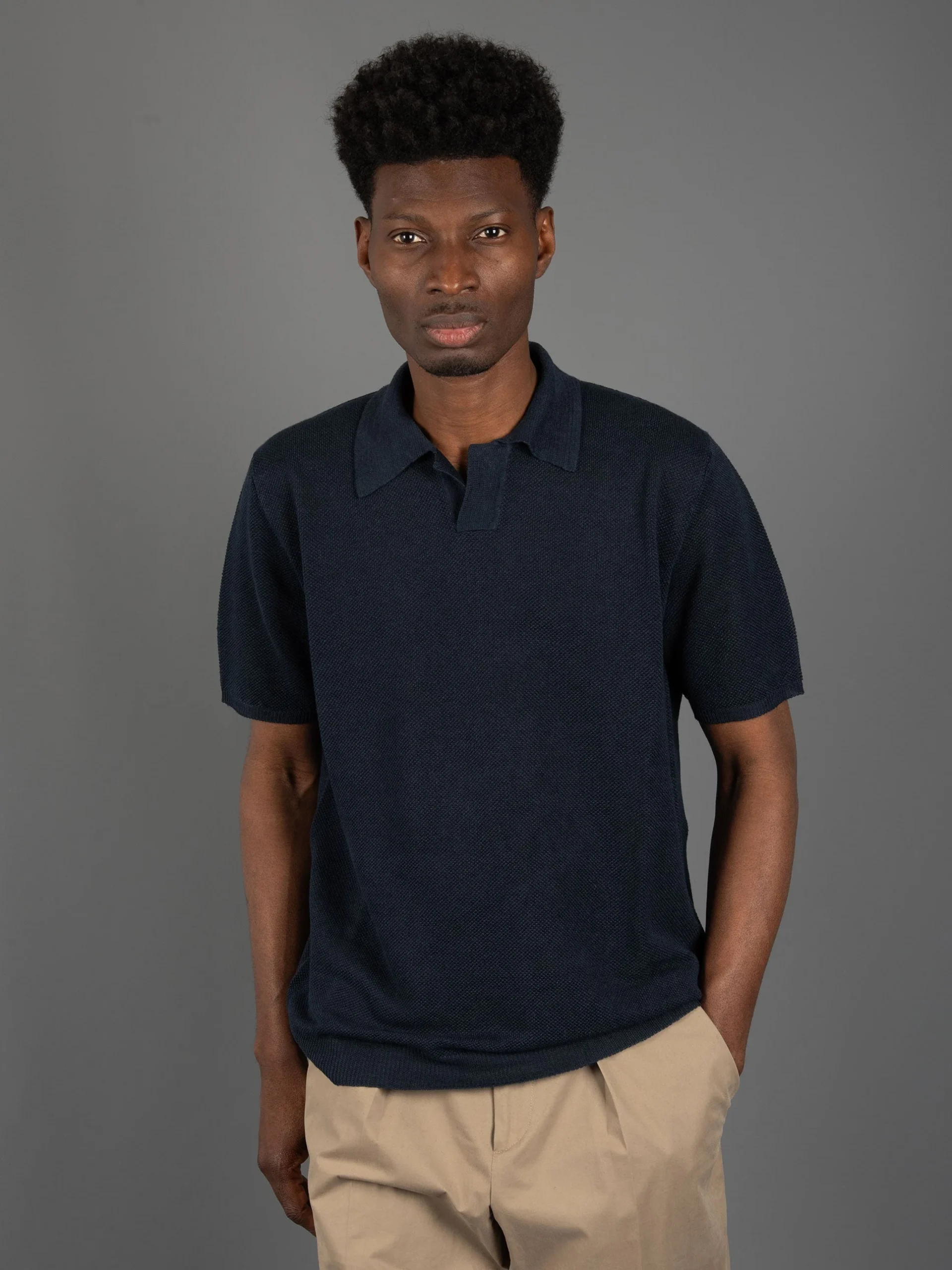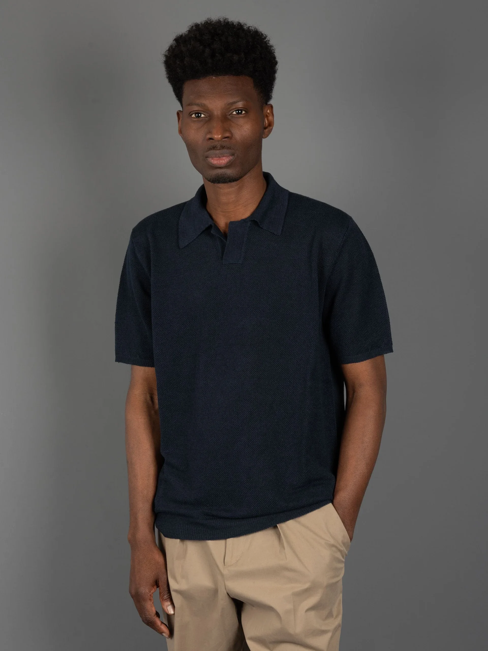 Mod: RB20124 10 NAVY Polo in Piquet di lino. Collo classico polo con scollop a V. Fondo e maniche rifiniti a costine. Composizione: 100% lino. Vestibilità regolare. 100% prodotto in Italia. Il modello è alto 187 cm e pesa 70 kg: indossa una taglia 50.
