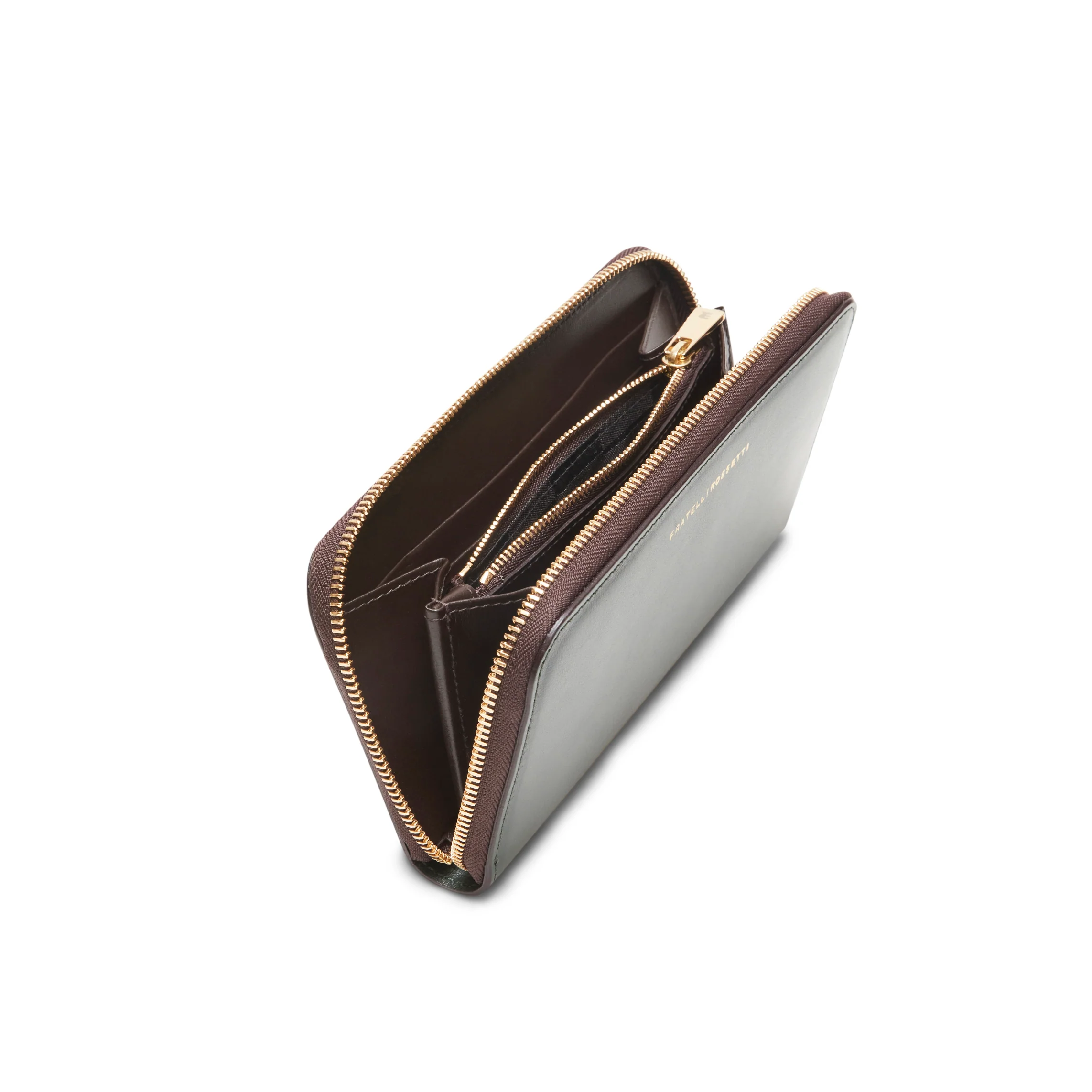 Portafoglio zip around su tre lati realizzato in morbida pelle stampata effetto coccodrillo lucido. Internamente ? suddiviso in due scomparti per banconote, otto fessure per tessere, due tasche piatte e una tasca portamonete centrale con zip. L’interno ?