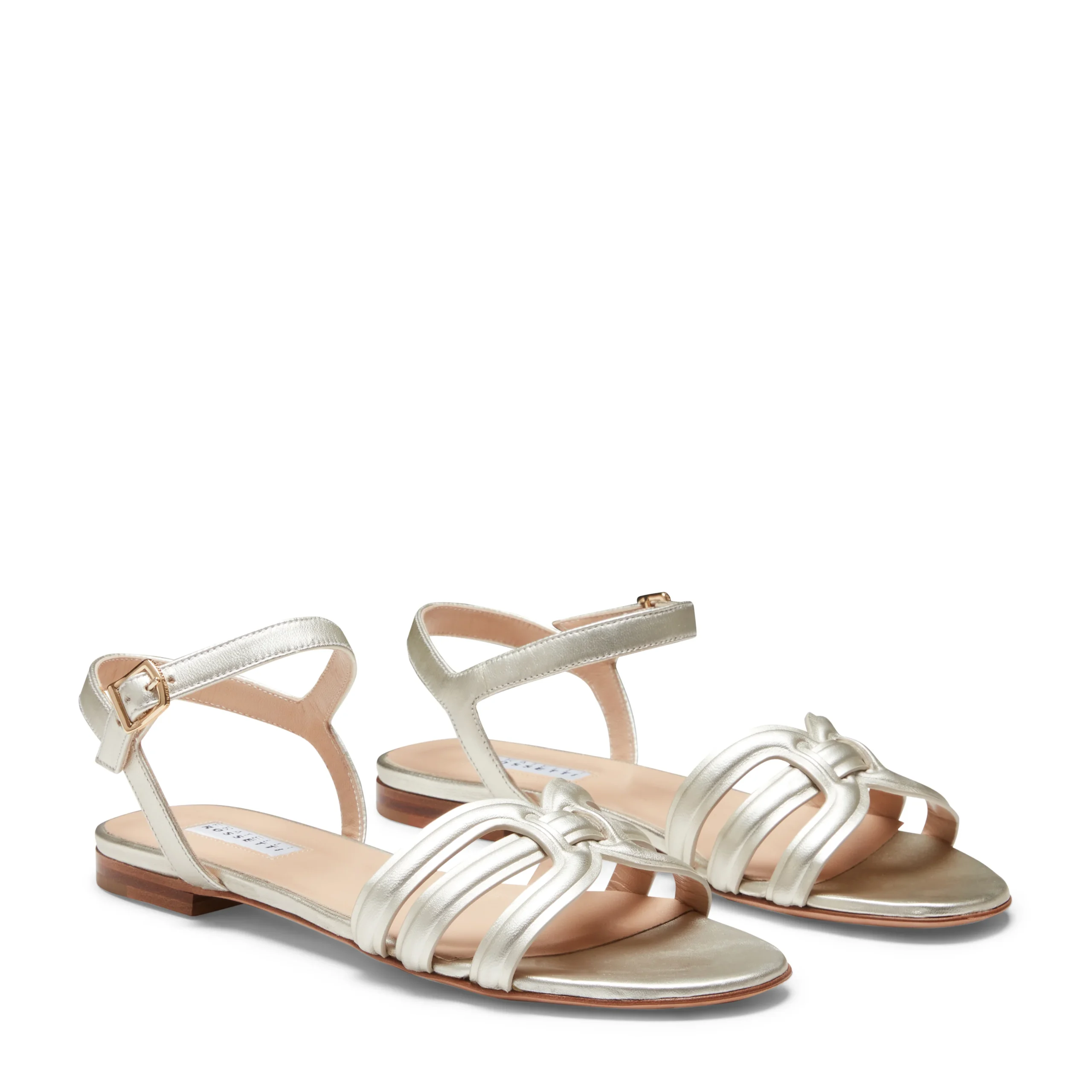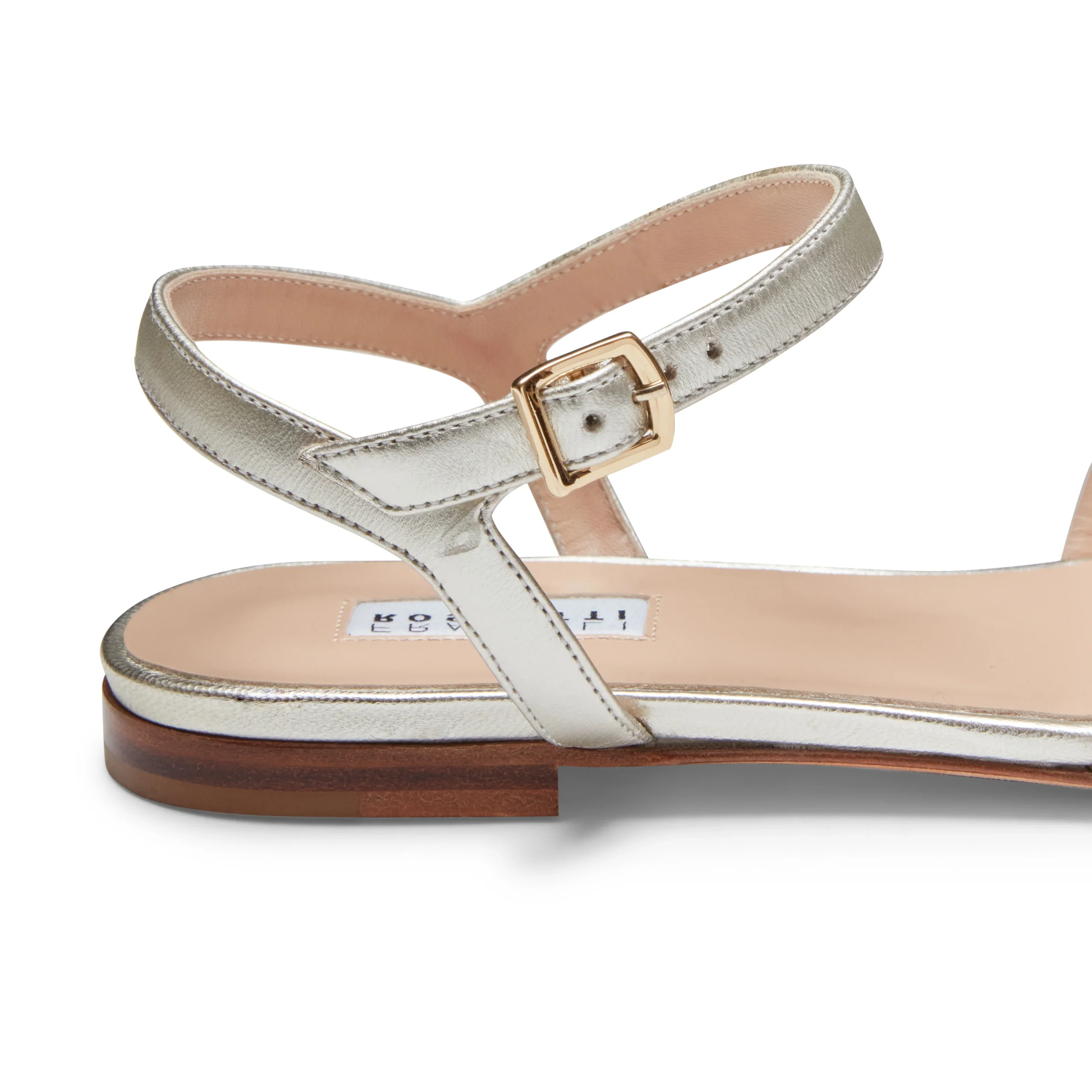 Sandalo flat raffinato e femminile, realizzato in pelle color sabbia con effetto metallizzato. Le sottili fasce avvolgono il piede, valorizzando la silhouette. La tomaia è realizzata con la tecnica innovativa dell’alta frequenza, che consente di unire materiali diversi attraverso giunzioni invisibili e resistenti, senza l’utilizzo di cuciture.Art. 68211