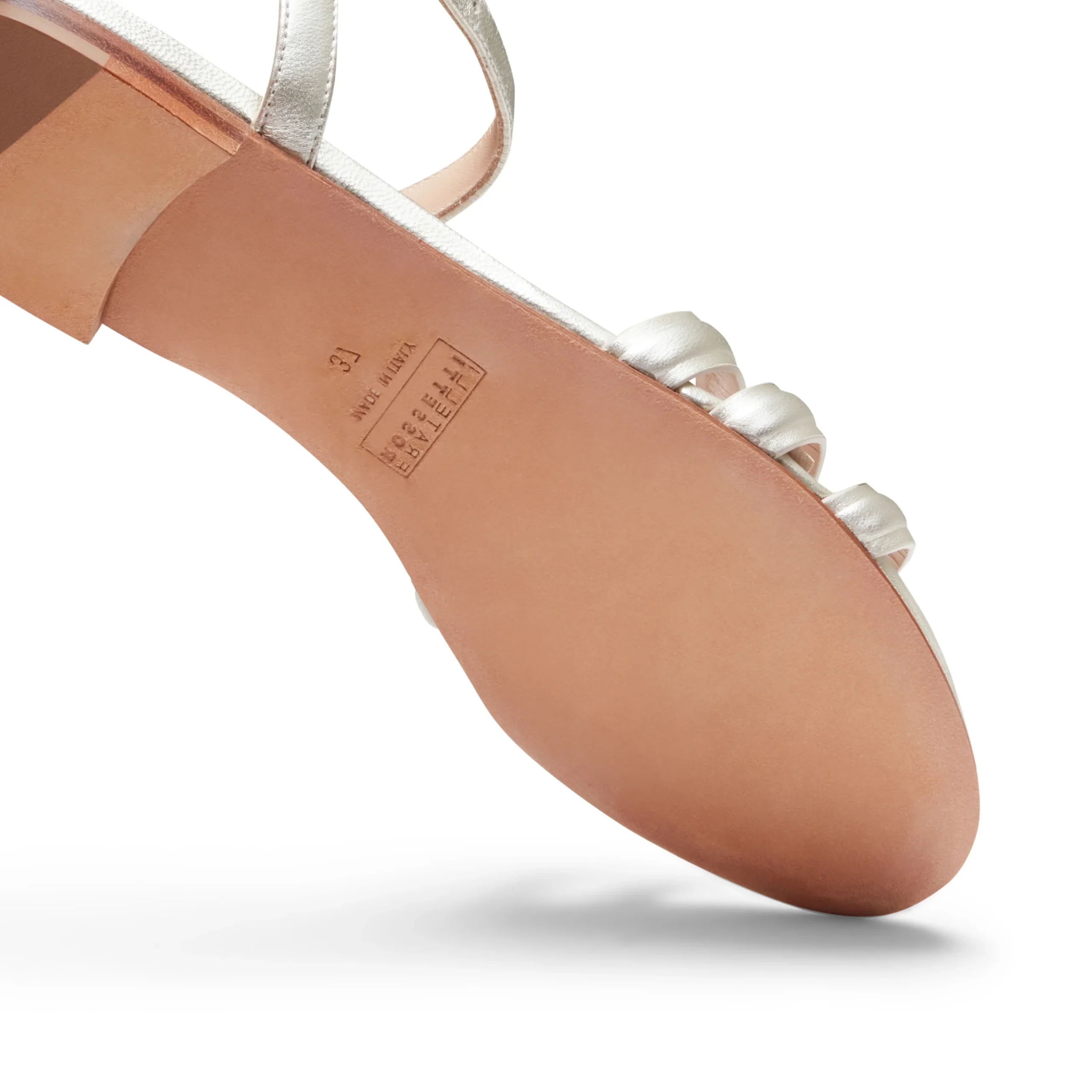 Sandalo flat raffinato e femminile, realizzato in pelle color sabbia con effetto metallizzato. Le sottili fasce avvolgono il piede, valorizzando la silhouette. La tomaia è realizzata con la tecnica innovativa dell’alta frequenza, che consente di unire materiali diversi attraverso giunzioni invisibili e resistenti, senza l’utilizzo di cuciture.