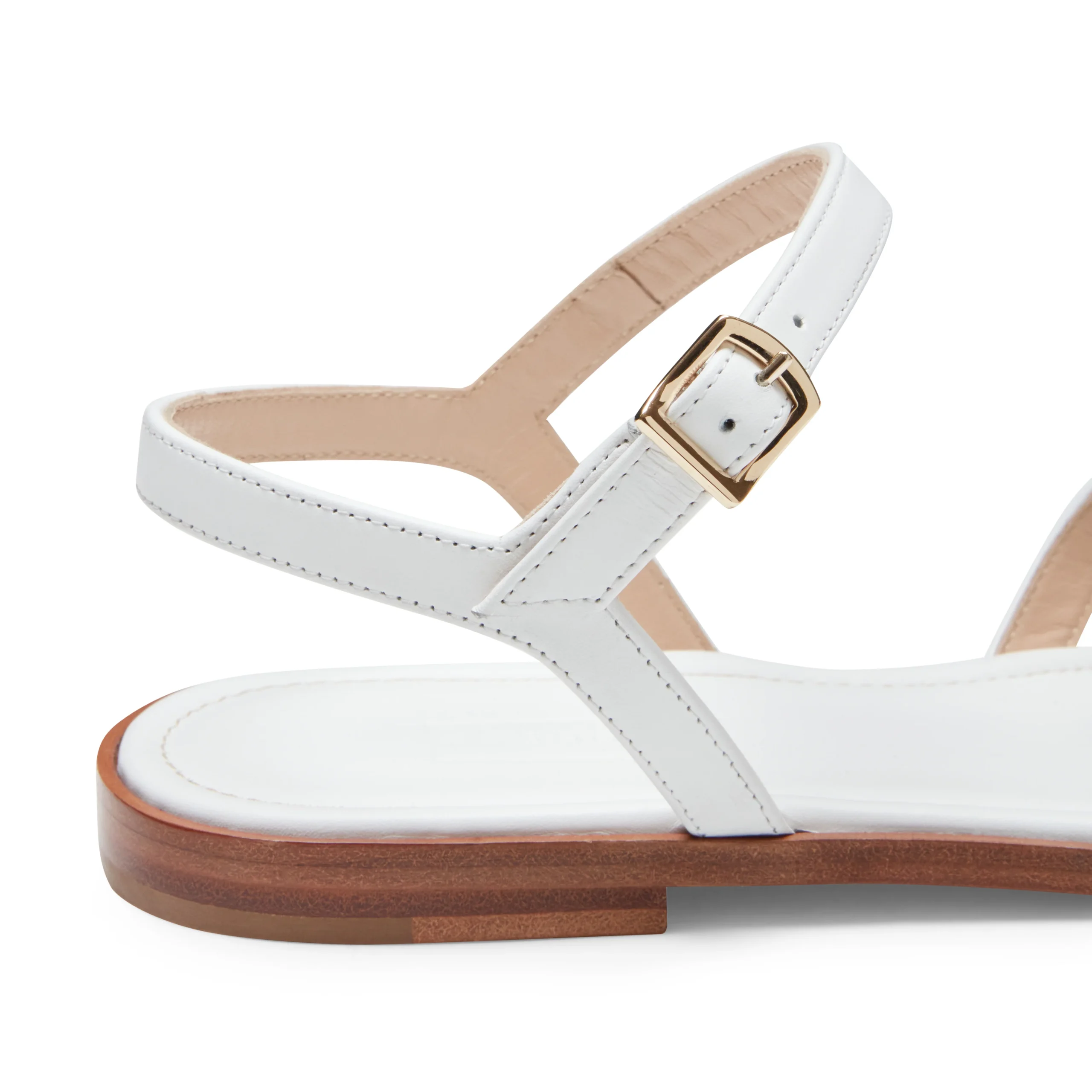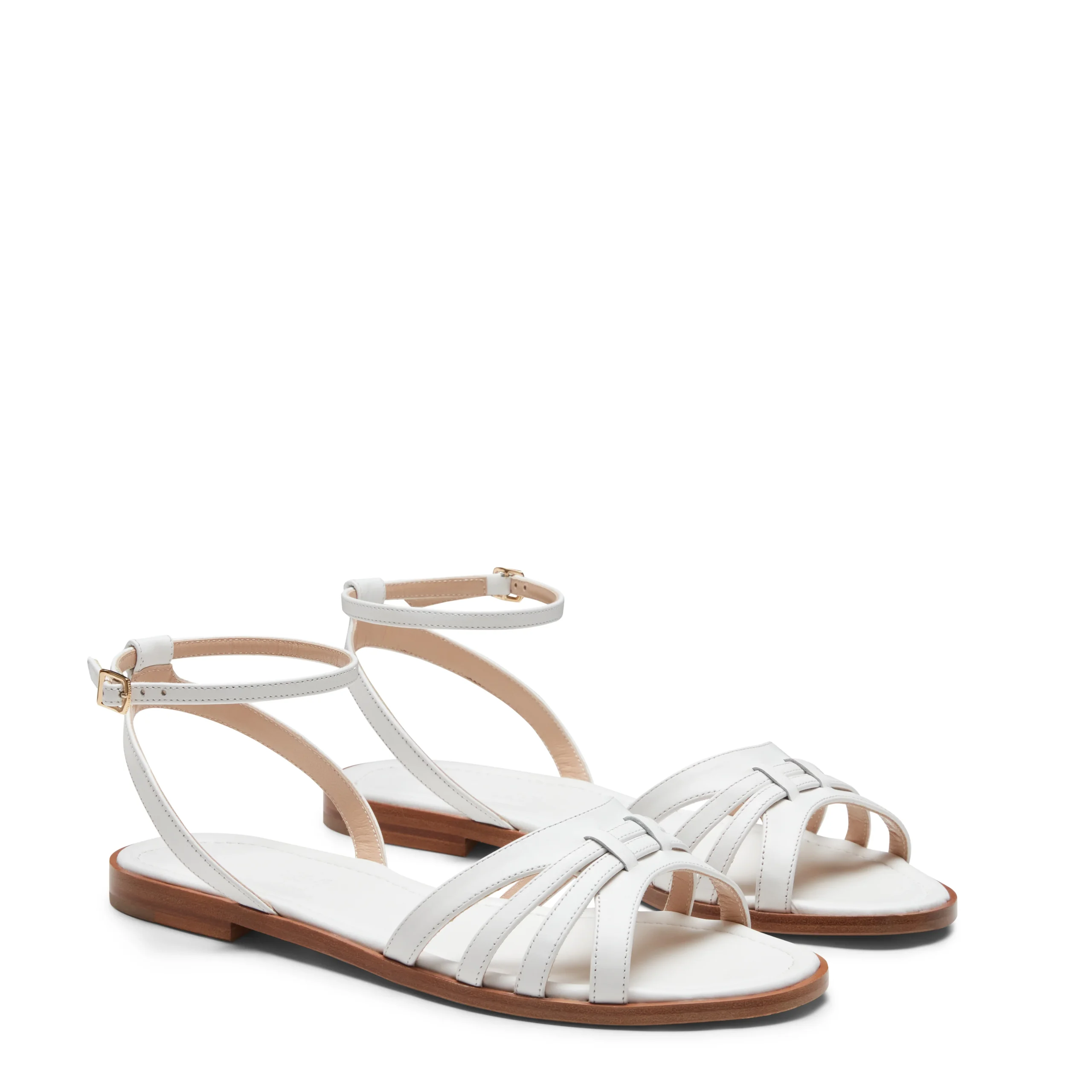 Sandalo flat dallo stile elegante e artigianale realizzato in morbida pelle liscia bianca. Coniuga comfort e raffinatezza. Le fasce intrecciate avvolgono il piede creando motivi geometrici che richiamano l’arte della tessitura. Gli intrecci larghi esaltano un’estetica sofisticata e naturale, perfetta per l’estate.