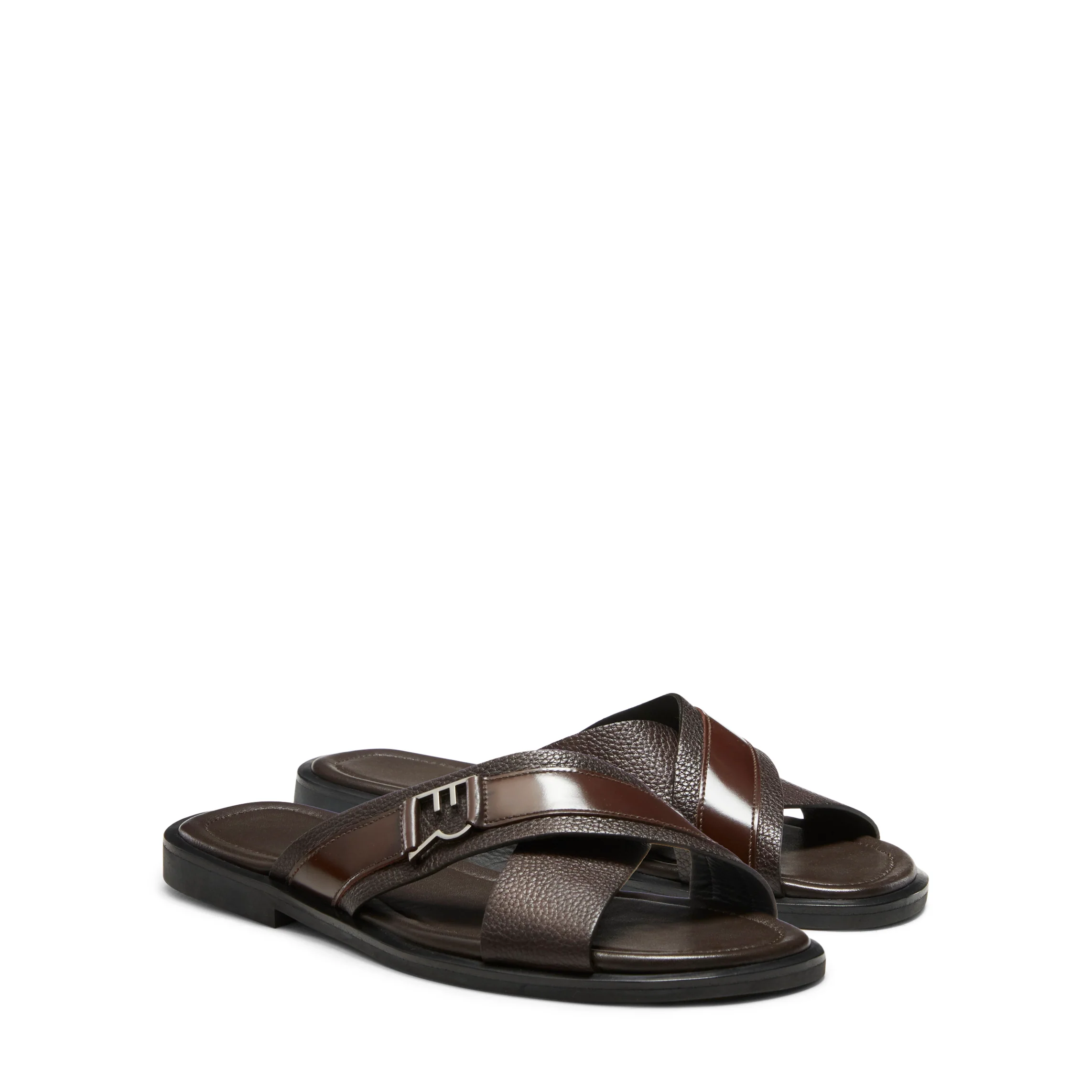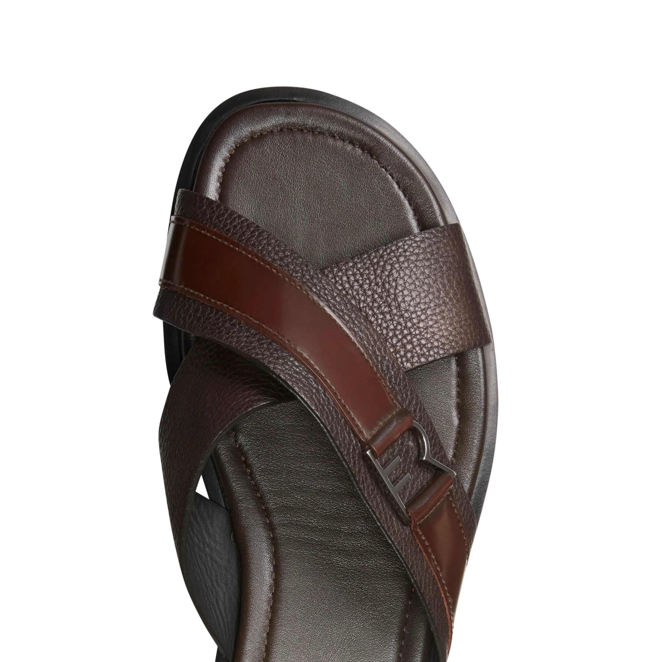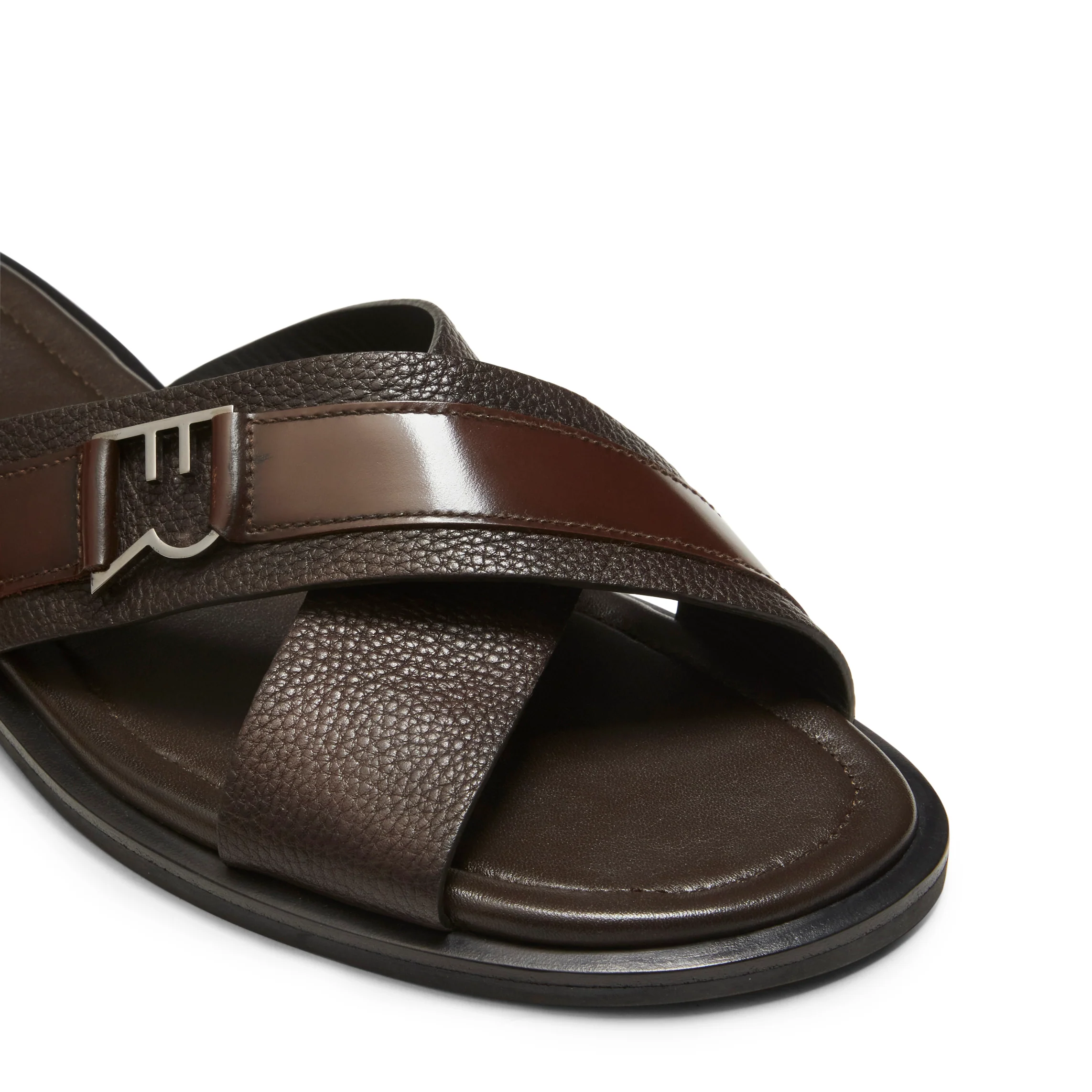 Sandalo dal look disinvolto e ricercato. Realizzato in morbida pelle marrone con grana visibile. Caratterizzato da fasce a taglio vivo, rifinite con lissatura in tono, incrociate e decorate con un inserto in pelle liscia. Perfetto per la stagione estiva.