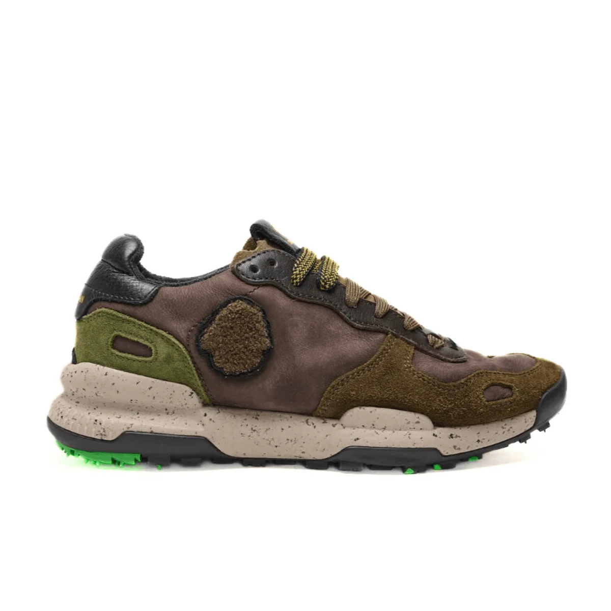 Sneakers da uomo di SATORISAN modello CHACRONA, realizzata in pelle color testa di moro con inserti in camoscio. Interno in tessuto e sottopiede anatomico con suoletta ad alta intensità di comfort, in pelle. Suola in gomma morbida con tappini e superficie del battistrada per una massima presa. Chiusura con laccio. Sneakers ispirata agli anni 80, super confortevole e resistente.