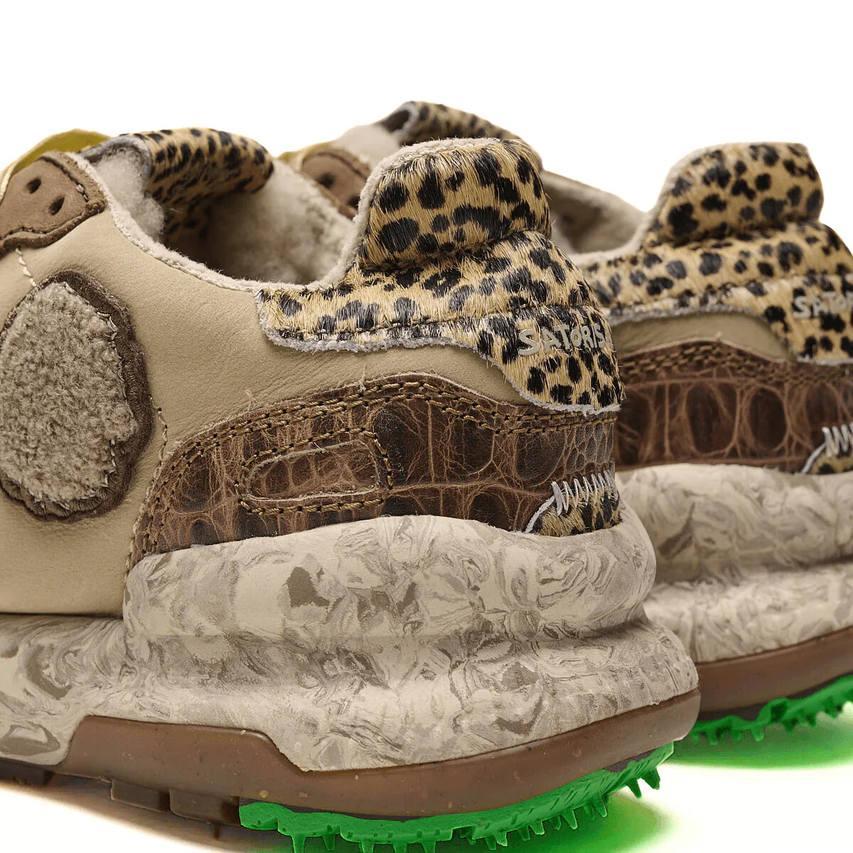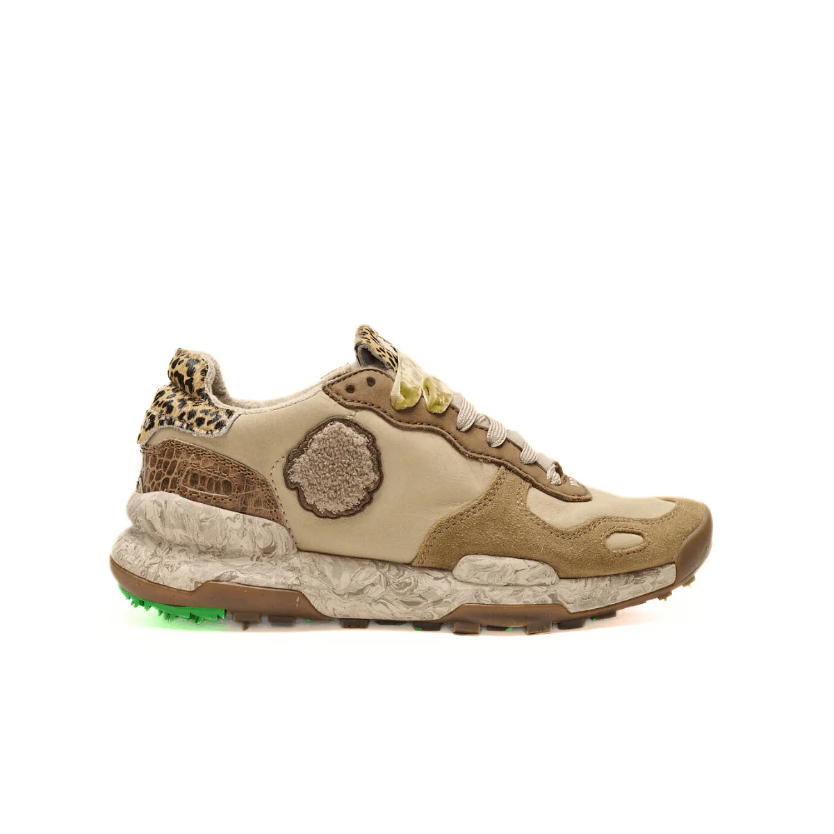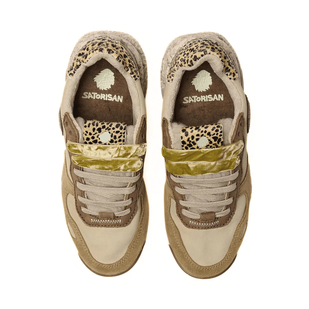 Sneakers da donna di SATORISAN modello CHACRONA, realizzata in pelle beige con inserti in camoscio e pelle e inserto in cavallino stampa leopardo sul tallone. Interno in tessuto e sottopiede estraibile. Suola in gomma morbida con tappini e superficie del battistrada per una massima presa. Sneakers ispirata agli anni 80, super confortevole e resistente.