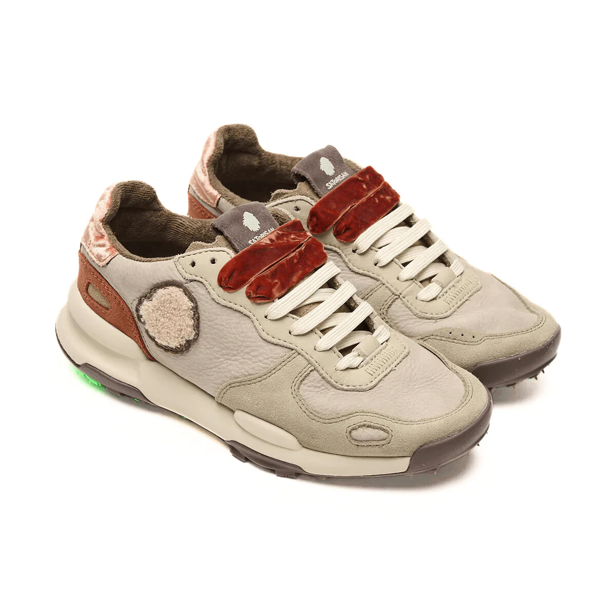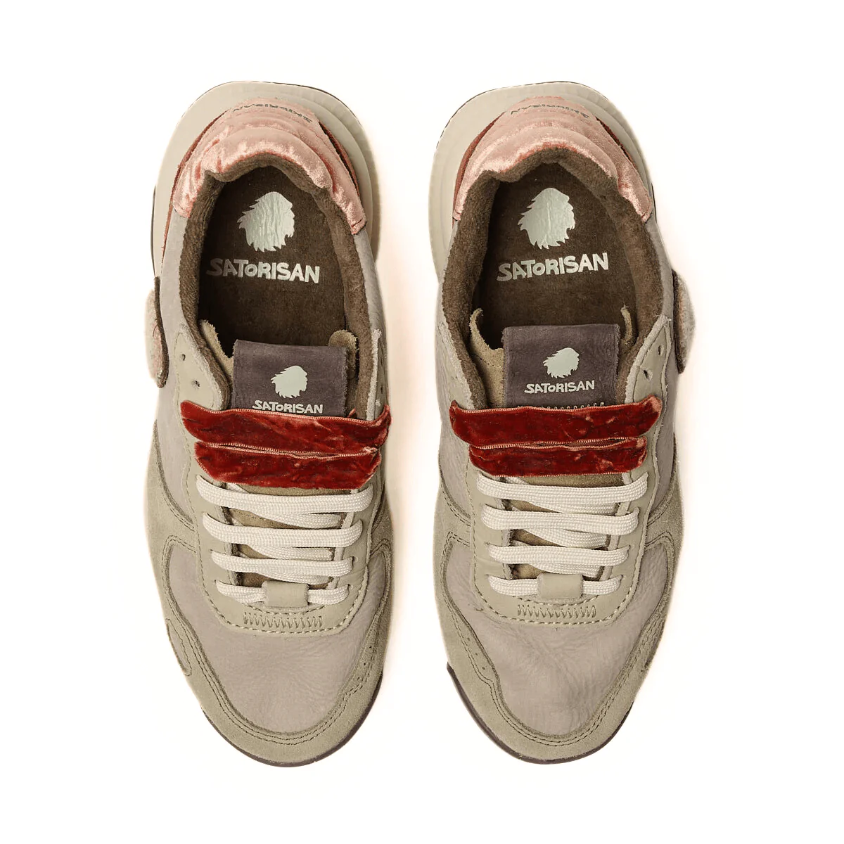 Sneakers da donna di SATORISAN modello CHACRONA, realizzata in pelle color taupe con inserti in camoscio e inserto in velluto rosso sul tallone. Interno in tessuto morbido e sottopiede anatomico con suoletta ad alta intensità di comfort. Suola in gomma morbida con tappini e superficie del battistrada per una massima presa. Sneakers ispirata agli anni 80, super confortevole e resistente.