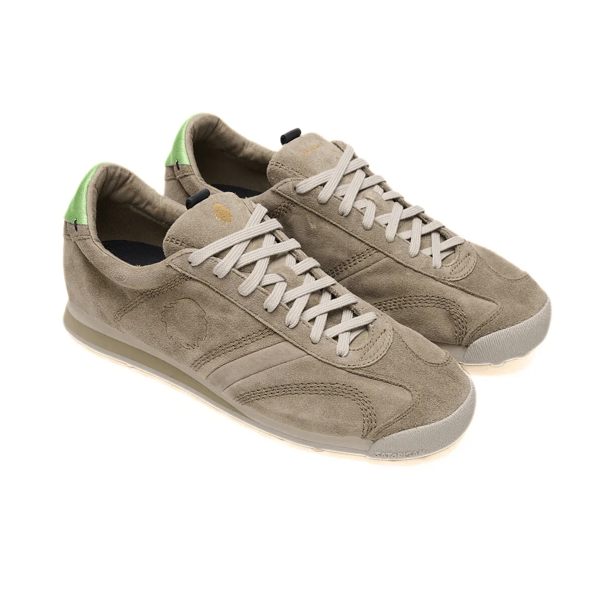Sneakers da uomo di SATORISAN modello STARDUST, realizzata in pelle scamosciata beige con inserti in pelle verde. Interno in tessuto e sottopiede estraibile. Suola in gomma morbida con tappini e superficie del battistrada per una massima presa.