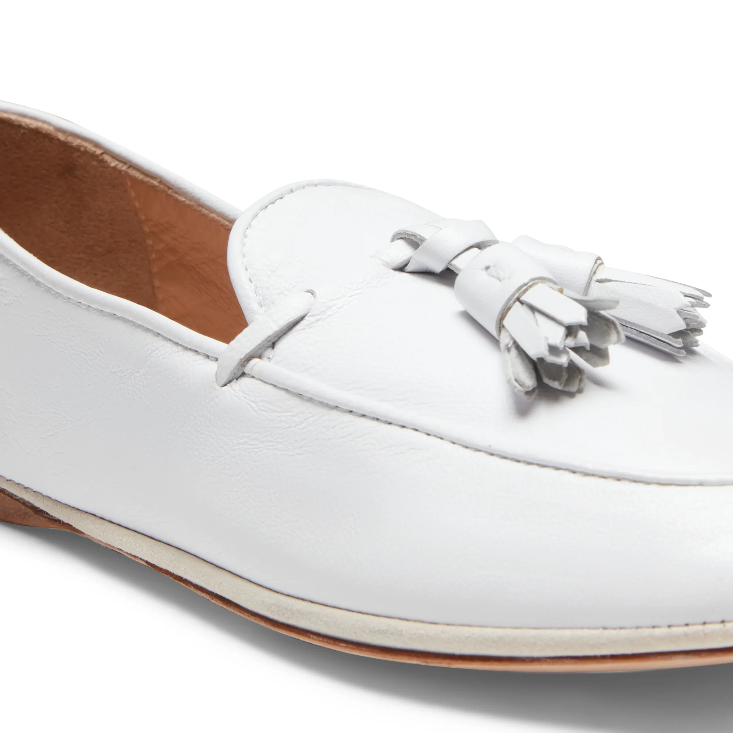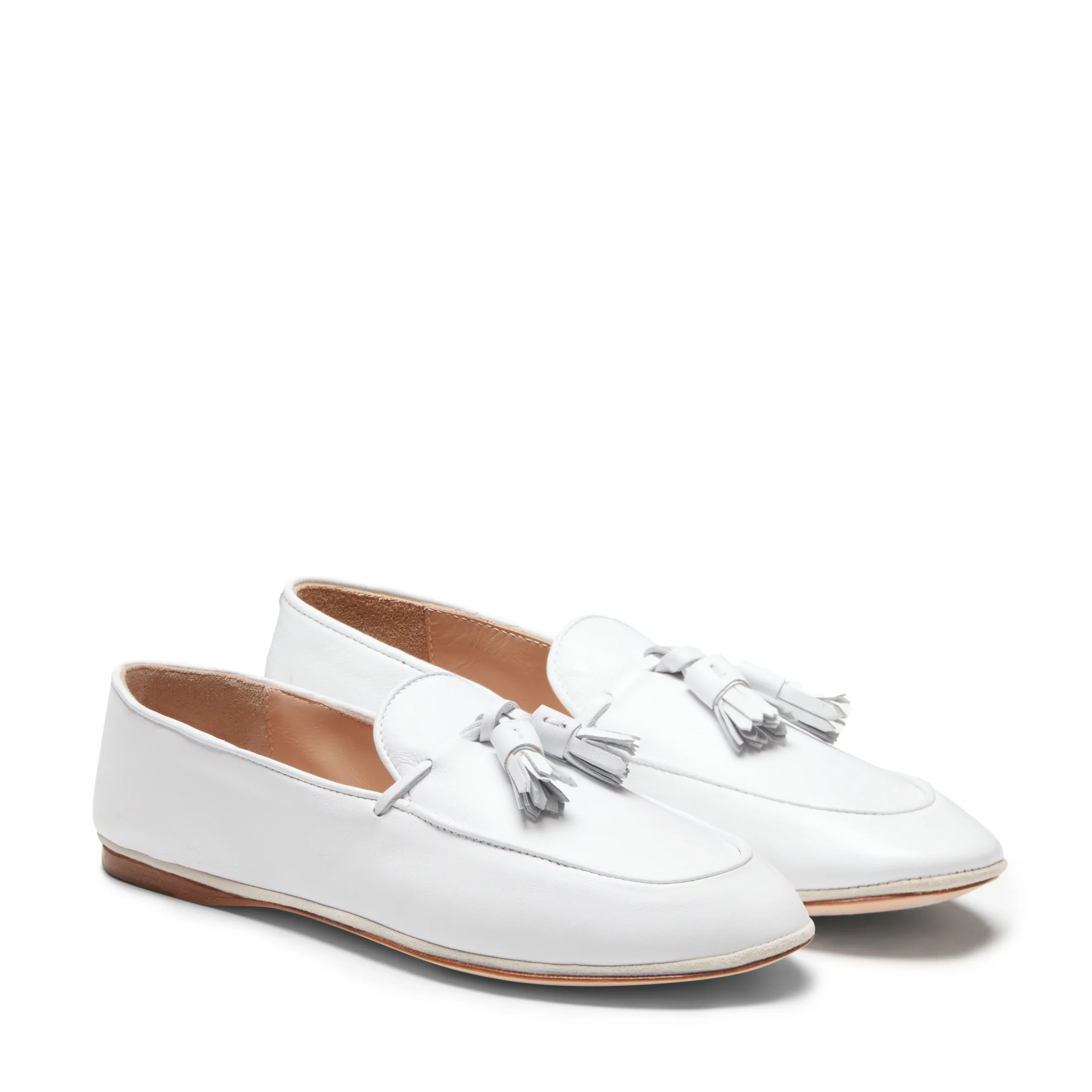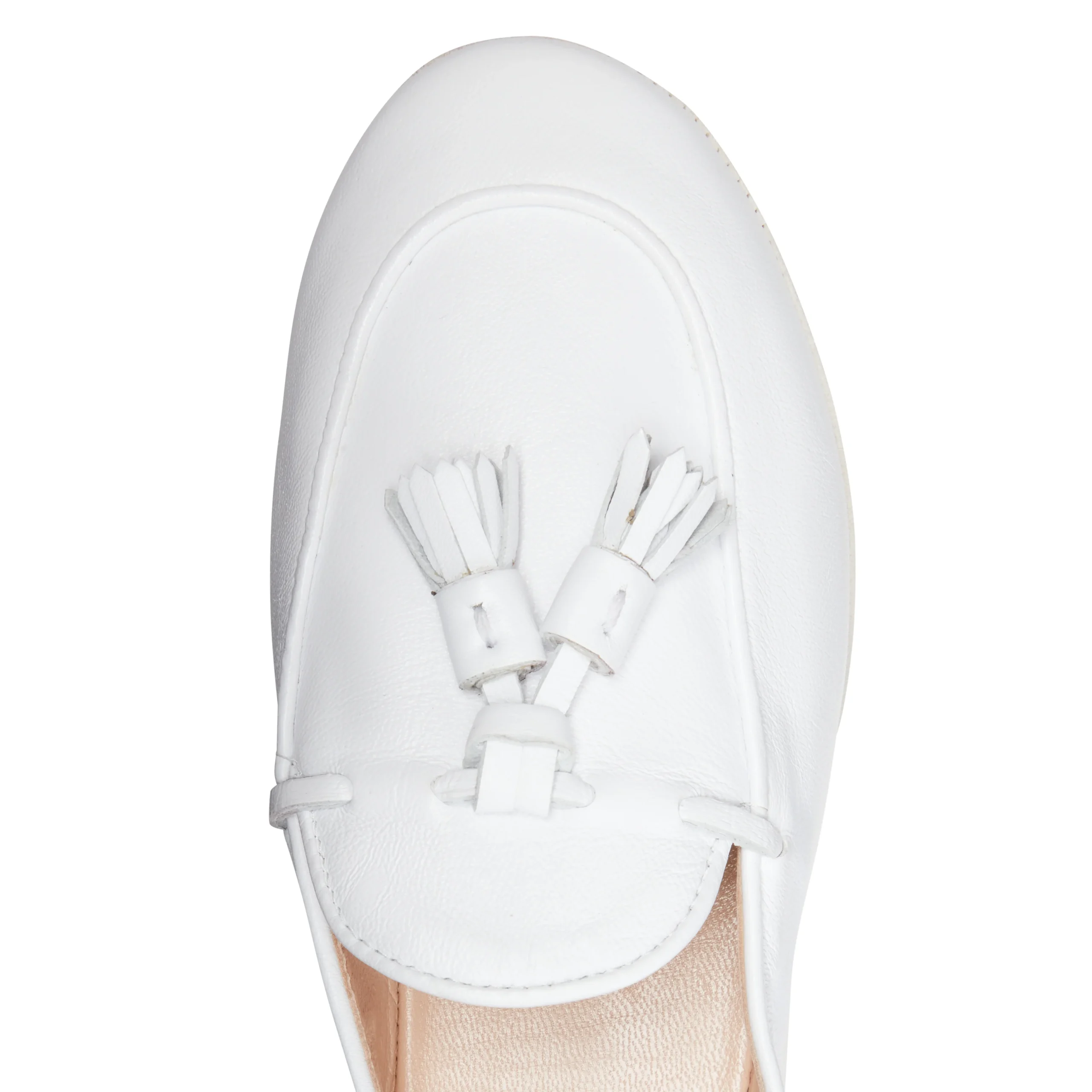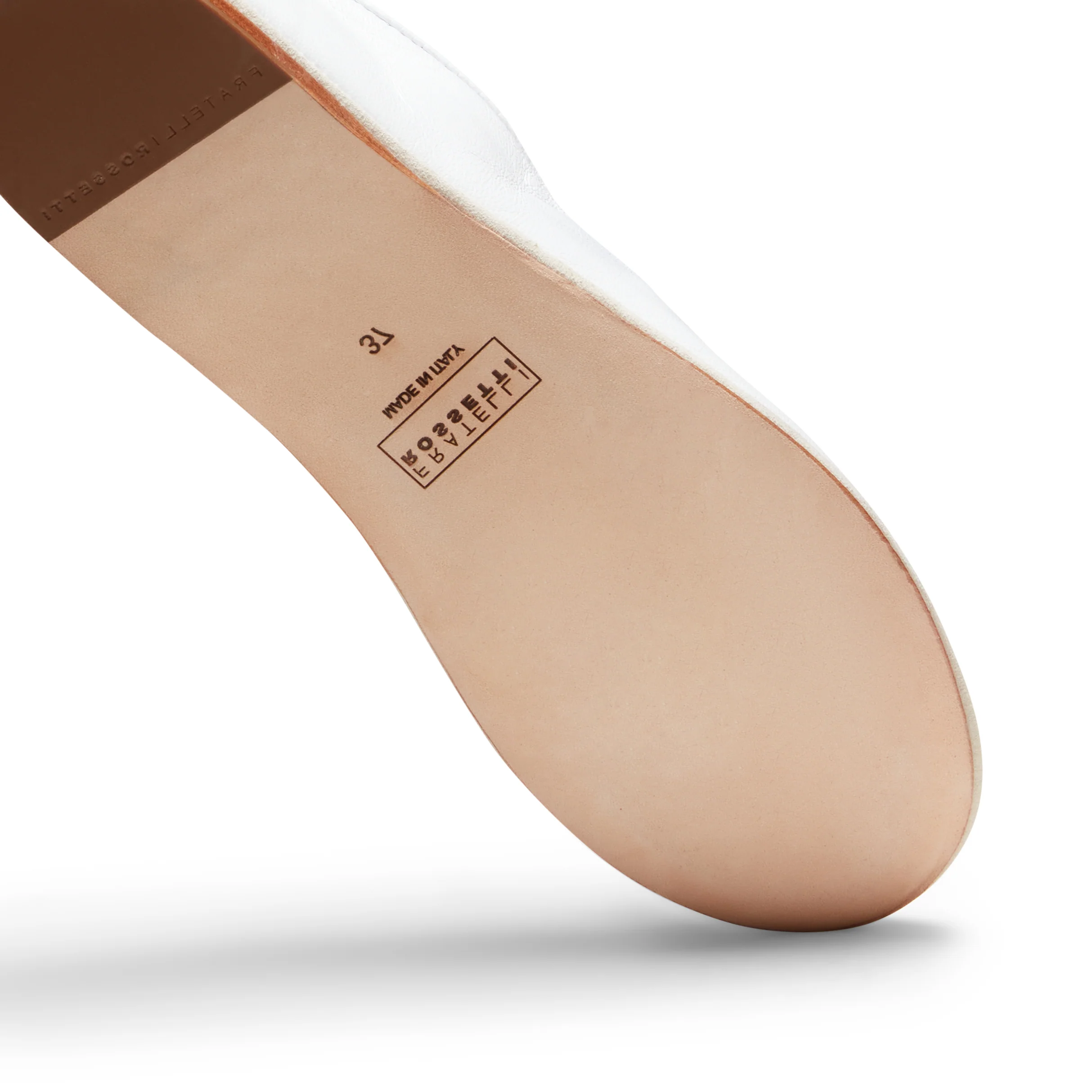 Lussuosa pantofola Brera in morbida nappa bianca. Caratterizzata dalla lavorazione a sacchetto, una tecnica artigianale che prevede la cucitura della fodera attorno alla forma come un guanto, dando vita a una calzatura priva di cuciture visibili. Questa lavorazione assicura un comfort superiore e un’estetica estremamente raffinata. La suola morbida con texture effetto nabuck e il tallone ripiegabile consentono di indossarla sia indoor che outdoor, interpretando i momenti di relax con un perfetto equilibrio tra versatilità e stile.