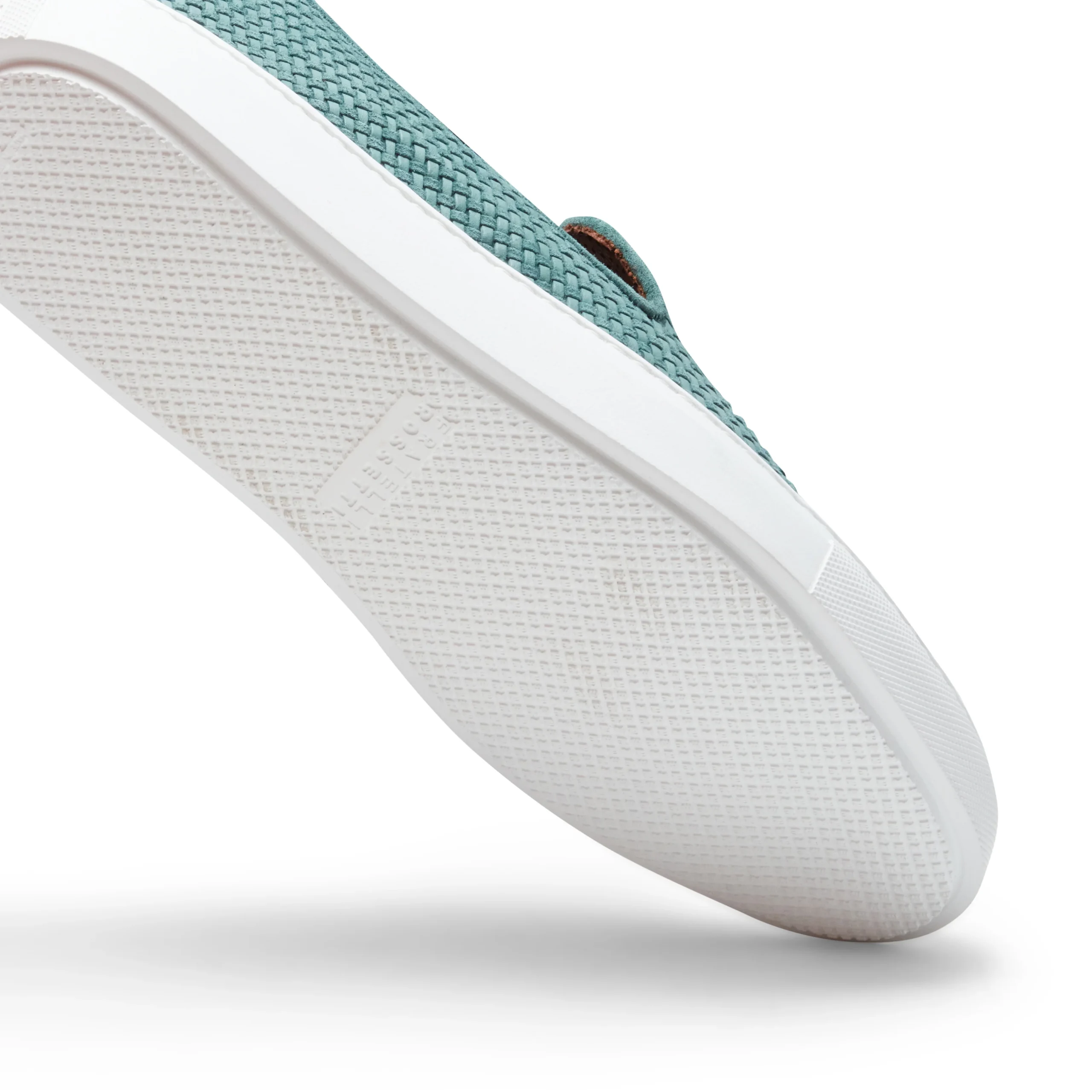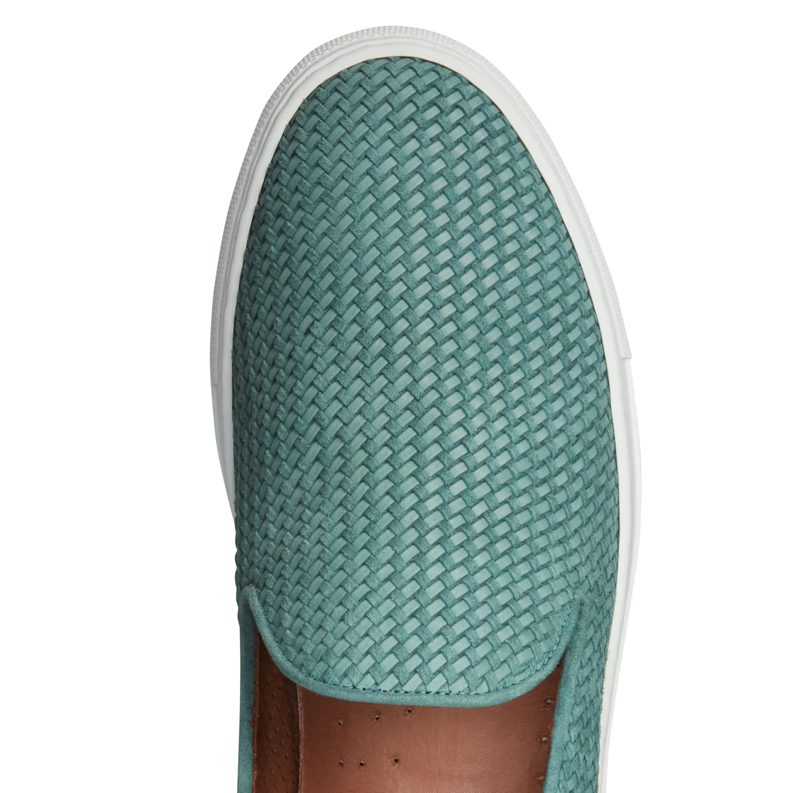 Slipper con fondo a cassetta realizzata in morbida pelle scamosciata color verde bottiglia finemente intrecciata che crea un raffinato effetto cromatico. Calzatura casual e dinamica che unisce comfort e stile.