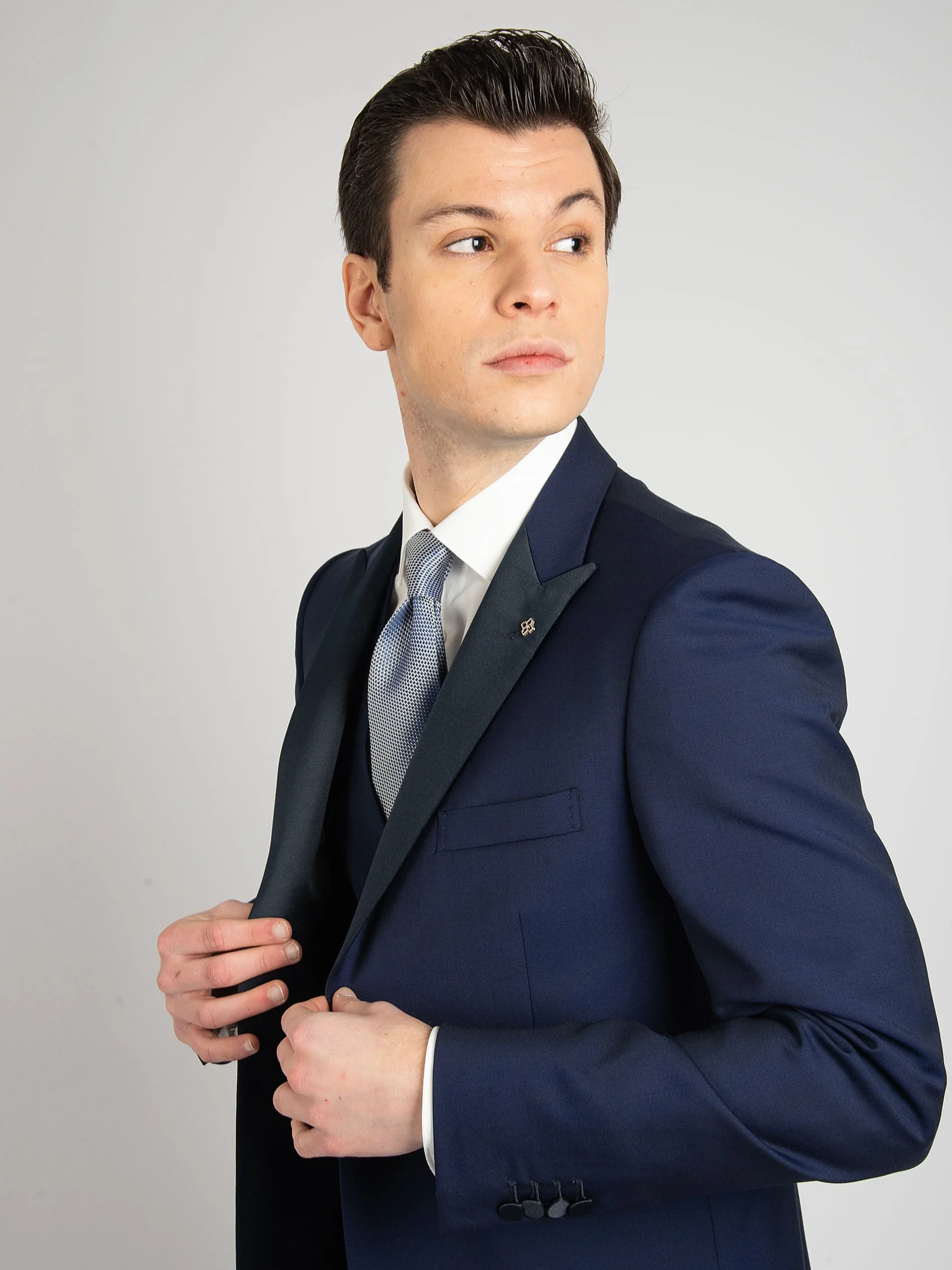- Giacca monopetto con rever lancia lunga in raso.
