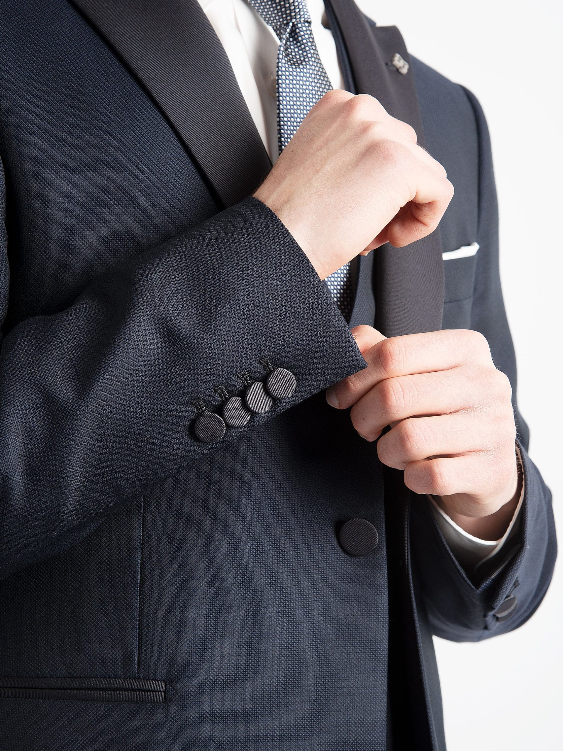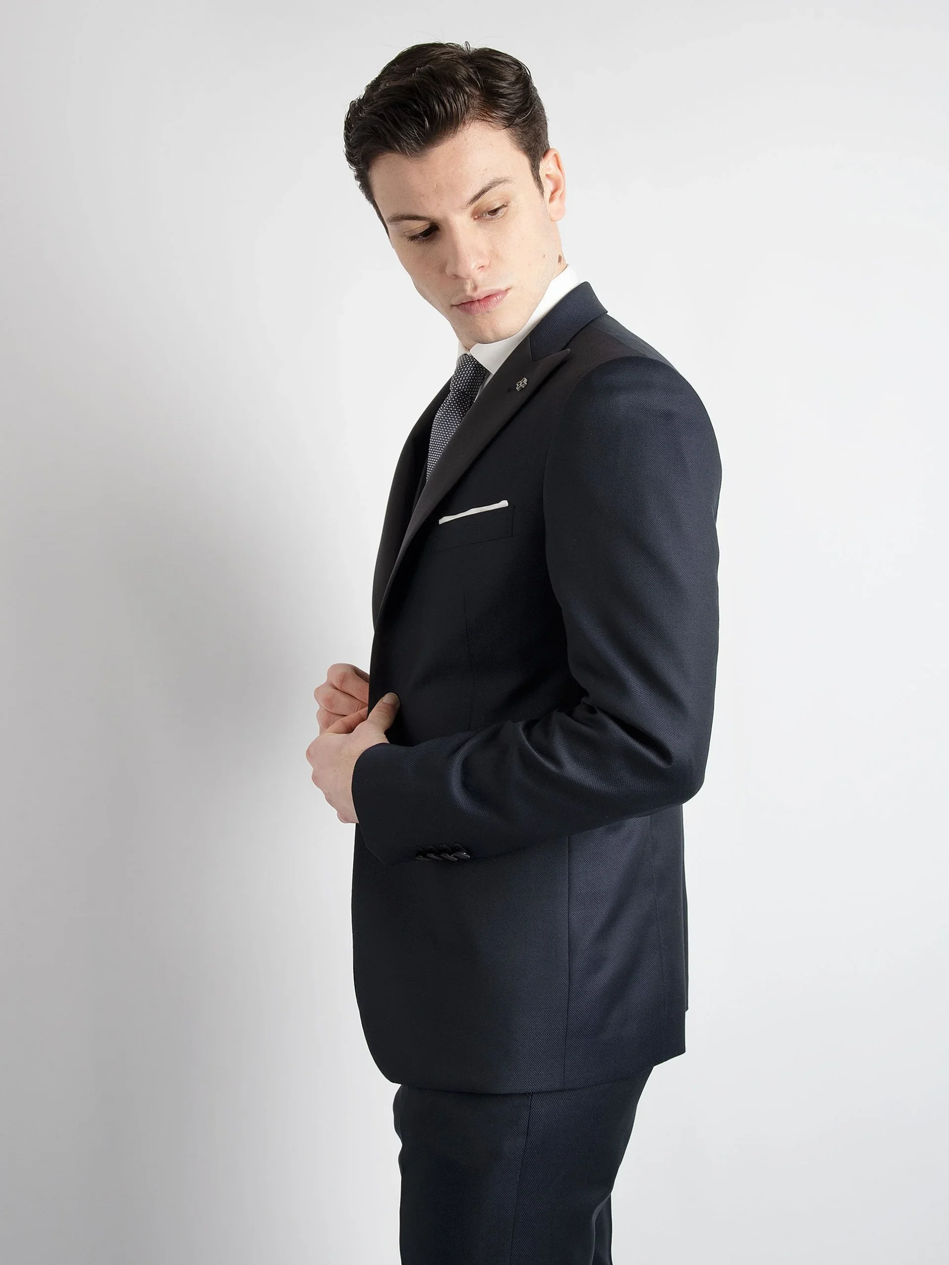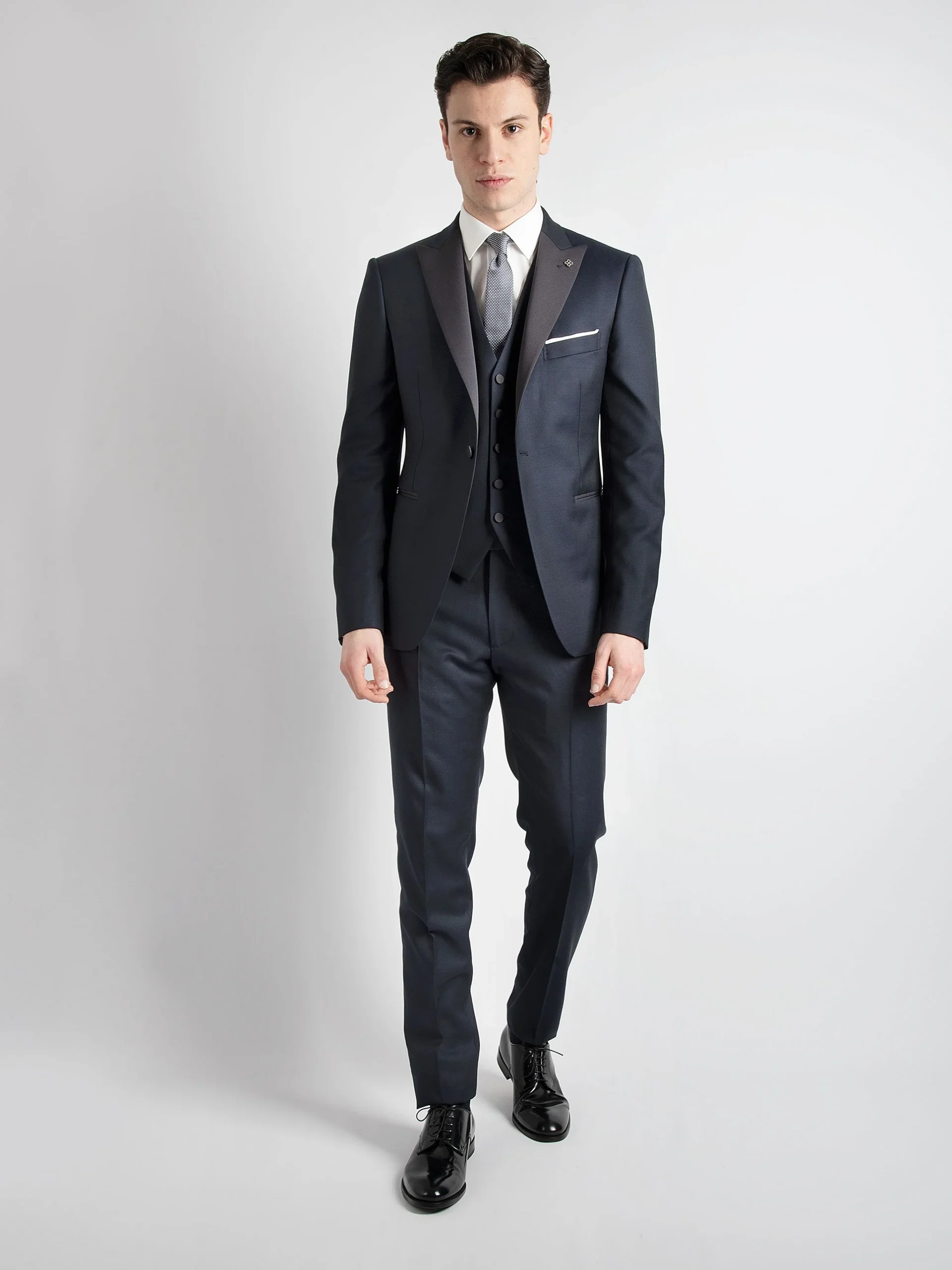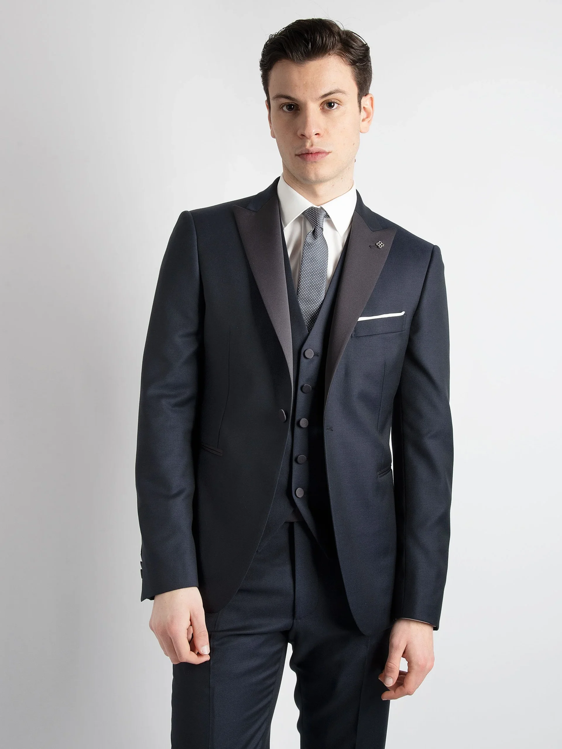 - Smoking sartoriale tre pezzi in 100% lana micro lavorata blu.