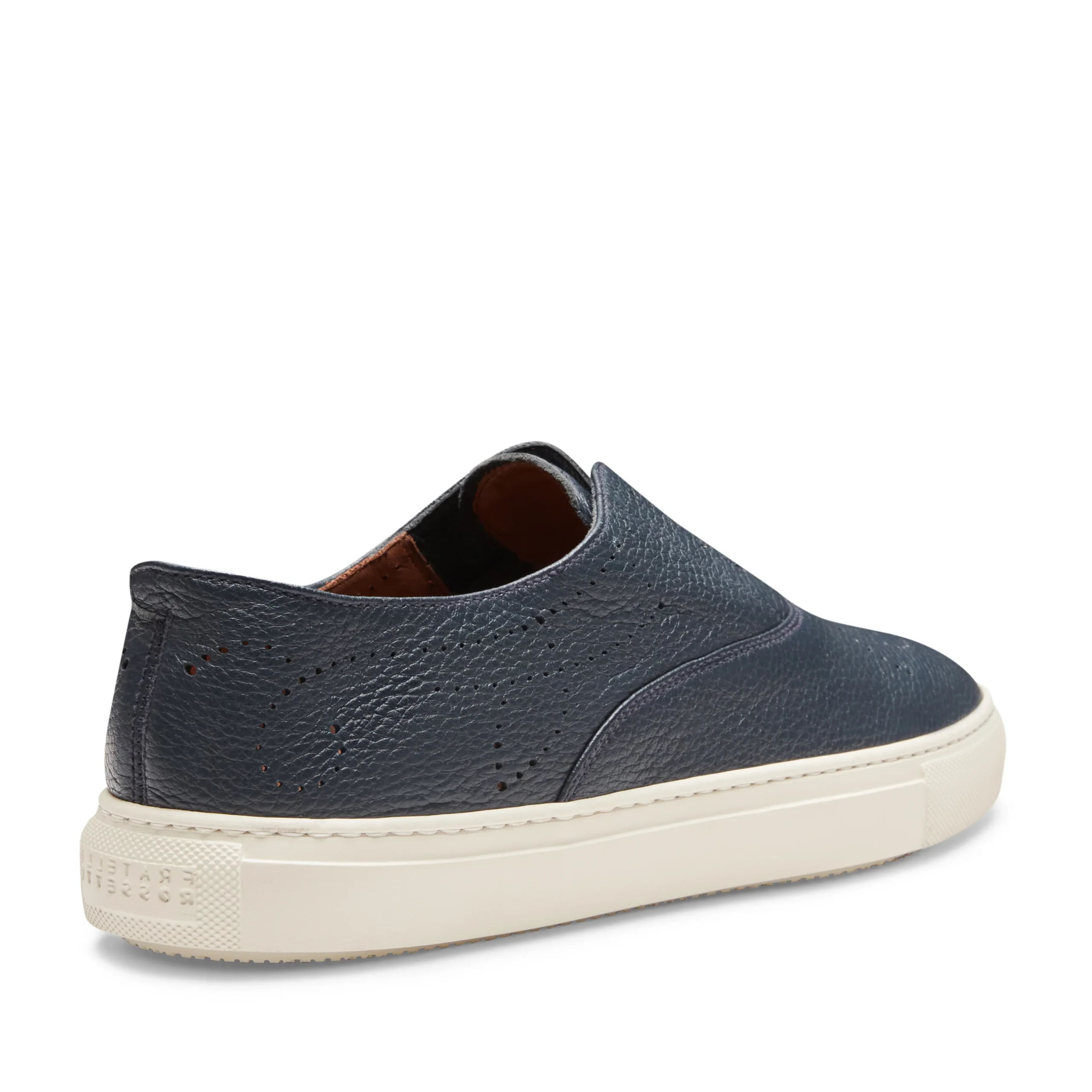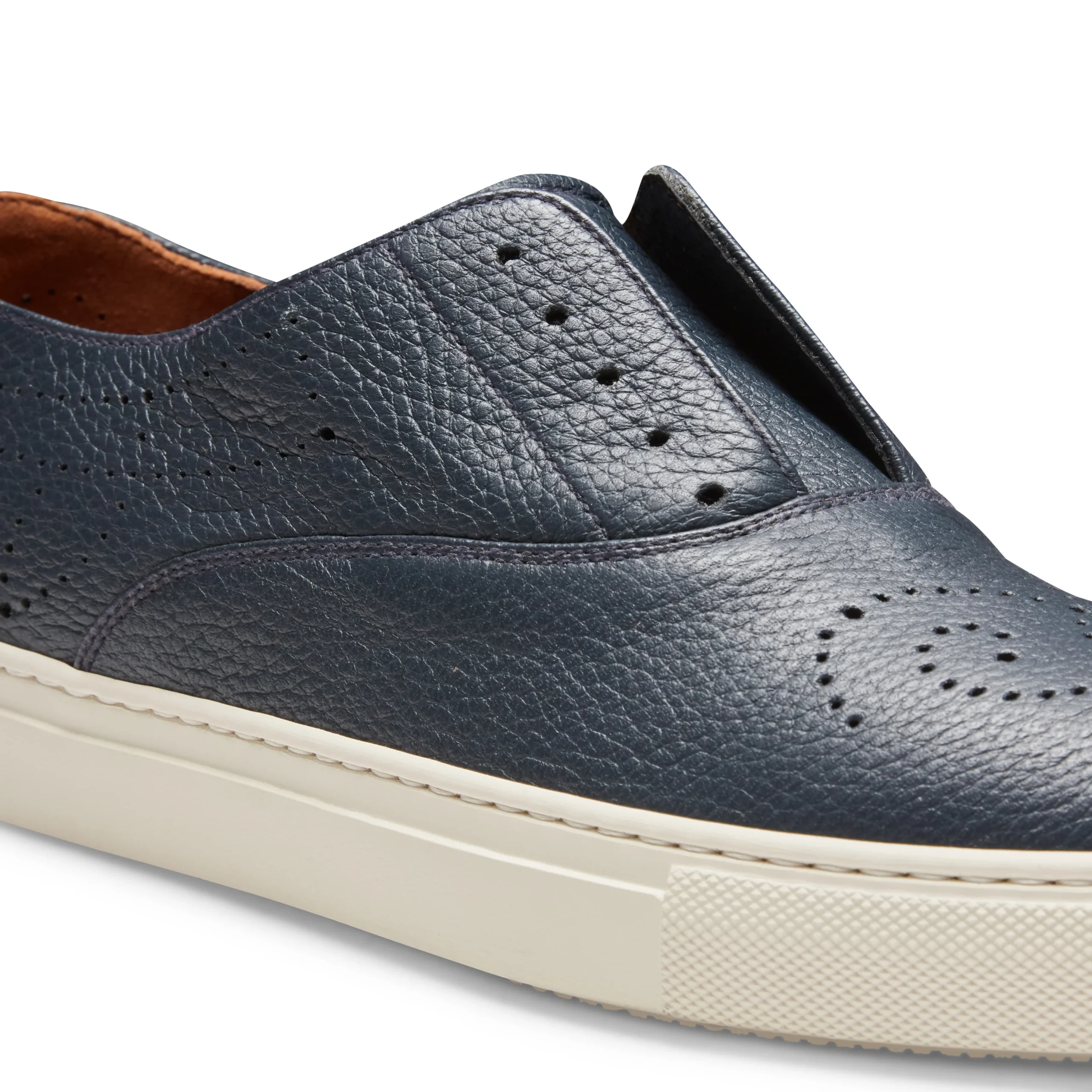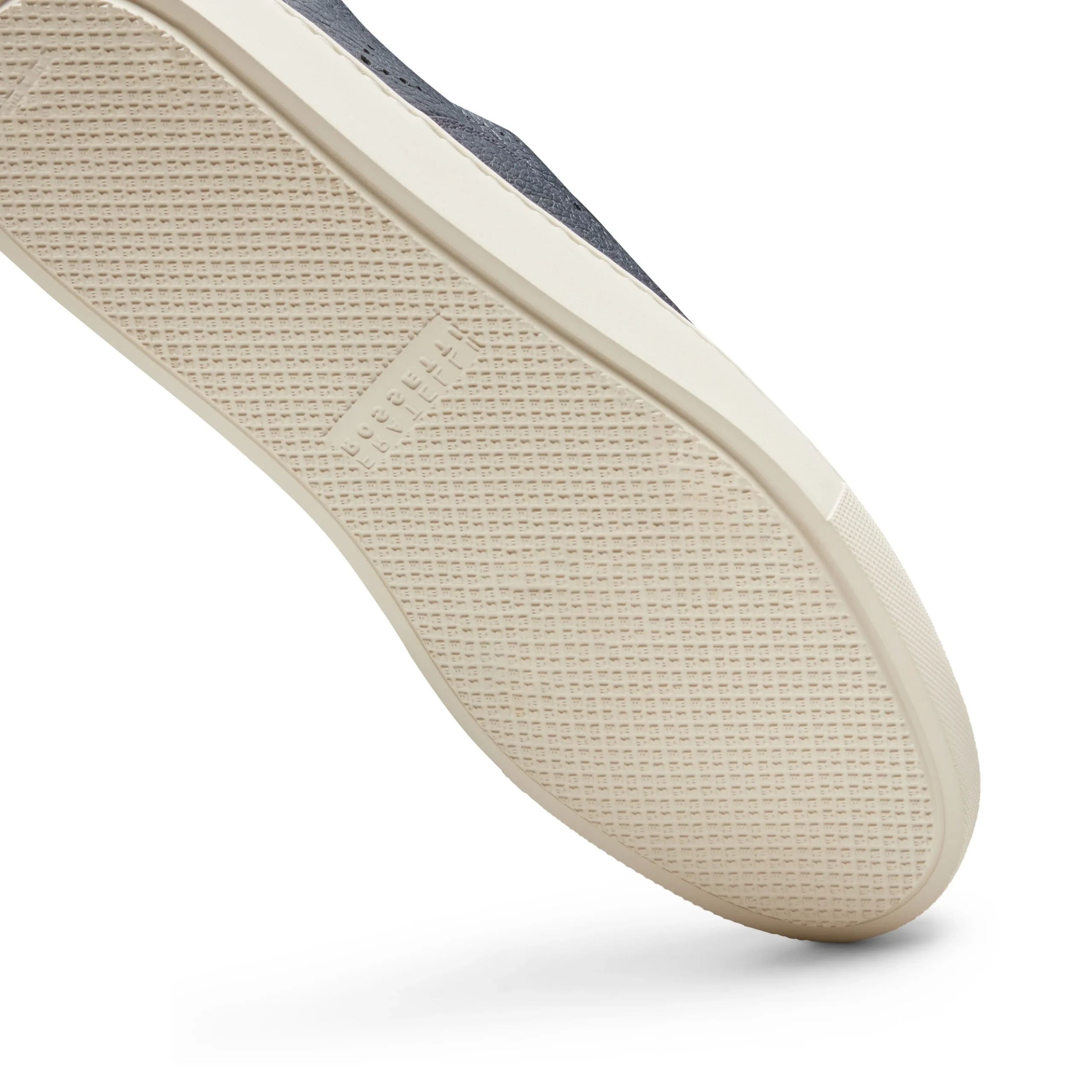 Sneaker Hobo Sport con fondo a cassetta e dettagli di forature, realizzata in morbida pelle color blu navy con grana visibile. Calzatura casual e raffinata che può essere indossata senza lacci grazie a pratici elastici interni. Suola in gomma con battistrada personalizzato.
