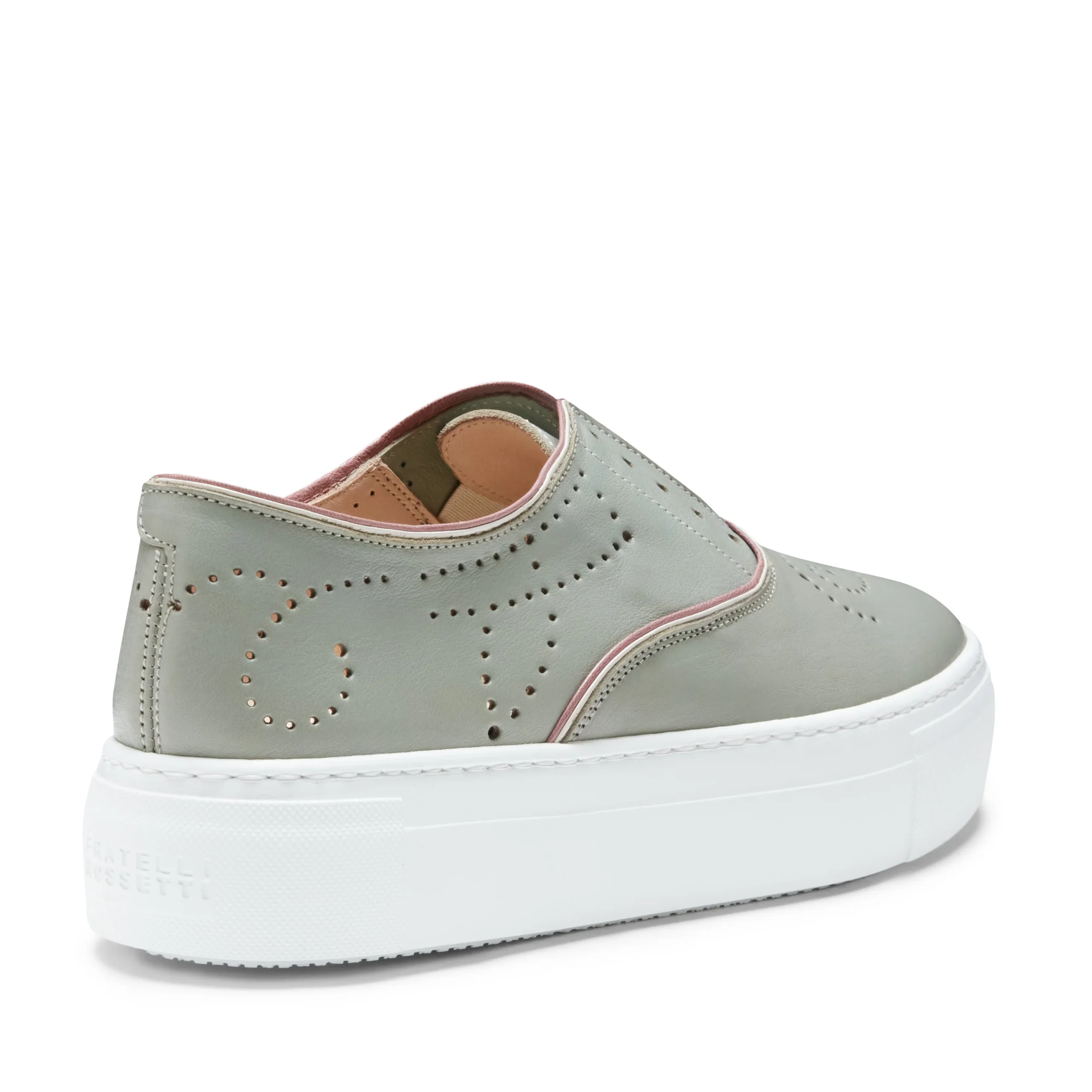 Iconica sneaker Hobo Sport con fondo a cassetta e dettagli di forature, realizzata in morbida pelle tinta in botte color verde pastello con effetto leggermente mosso. Calzatura casual e raffinata che può essere indossata senza lacci grazie a pratici elastici interni. Suola in gomma con battistrada personalizzato.
