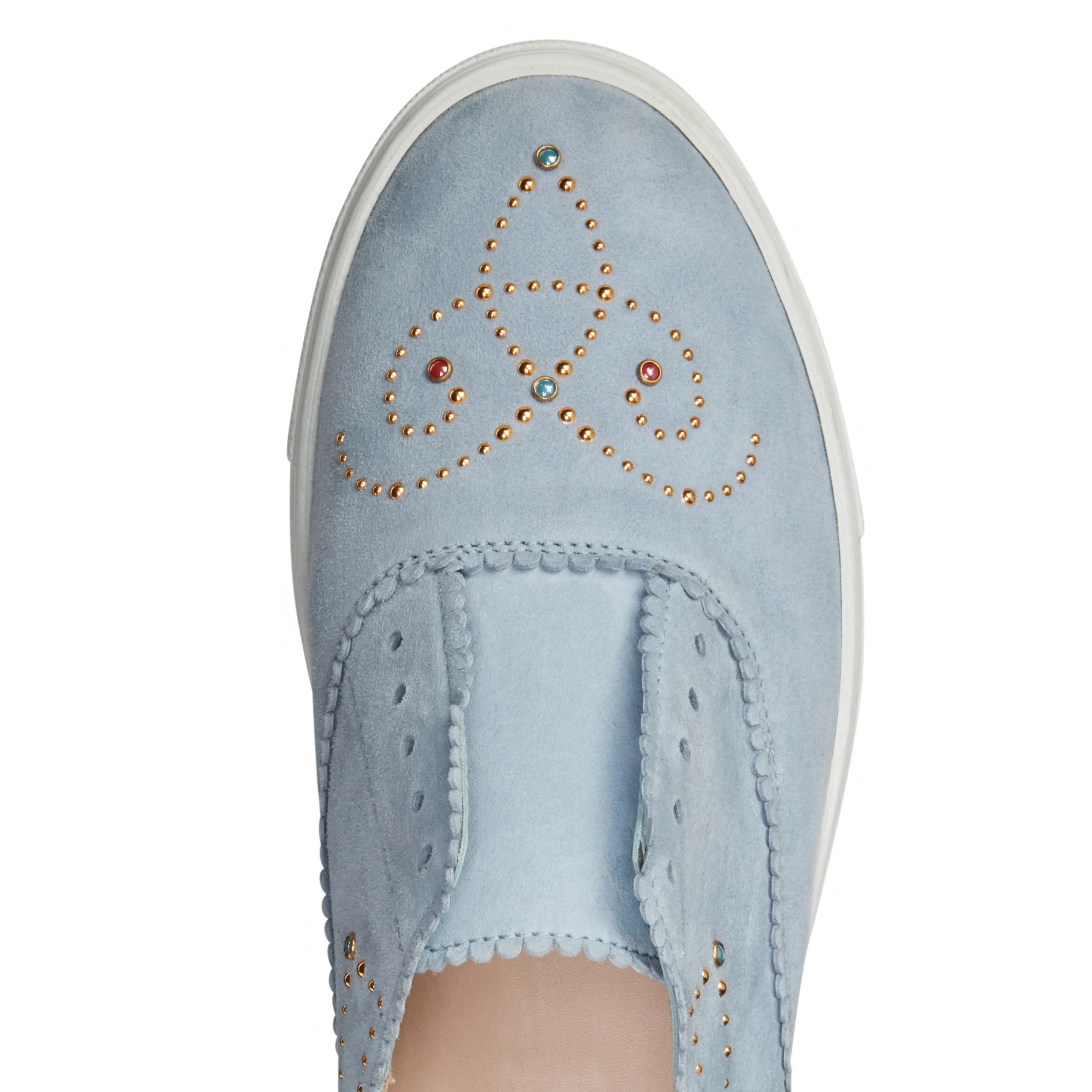 L’iconica sneaker Hobo Sport con fondo a cassetta è proposta in un’interpretazione romantica e raffinata. I dettagli di foratura sono impreziositi da piccole borchie colorate, mentre i profili smerlettati ne esaltano il design. Calzatura casual ma ricercata, è realizzata in morbida pelle scamosciata color celeste e può essere indossata anche senza lacci grazie ai pratici elastici interni, garantendo comfort e versatilità. Suola in gomma con battistrada personalizzato.