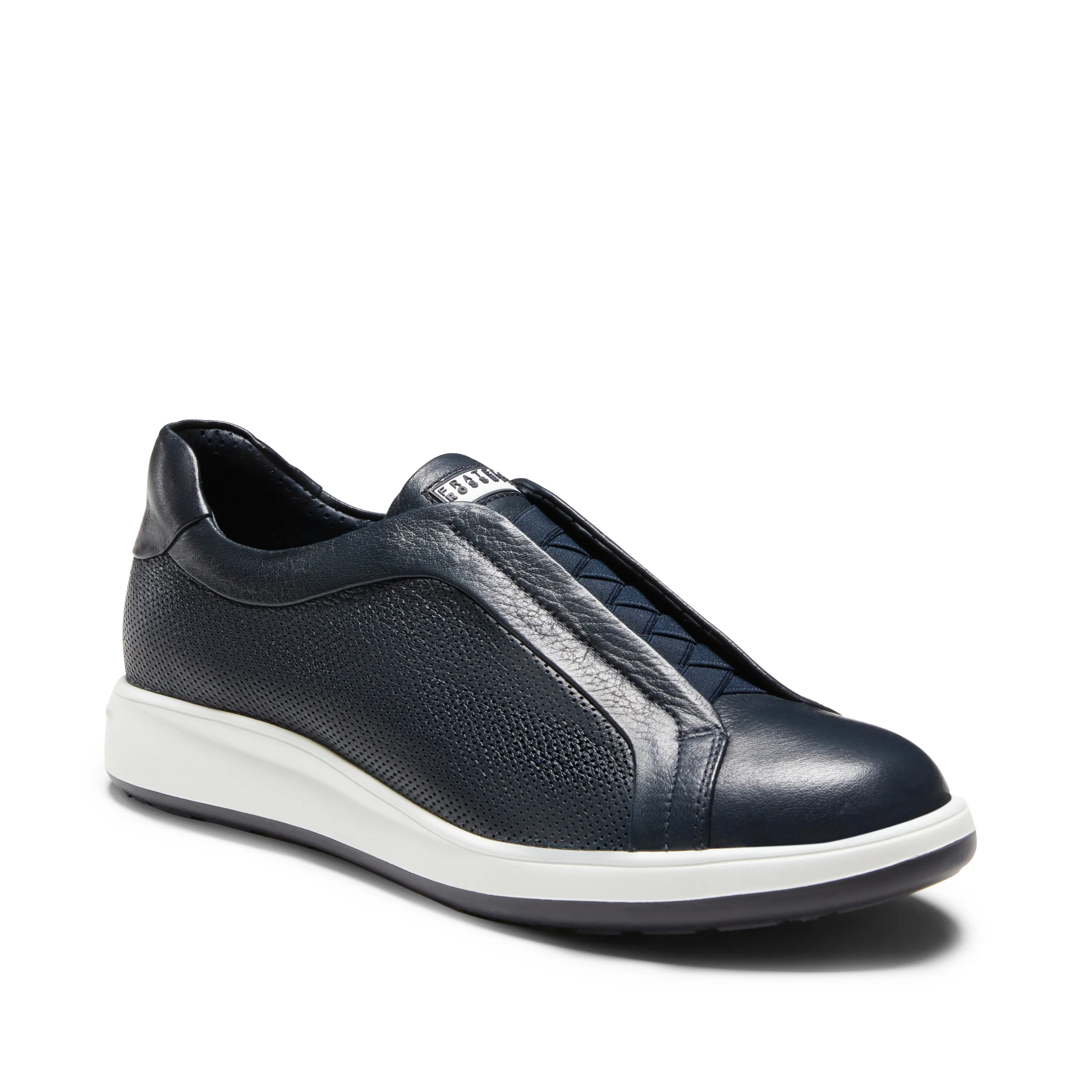 Connubio tra eleganza e comfort per la sneaker realizzata in morbida pelle blu liscia e traforata. Grazie agli elastici incrociati si può indossare agevolmente come una slipper. Suola in gomma bicolore, leggera e flessibile.