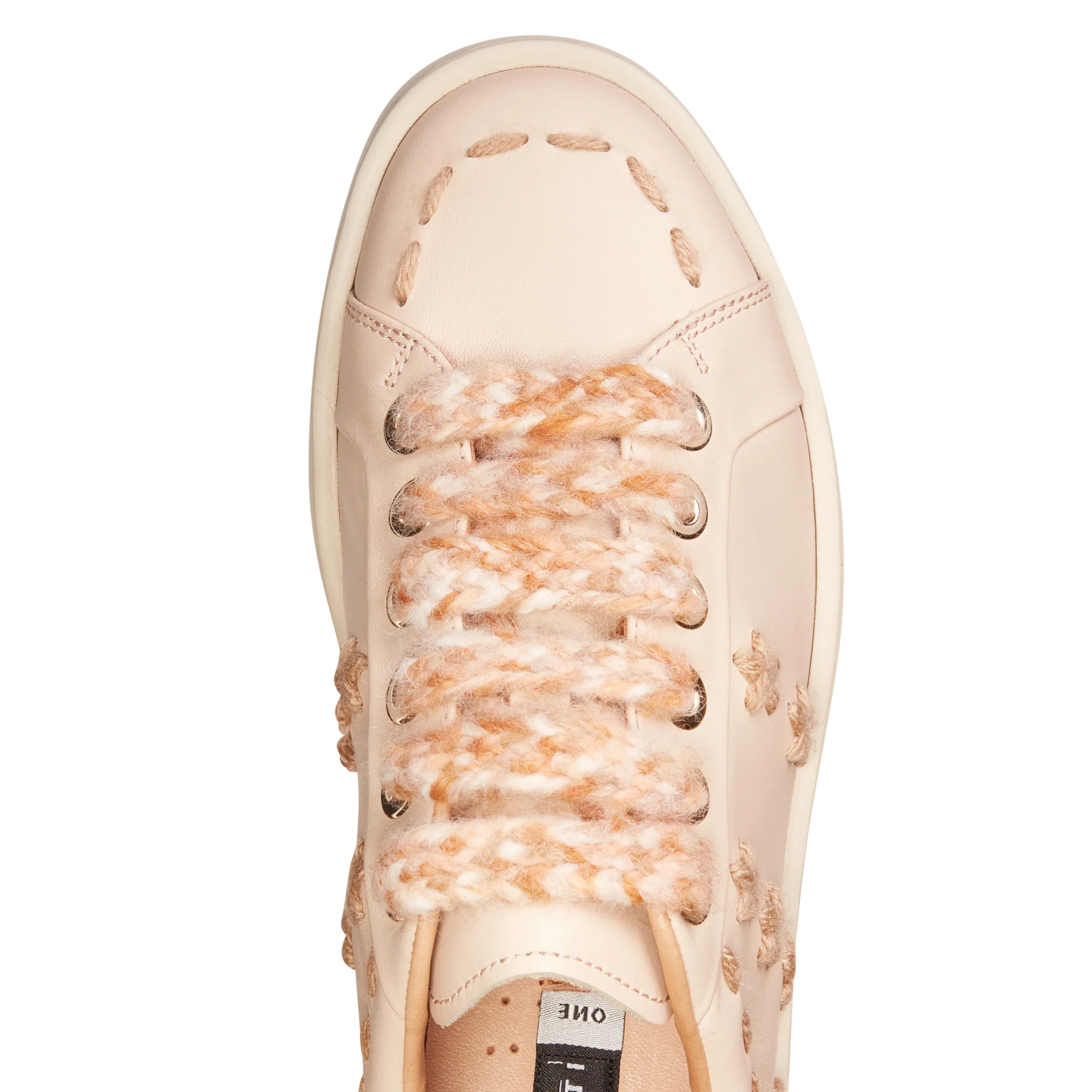Allure romantica per la sneaker realizzata in morbida pelle liscia color rosa cipria. I lati della calzatura sono caratterizzati da infilature in lana in abbinamento alle stringhe per un effetto cozy chic. Particolare inserto sul tallone in colore a contrasto con il logo in metallo. Suola in gomma con battistrada personalizzato antiscivolo, garantisce comfort e leggerezza.