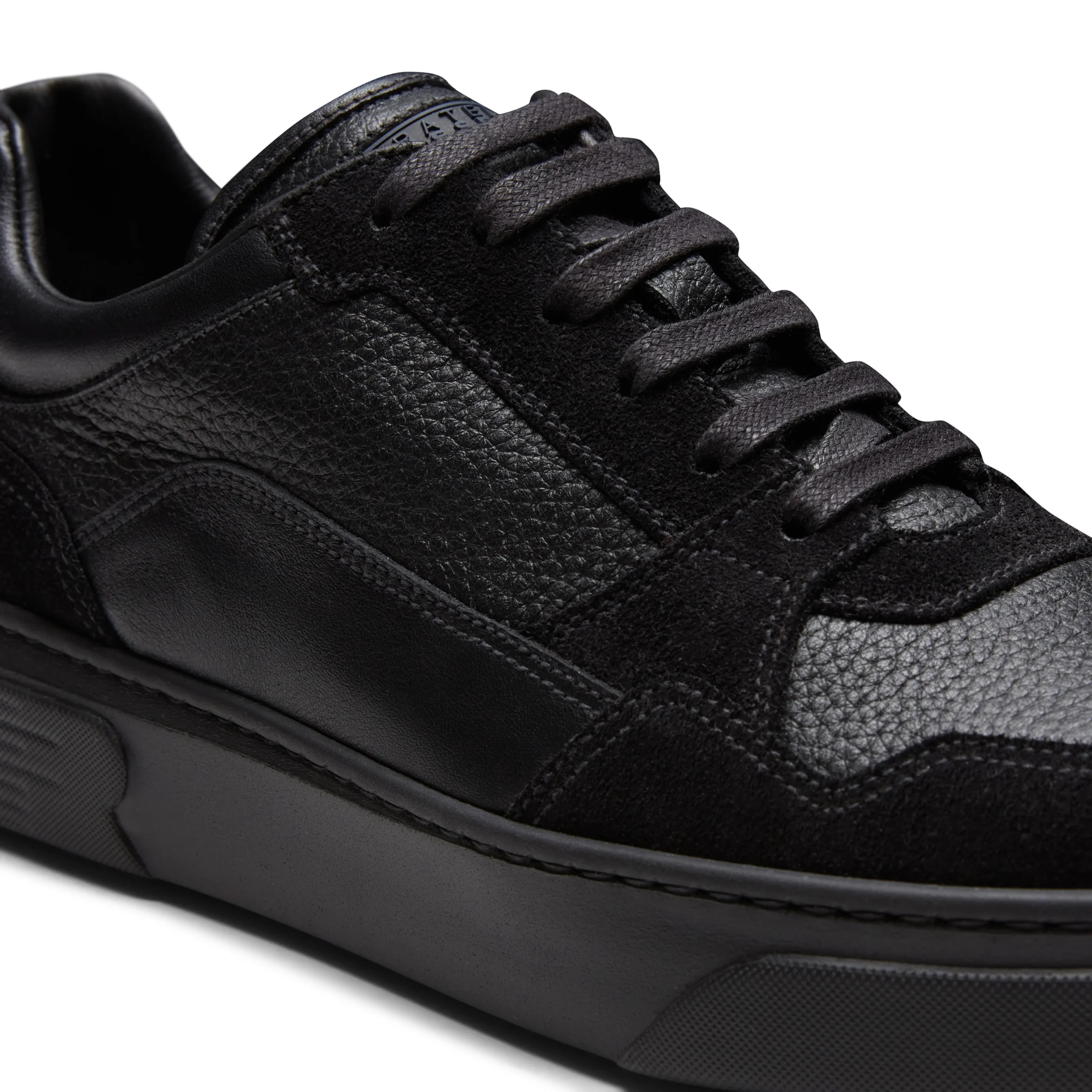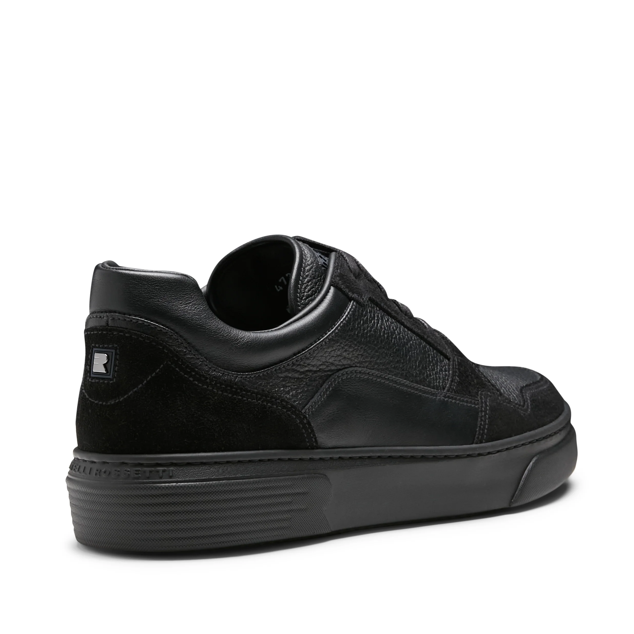 Look dinamico e metropolitano per la sneaker realizzata in morbido suede nero abbinato a raffinata pelle di cervo in tono. La suola a cassetta in gomma leggera e flessibile, con battistrada personalizzato, riporta sul laterale il monogramma del Brand.