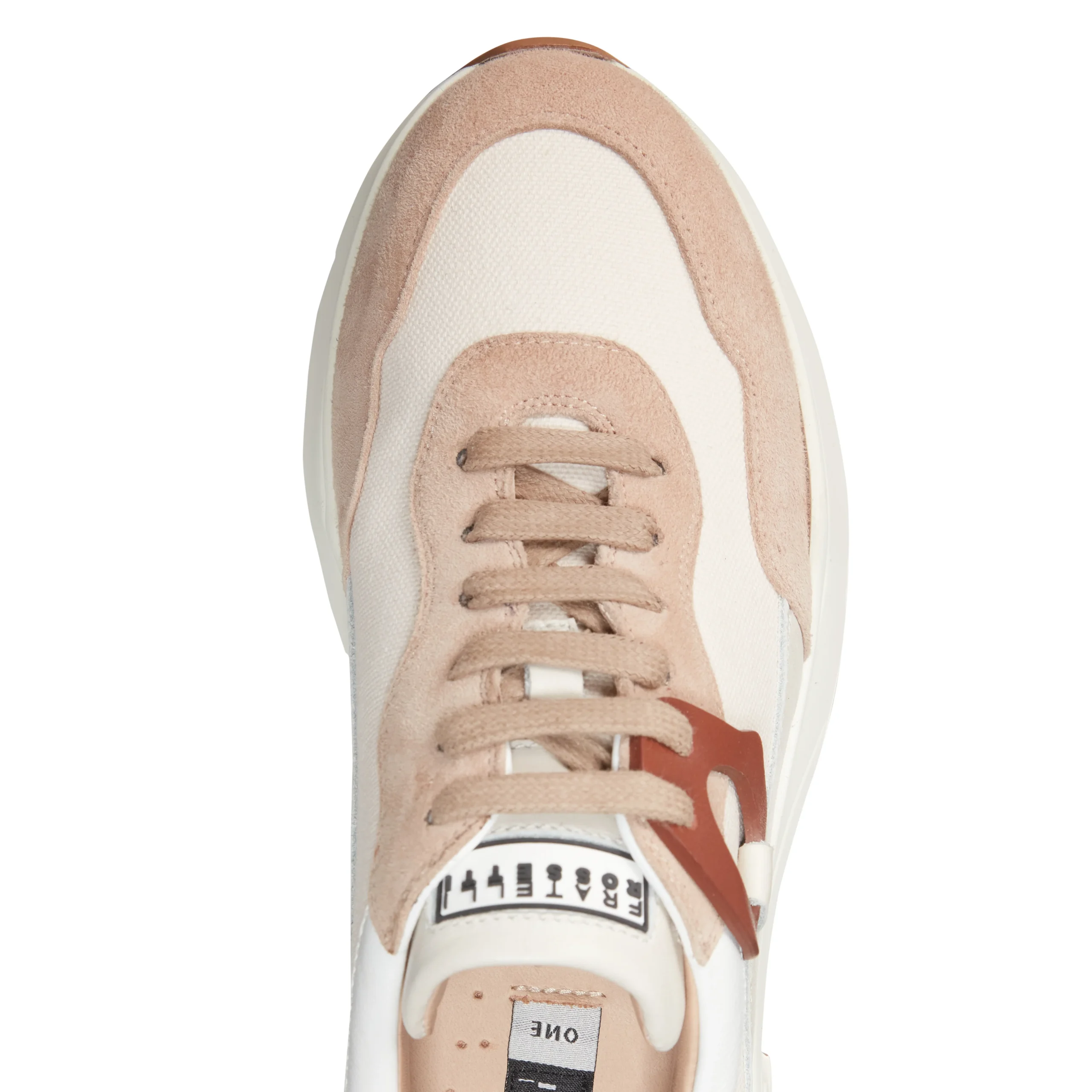 Sneaker dal look dinamico, caratterizzata da un ricercato mix di colori e materiali: tessuto, pelle e suede nei toni del bianco latte e rosa. Il design richiama l’iconico concetto della staffa Magenta, reinterpretato attraverso un accessorio in pelle lisciata e cerata che funge da passante per le stringhe. Un modello pensato per chi desidera il comfort di un outfit sportivo senza rinunciare a un tocco glamour