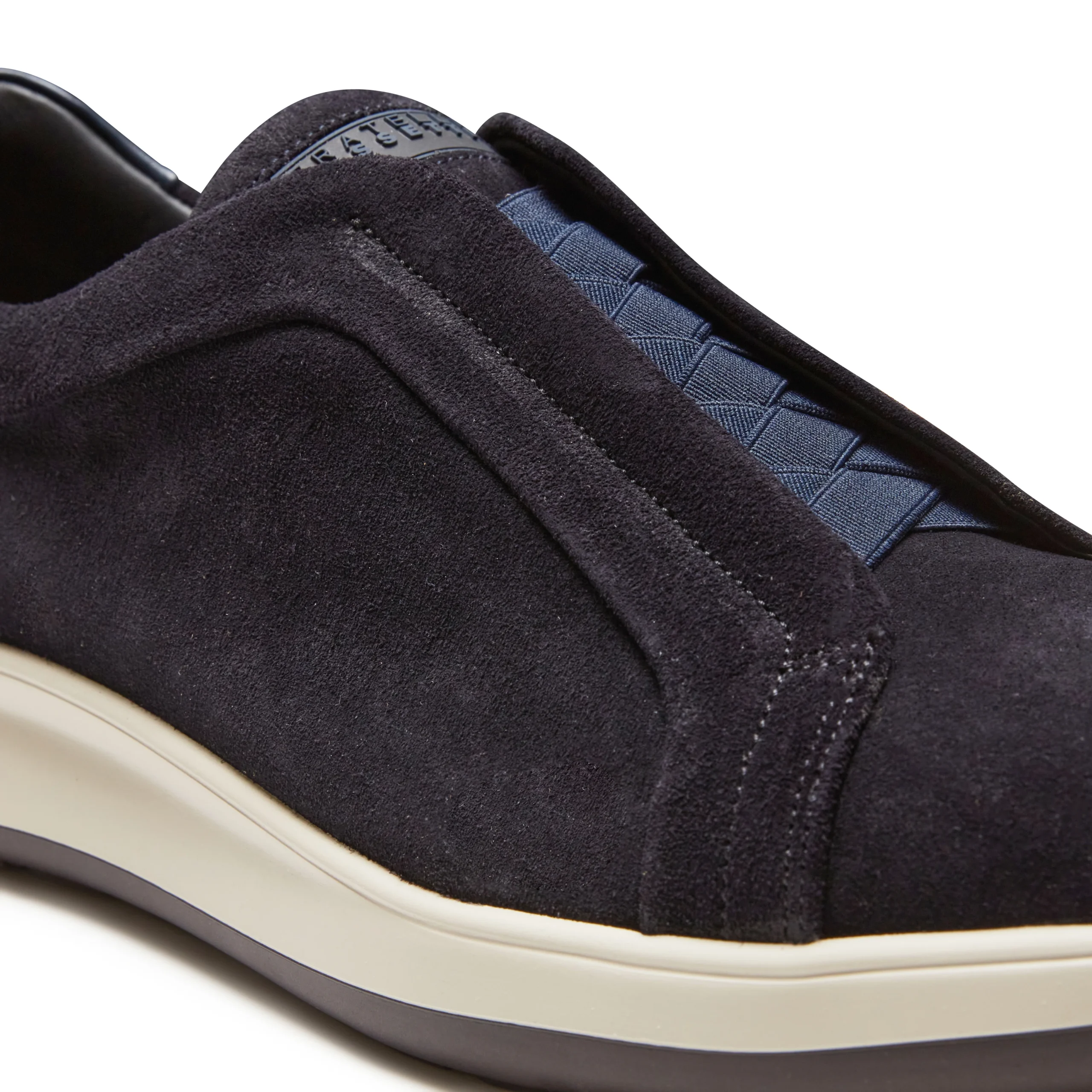Perfetto connubio tra eleganza e comfort per questa sneaker in morbida pelle scamosciata idrorepellente color blu marine. Gli elastici incrociati permettono di indossarla facilmente, come una slipper, coniugando praticità e stile. La suola bicolore in gomma leggera e flessibile garantisce un comfort duraturo, rendendo questa calzatura versatile per ogni occasione.