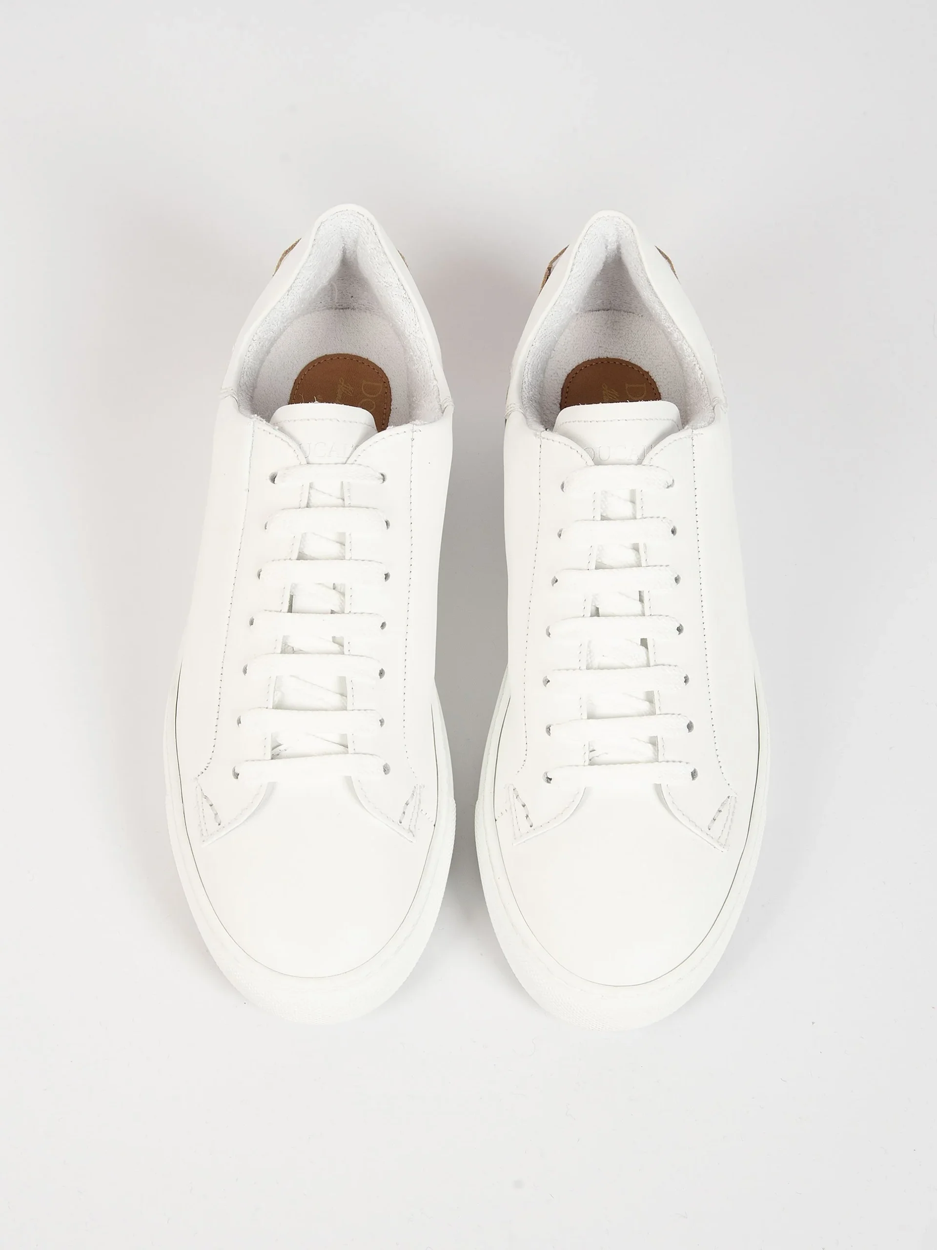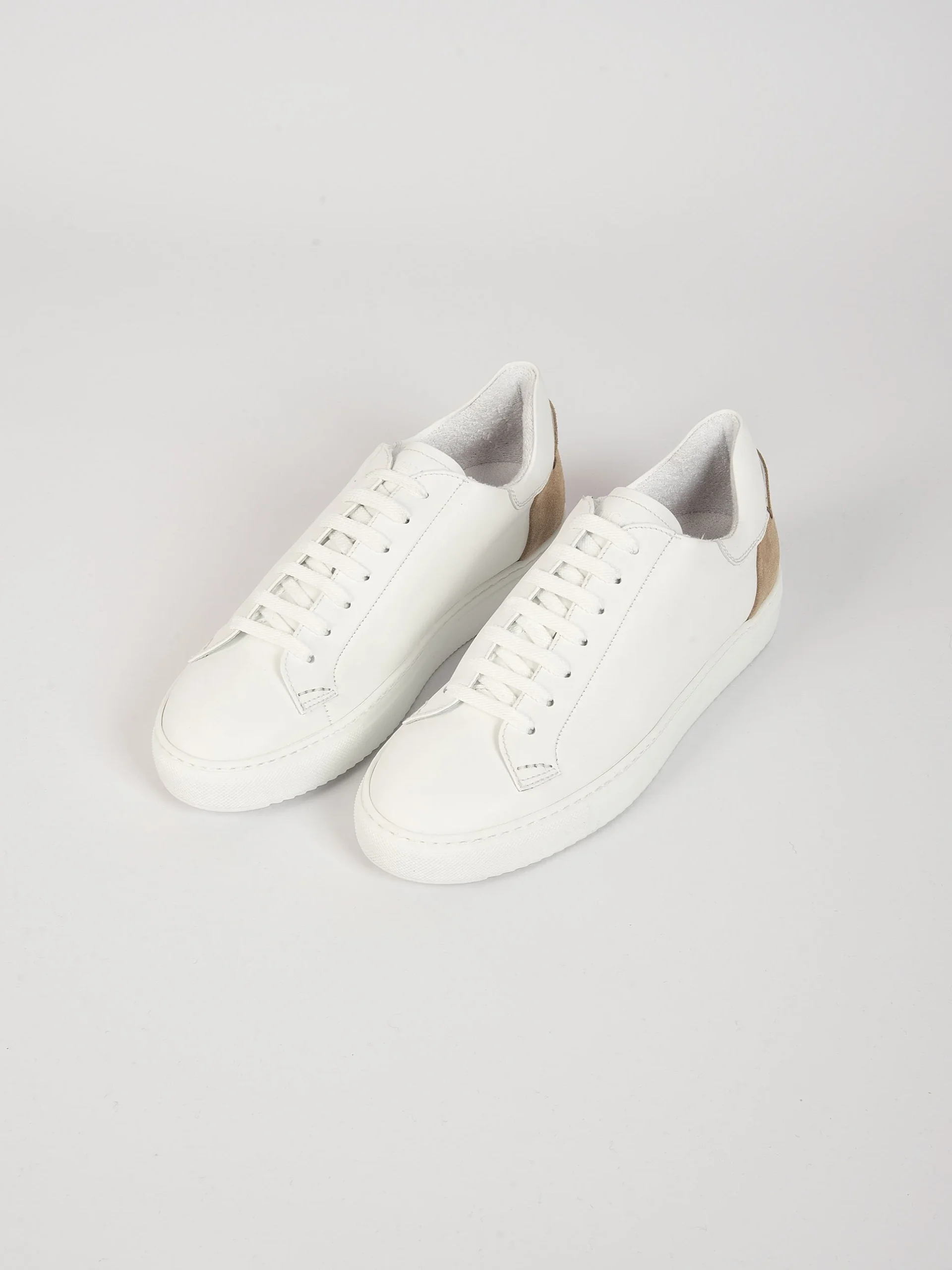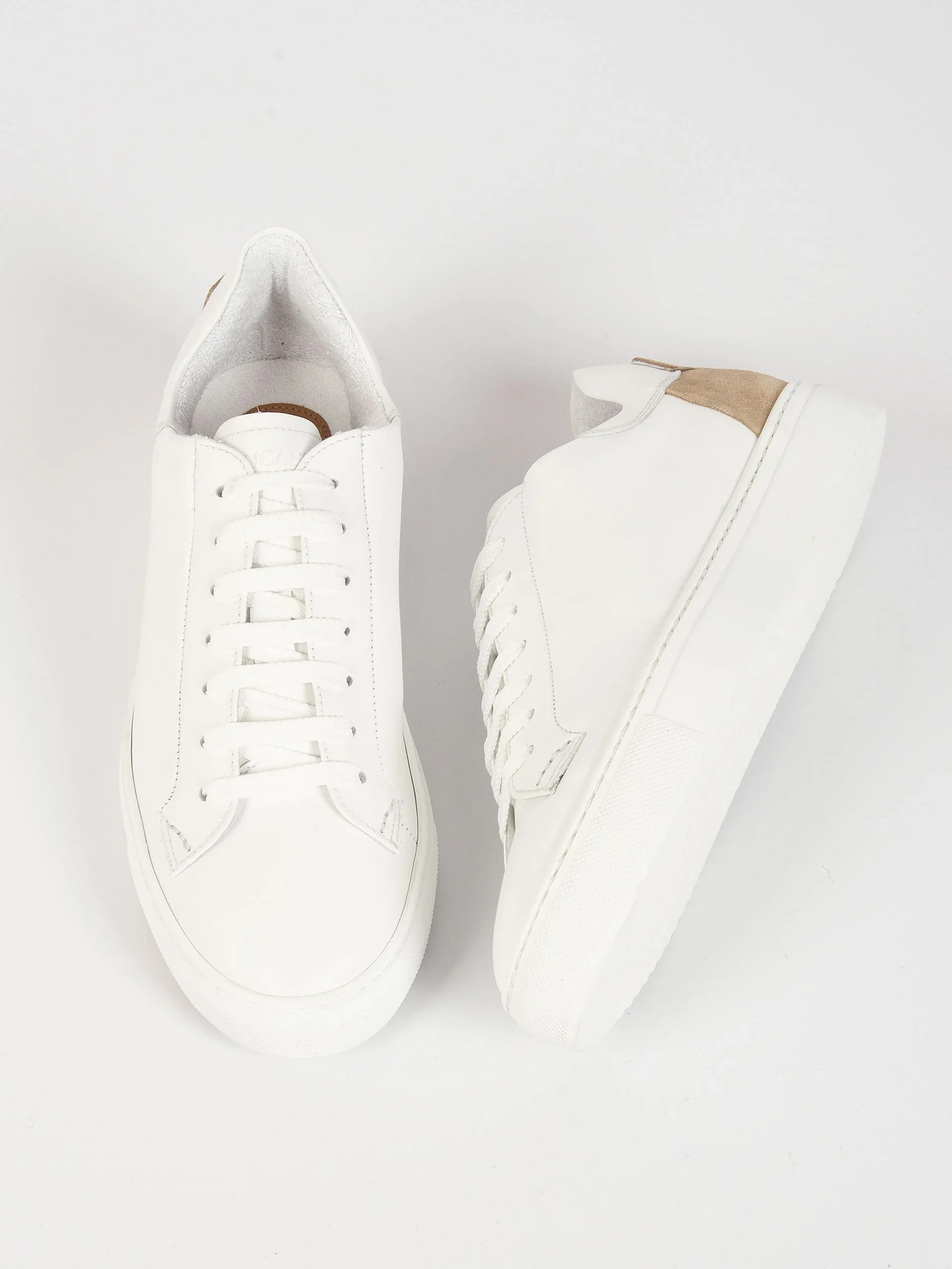 Mod: DU2622ERICPT240IC15 Sneaker artigianale in pelle liscia bianca Inserto posteriore in suede color Sabbia. Fodera interna in spugna. Allacciatura a sette occhielli con lacci in cotone. Logo inciso sulla linguetta e rinforzo sul tacco. Fondo in gomma vulcanizzata con brevetto LiveTech®. Soletta interna ergonomica. 100% Made in Italy. Calzata comoda.