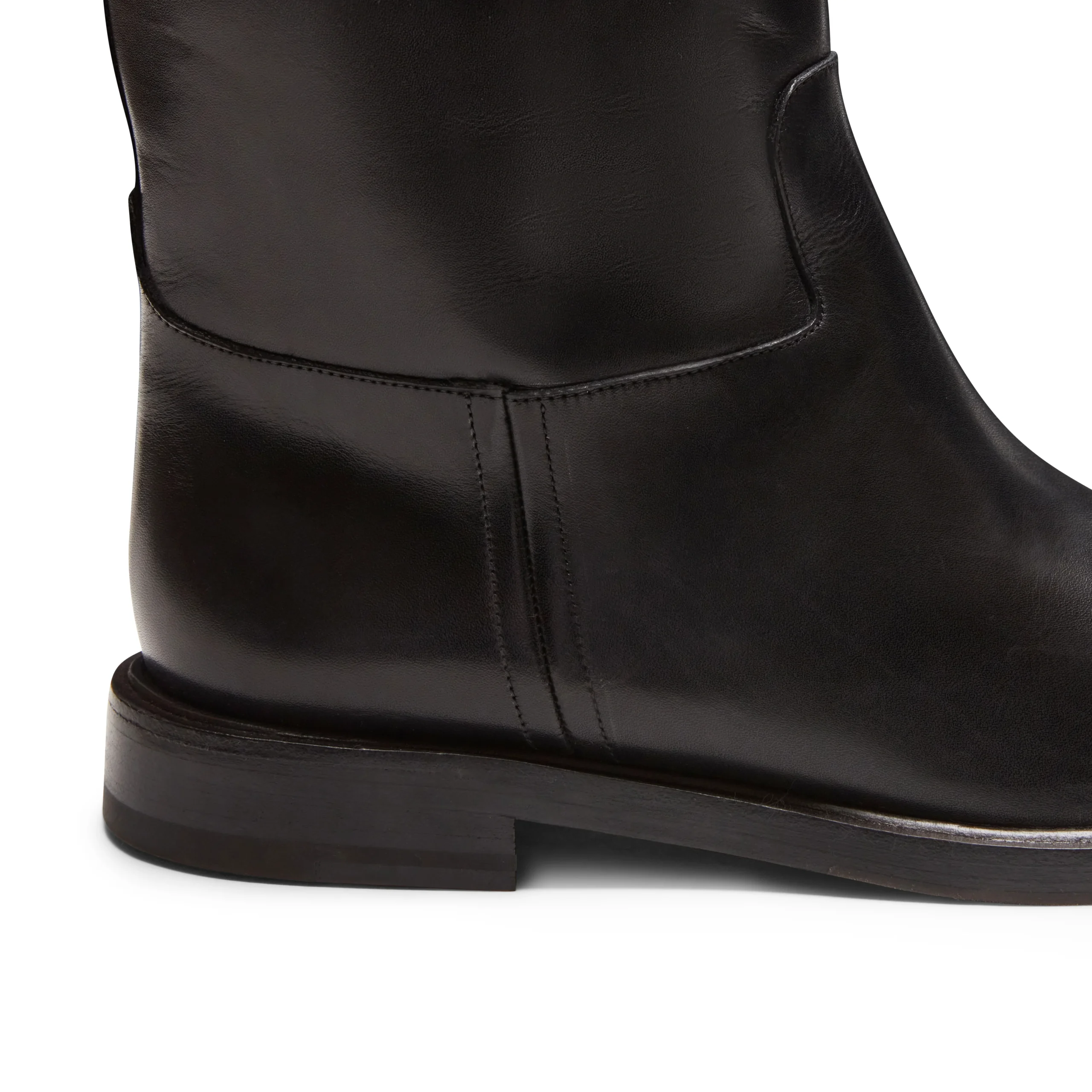 Linee contemporanee e rifiniture artigianali determinano il look mannish dello stivale realizzato in pelle nera liscia con aspetto anticato. Caratterizzato dalla calzata a tubo e da una banda superiore in colore mandorla che crea un raffinato contrasto. Suola in cuoio con inserto in gomma. br>Art. 68191