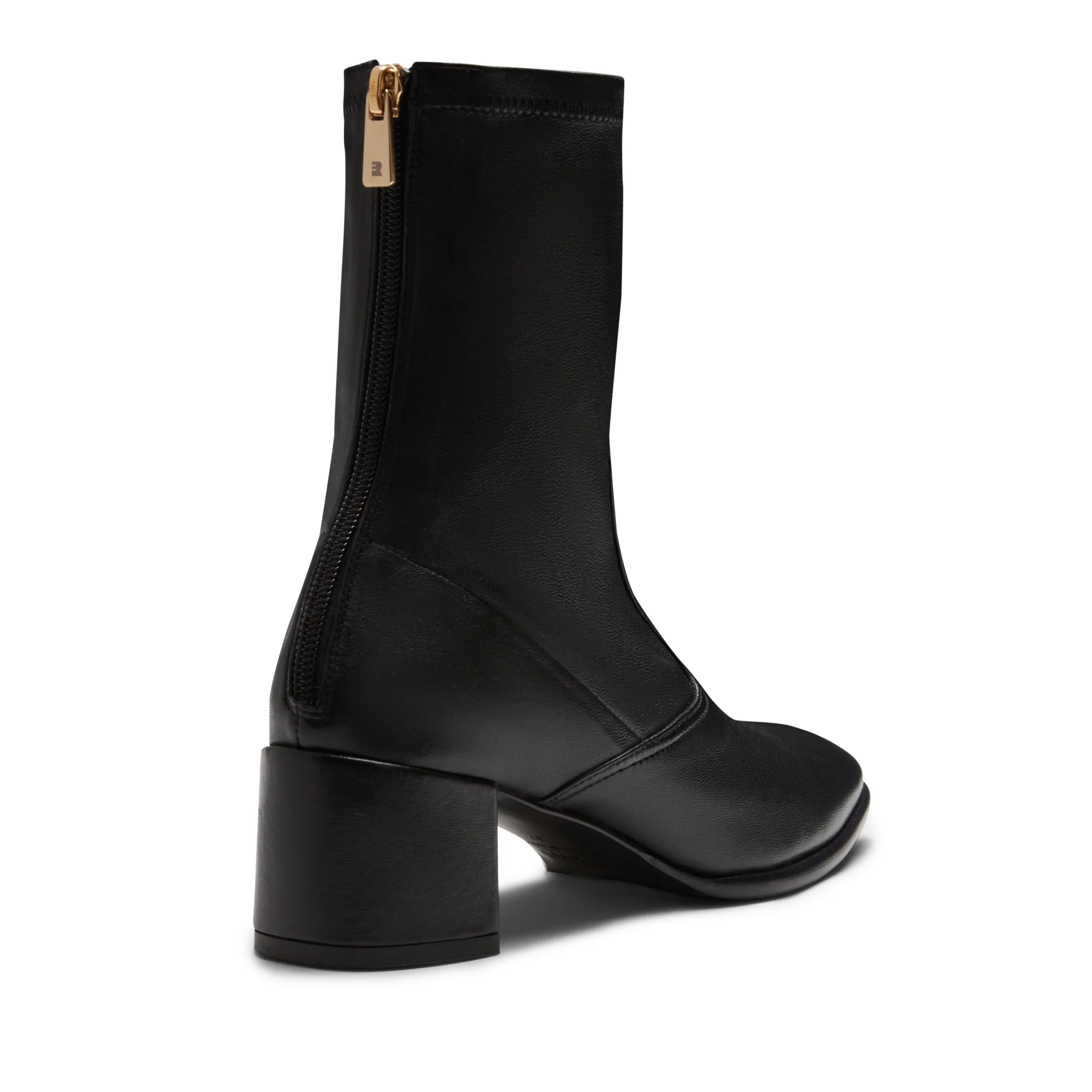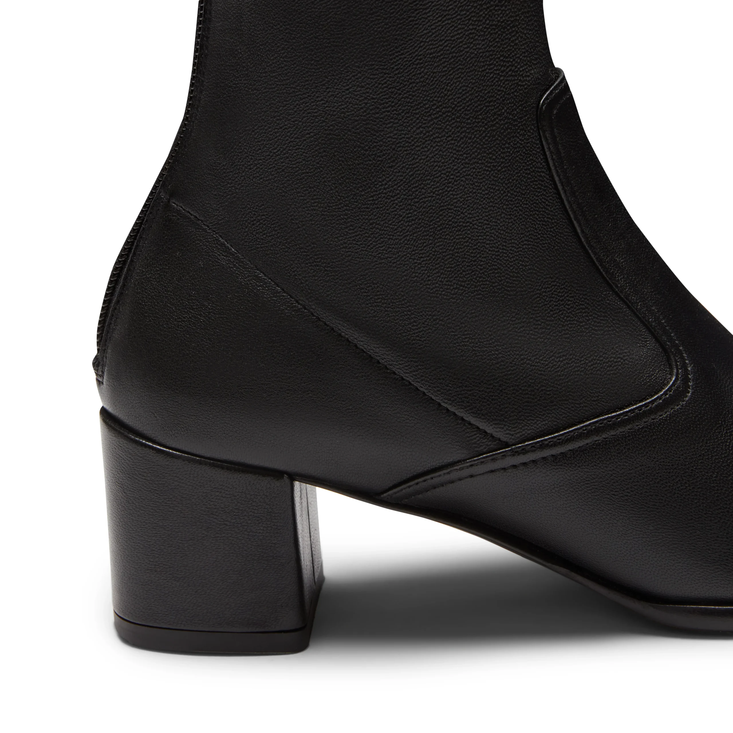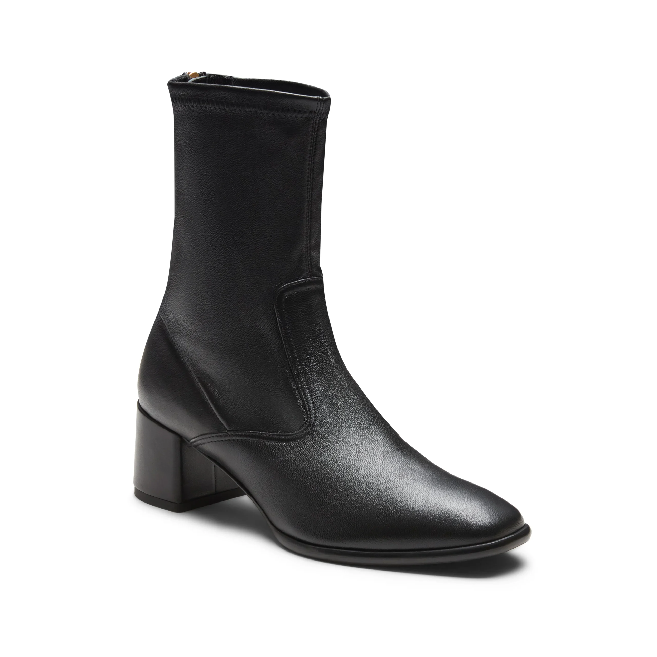 Stivaletto con zip posteriore realizzato in morbida pelle stretch. Calzatura estremamente versatile e femminile, adatta ad essere indossata in tutte le occasioni grazie al comodo tacco altezza 50mm. Suola in cuoio con inserto in gomma.