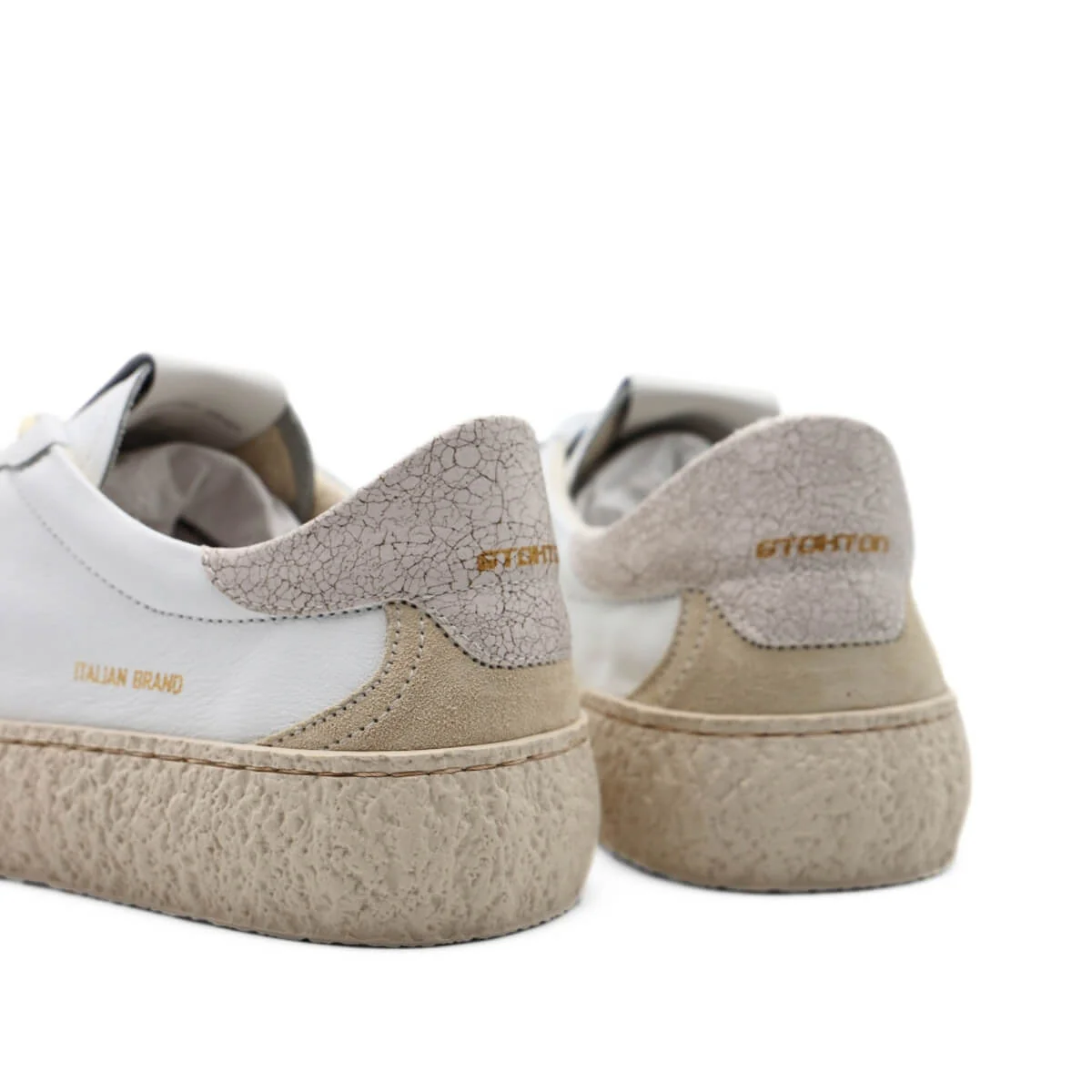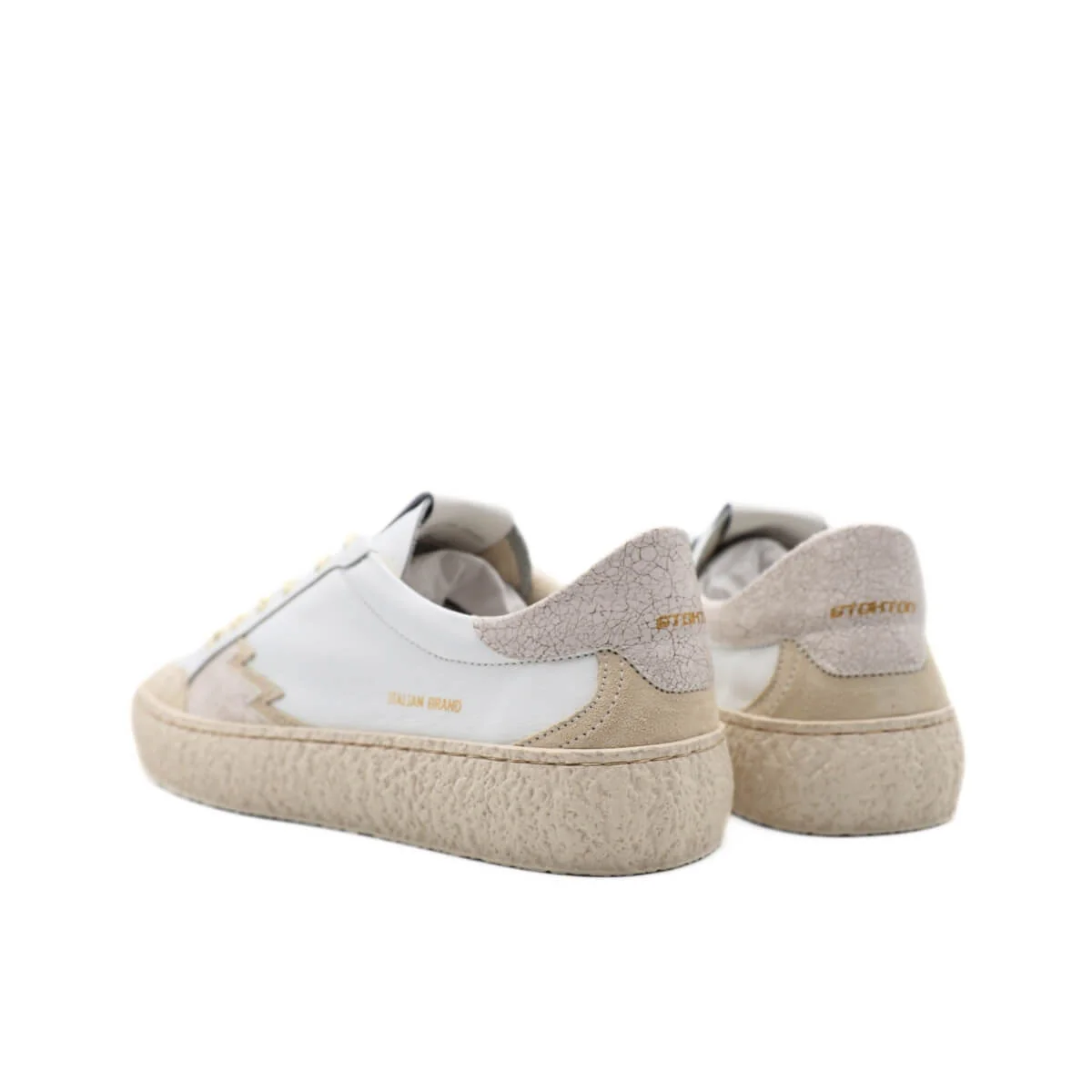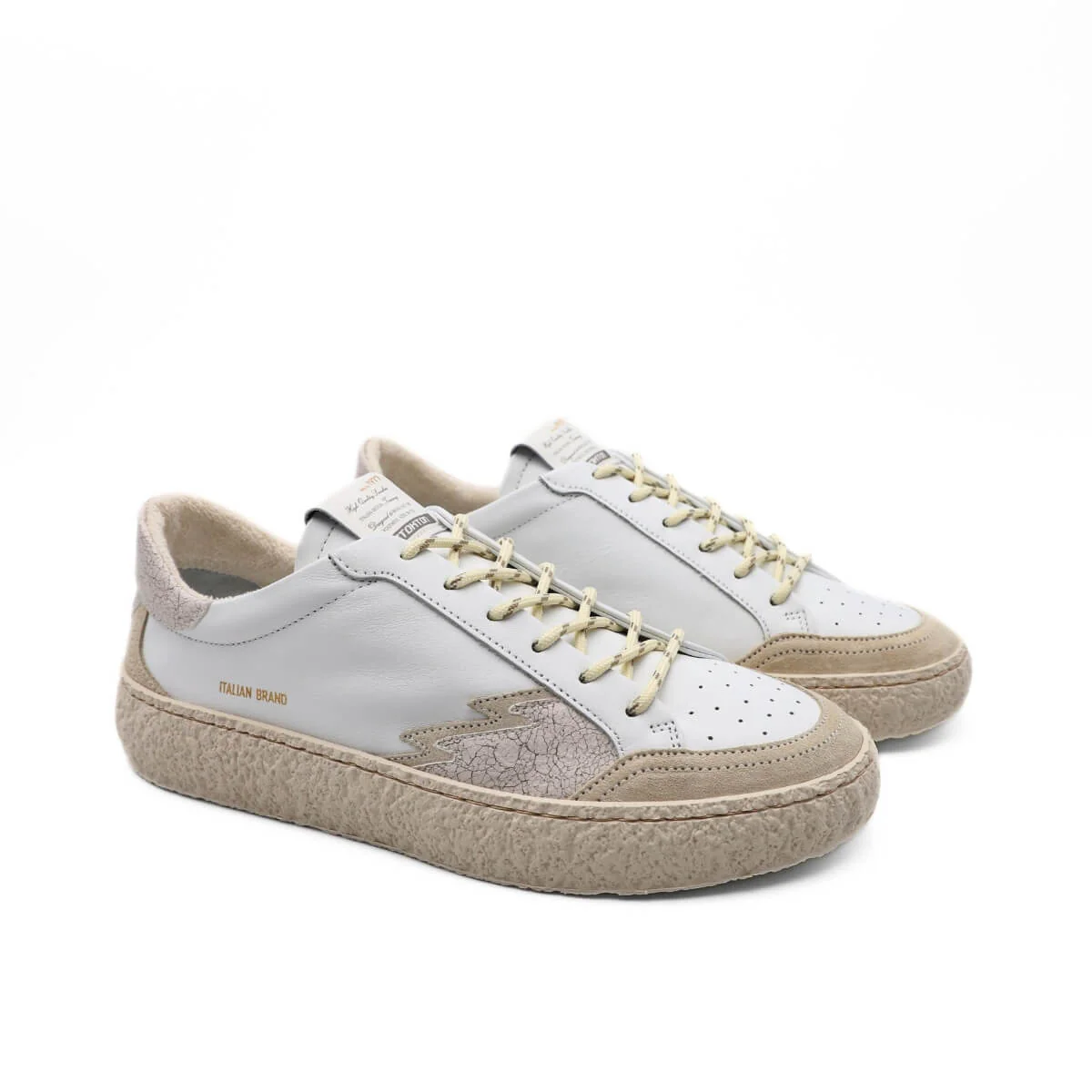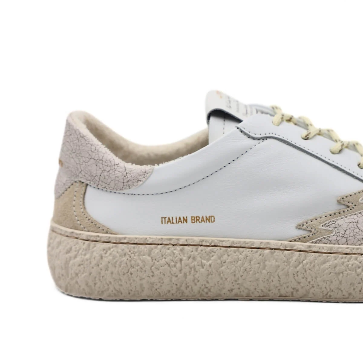 Realizzata con pelle morbida bianca con inserti beige, questa sneaker offre una sensazione piacevole al tatto e un look raffinato. Il bianco luminoso della tomaia esalta la versatilità del design, rendendola un capo facile da abbinare con outfit diversi, dal casual più rilassato a quello curato con un tocco di eleganza urbana. Internamente è realizzata in pelle e tessuto son sottopiede estraibile e da una suola in gomma con lavorazione effetto para.