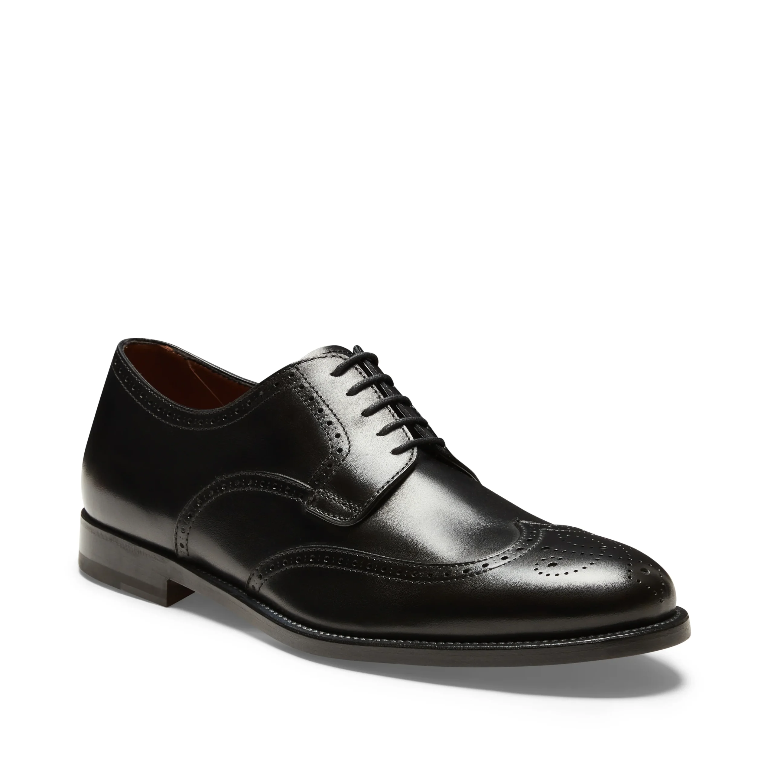 Stringata Derby brogue a cinque fori ispirata alle forme tradizionali anglosassoni, realizzata in morbida pelle liscia di colore nero spazzolata artigianalmente. Questo processo artigianale dona alla calzatura un aspetto semilucido e leggermente anticato. Calzatura dalla linea classica, per un look impeccabile unito ad una calzata confortevole. Suola in cuoio con mezza pianta in gomma.Art. 15218