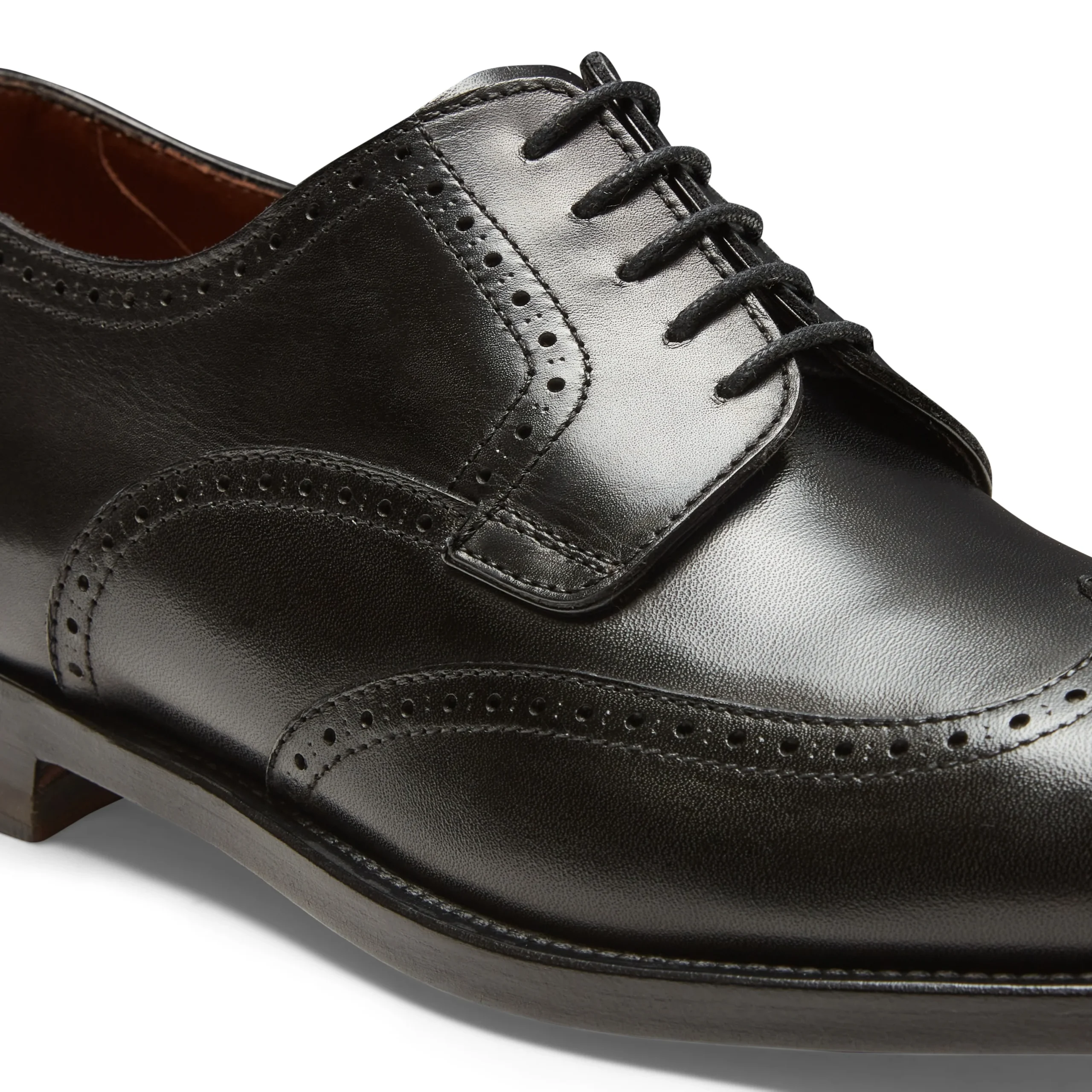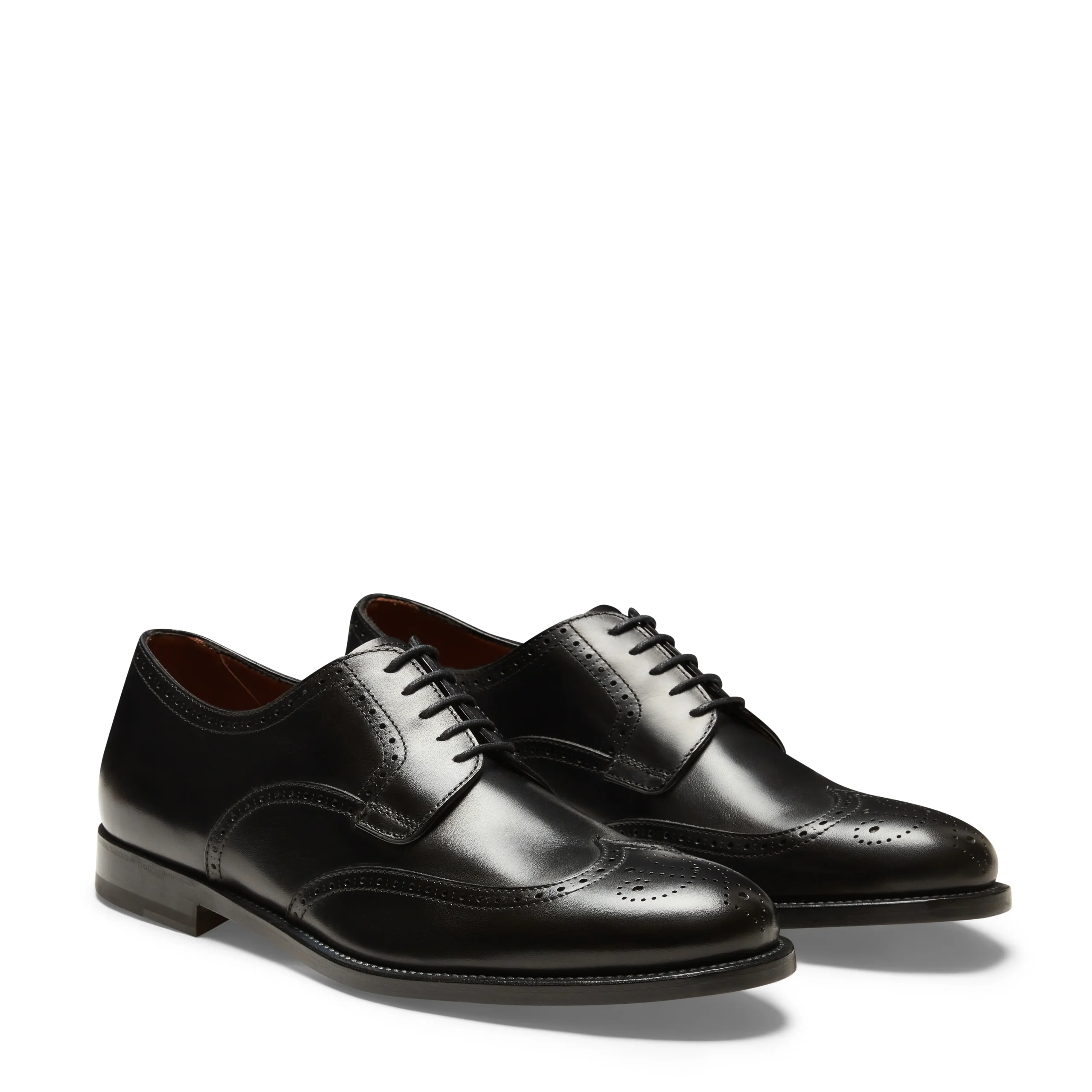 Stringata Derby brogue a cinque fori ispirata alle forme tradizionali anglosassoni, realizzata in morbida pelle liscia di colore nero spazzolata artigianalmente. Questo processo artigianale dona alla calzatura un aspetto semilucido e leggermente anticato. Calzatura dalla linea classica, per un look impeccabile unito ad una calzata confortevole. Suola in cuoio con mezza pianta in gomma.