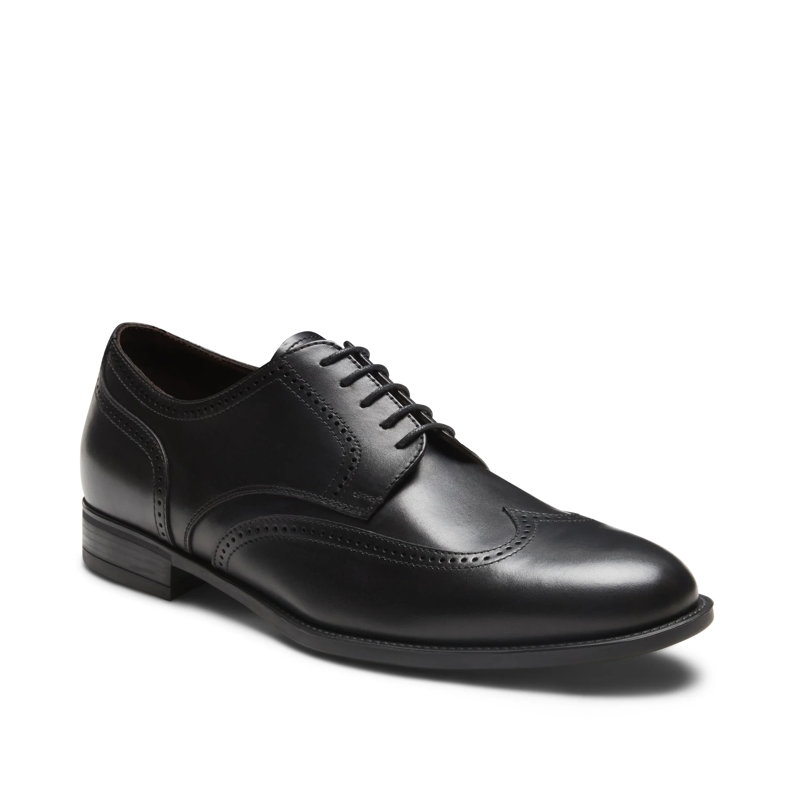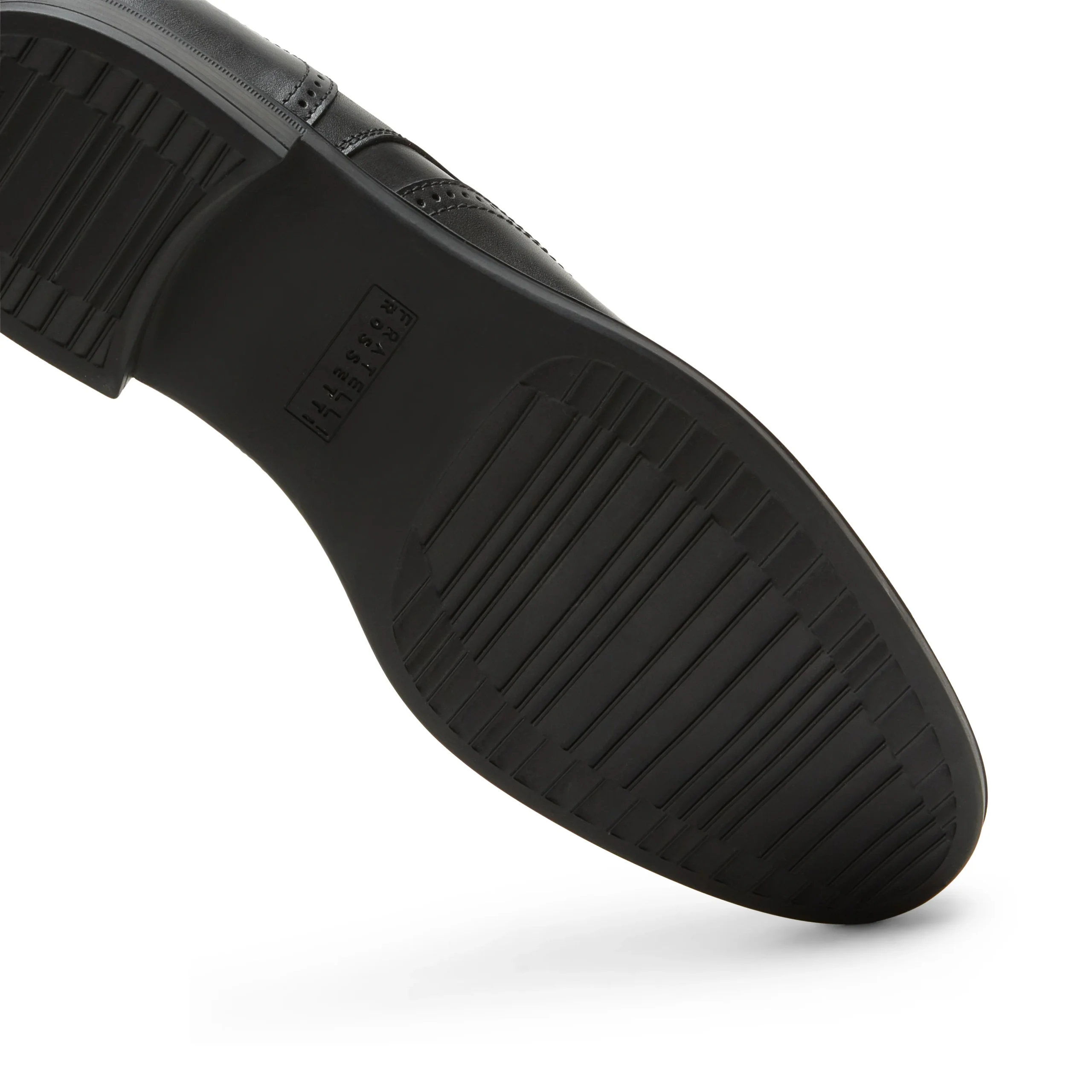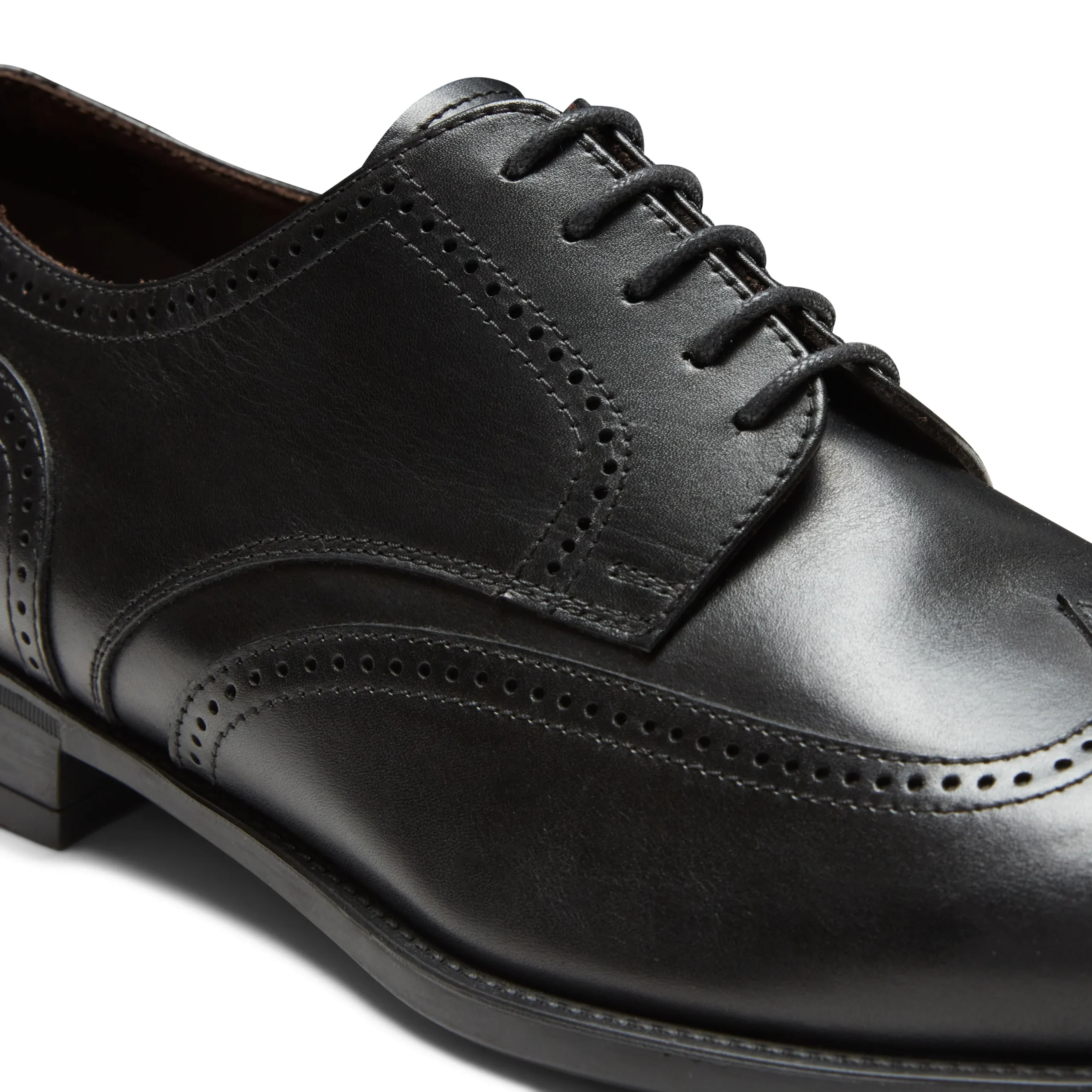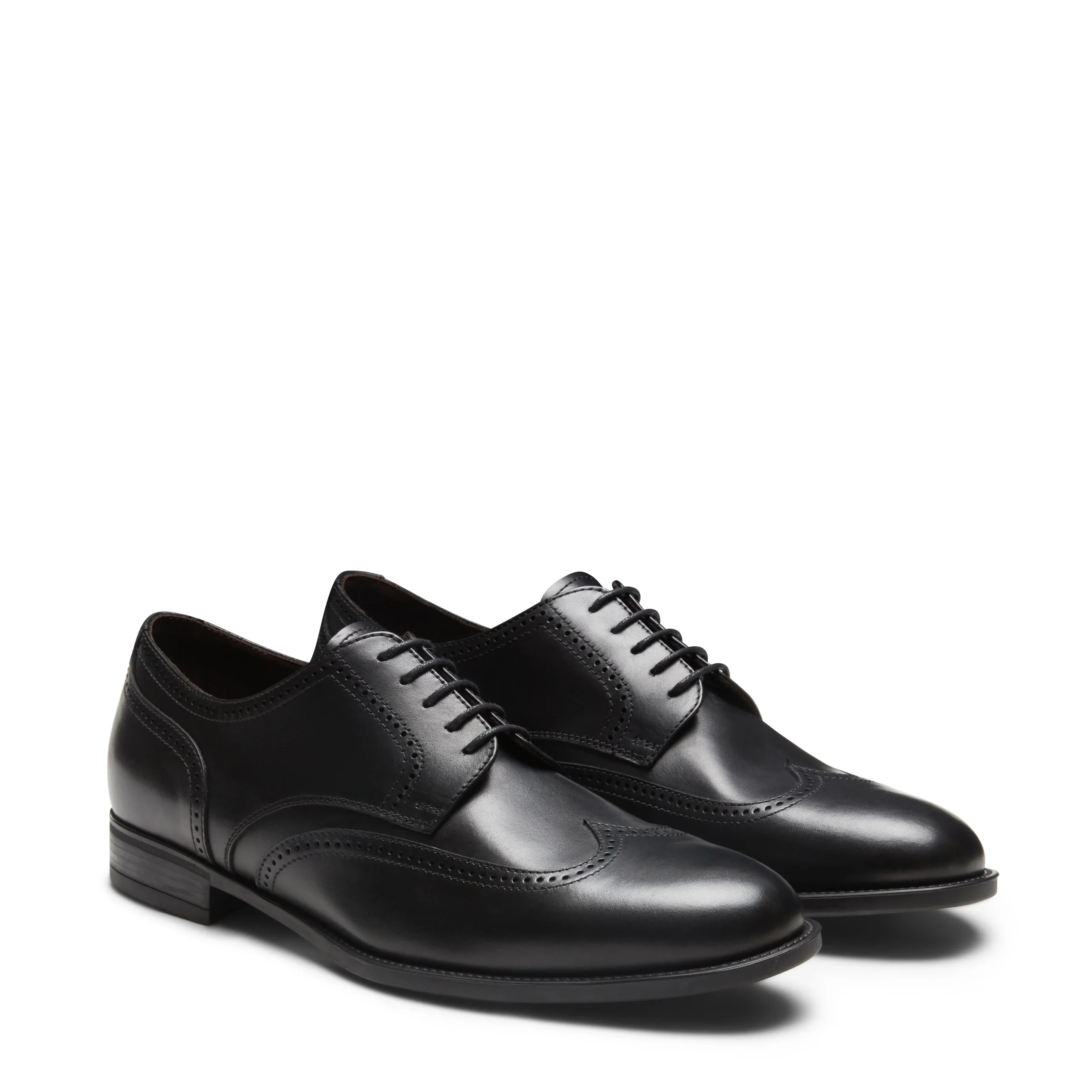 Stringata derby con lavorazione brogue che coniuga comfort e uno stile raffinato e informale, ispirato alla tradizione delle calzature anglosassoni. Realizzata in pelle liscia nera con un leggero effetto anticato, perfetta combinazione tra classicità e contemporaneità. Suola personalizzata in lattice con grip e scanalature antiscivolo.