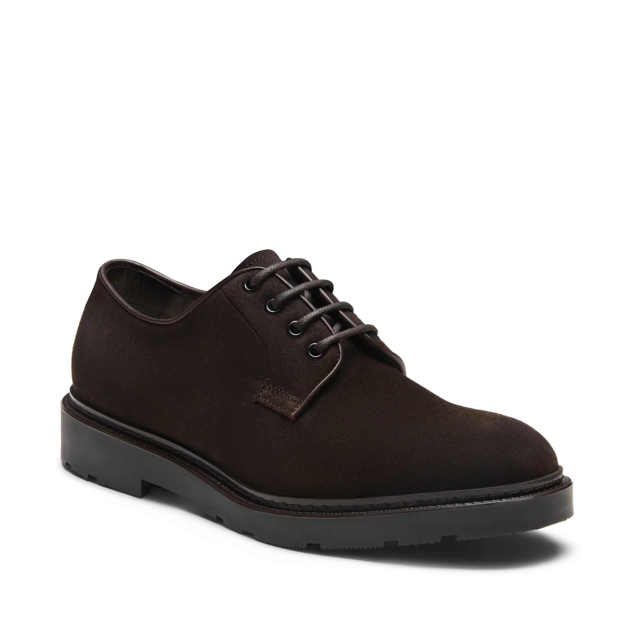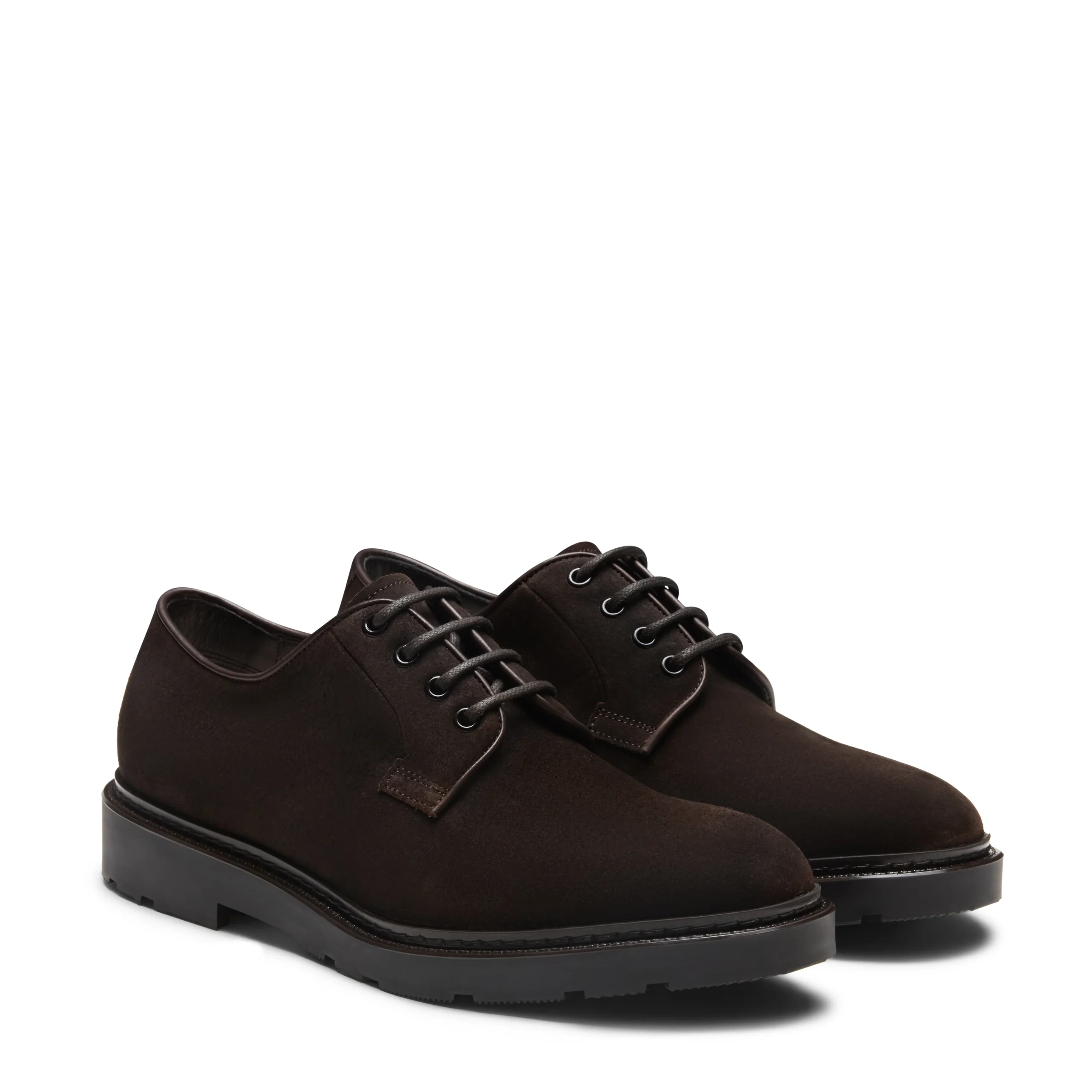 Stringata derby con bordo accentuato e forma arrotondata, realizzata in pelle scamosciata color cacao. Calzatura dallo stile classico ed esclusivo, un perfetto connubio tra aspetto formale e carattere distintivo. Suola in poliuretano con guardolo cucito a mano, caratterizzata da uno strato superiore morbido e flessibile per il comfort del piede, il battistrada garantisce invece robustezza e grip antiscivolo.