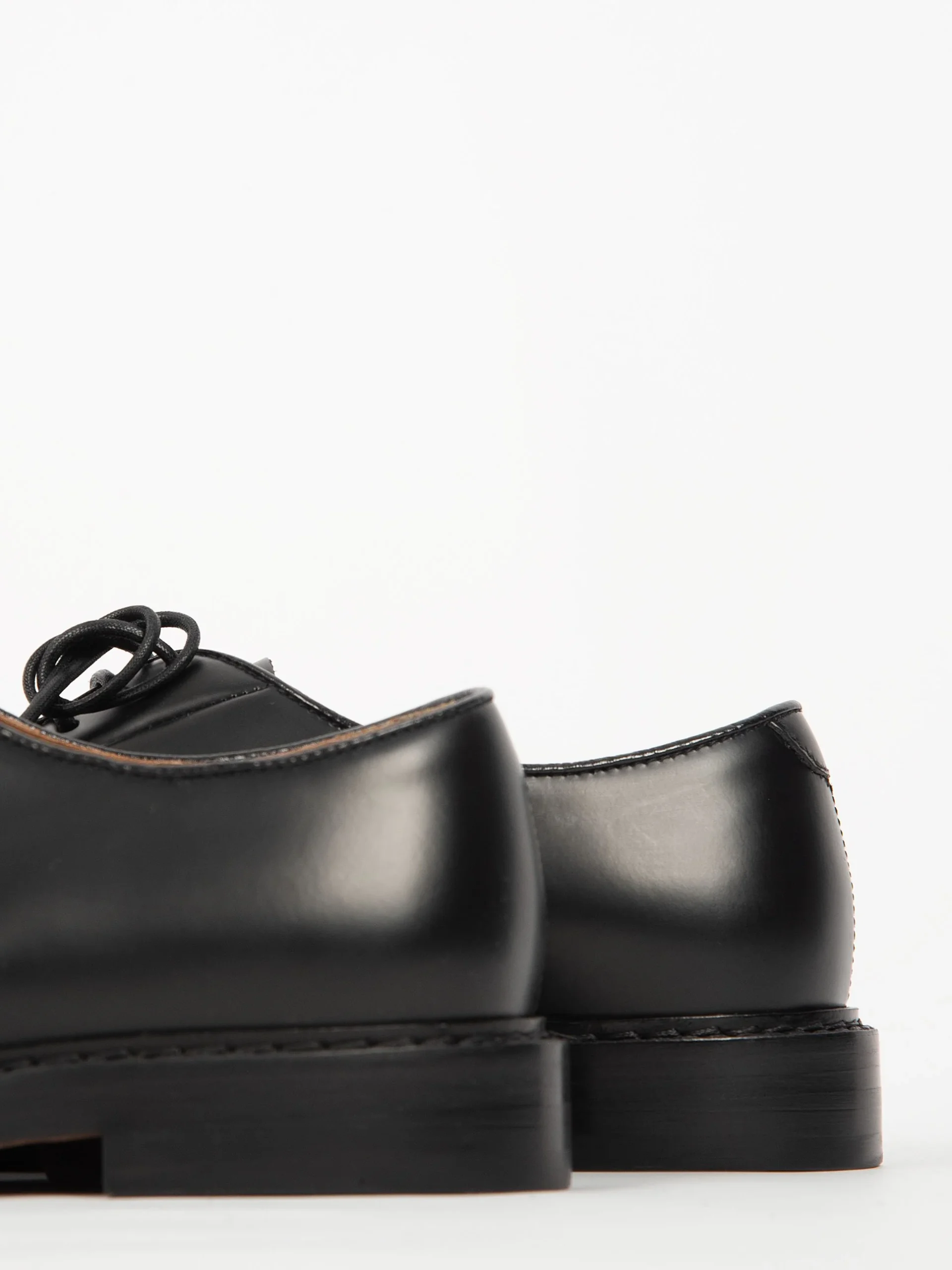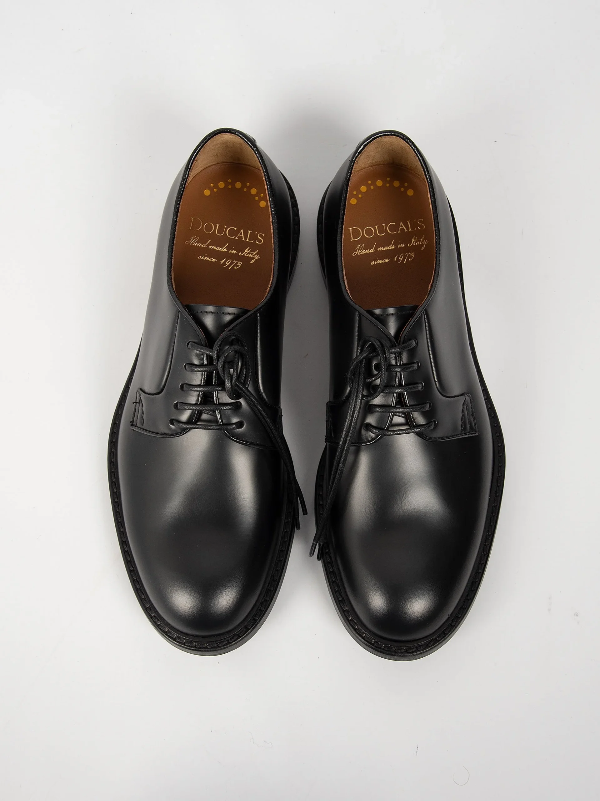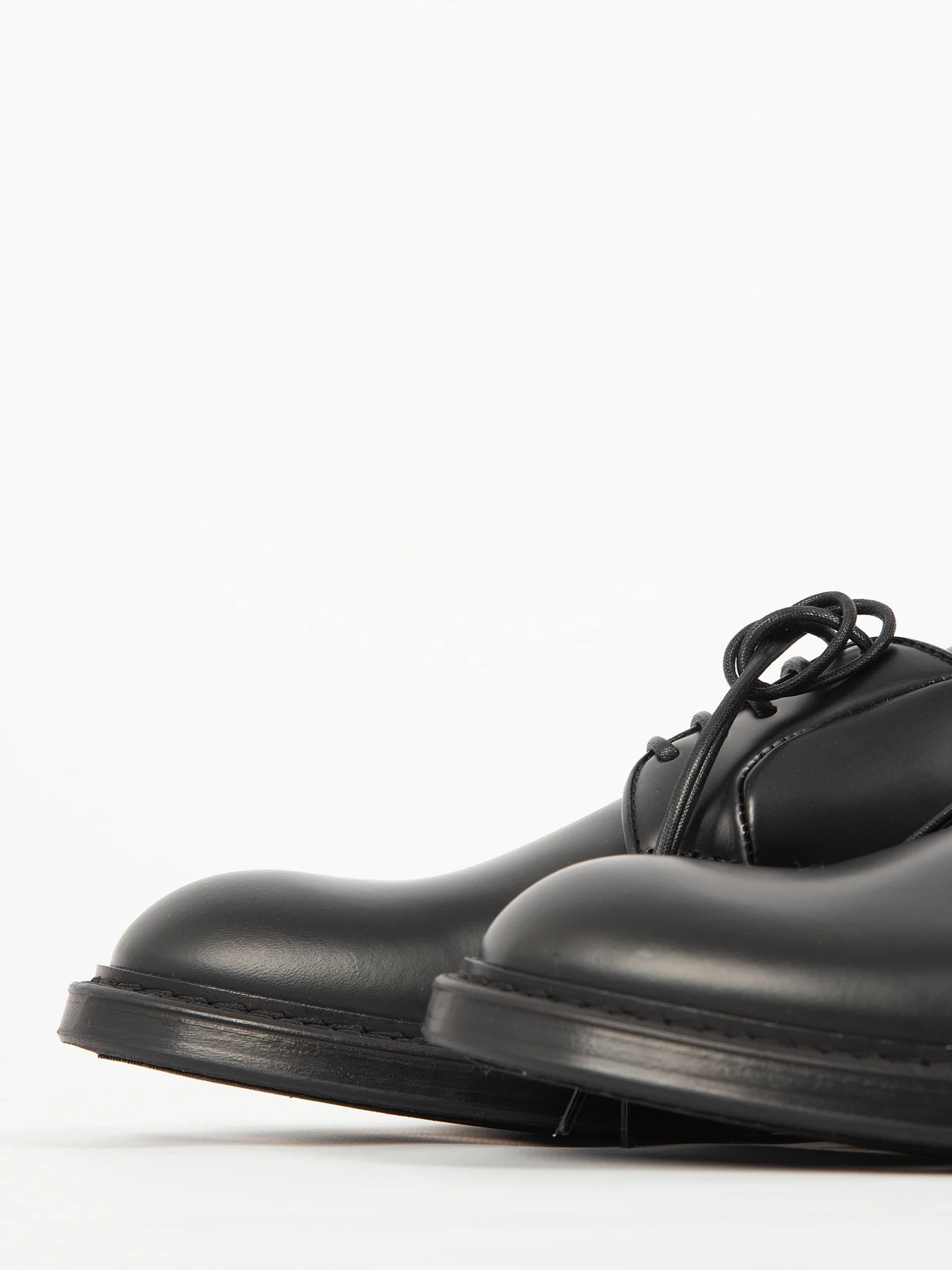 Mod: DU13 SAVOUF Stringata artigianale in 100% pelle liscia nera. Allacciatura centrale a cinque occhielli con laccio in pelle. Suola ibrida in cuoio con inserti anti scivolo in gomma. Pianta larga. 100% costruzione artigianale italiana. Calzata ampia, si consiglia un numero in meno rispetto alla norma.