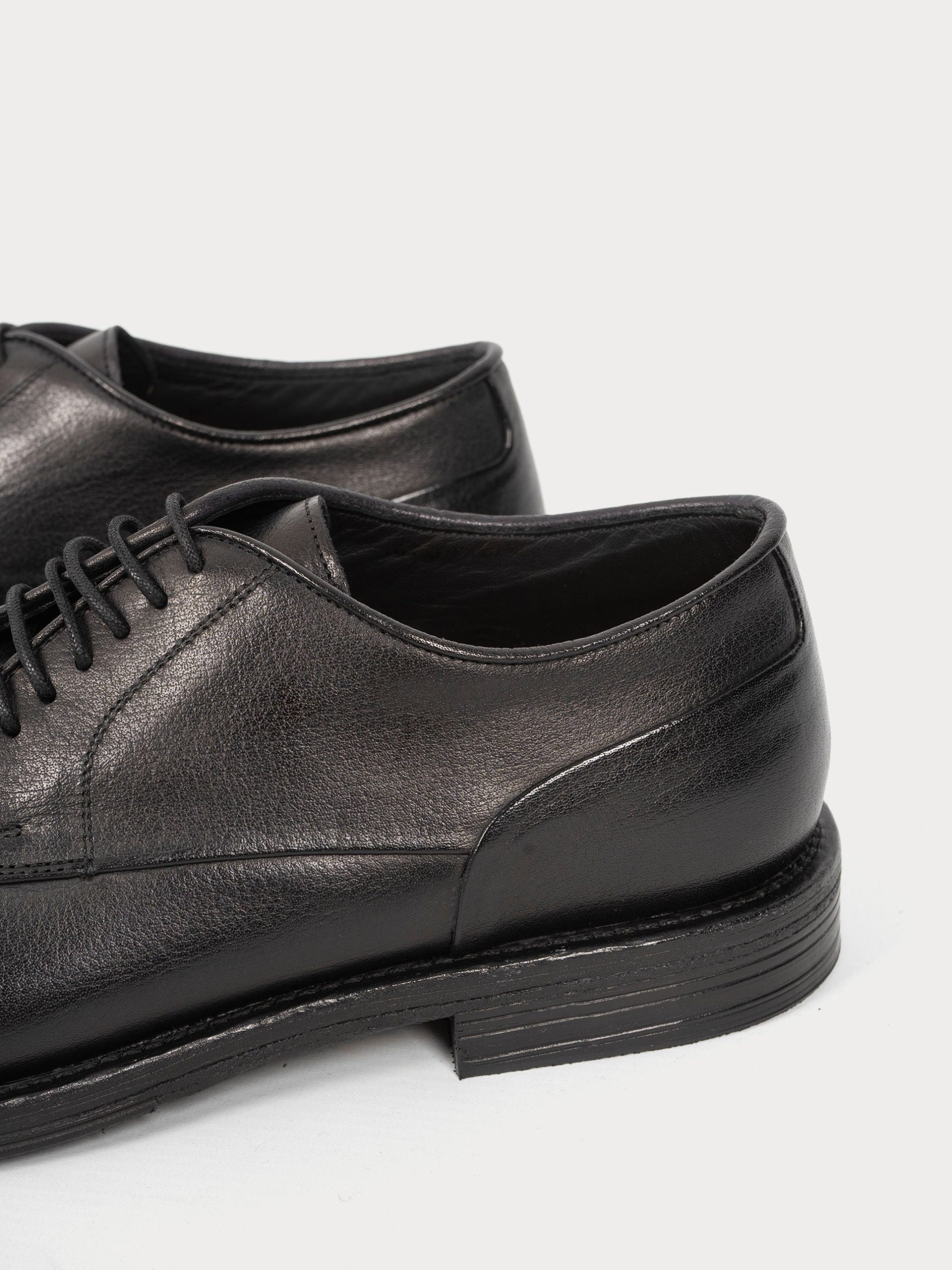 Mod: 18332F WIDEN NERO 46705 Stringata artigianale in pelle di bufalo tamponata a mano. Modello con punta tonda leggermente affusolata. Classica allacciatura con lacci in cuoio. Suola ibrida in cuoio e inserti antiscivolo. Altezza tacco 25mm. Prodotto 100% made in Italy. Calzata ampia, si consiglia un numero in meno rispetto alla norma.