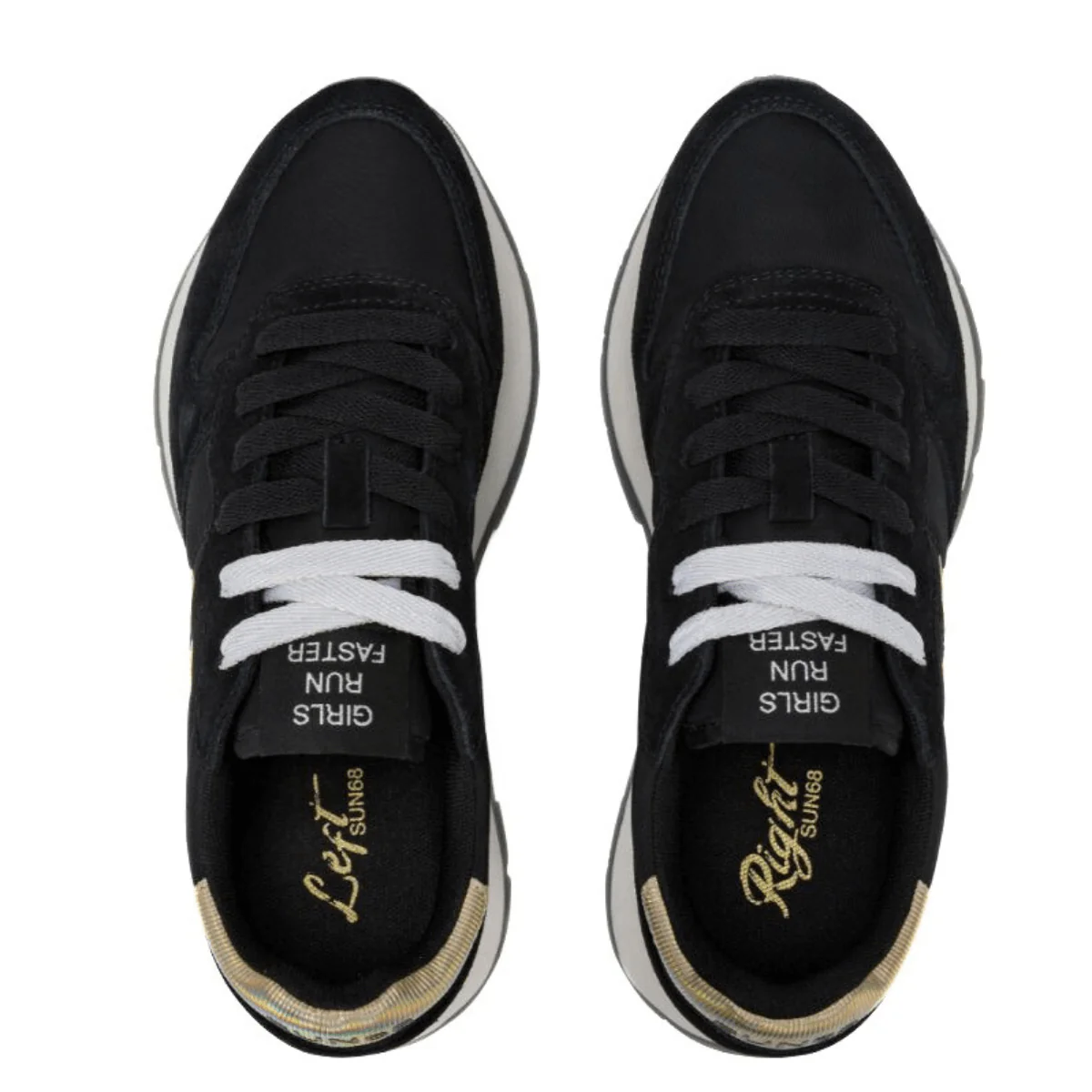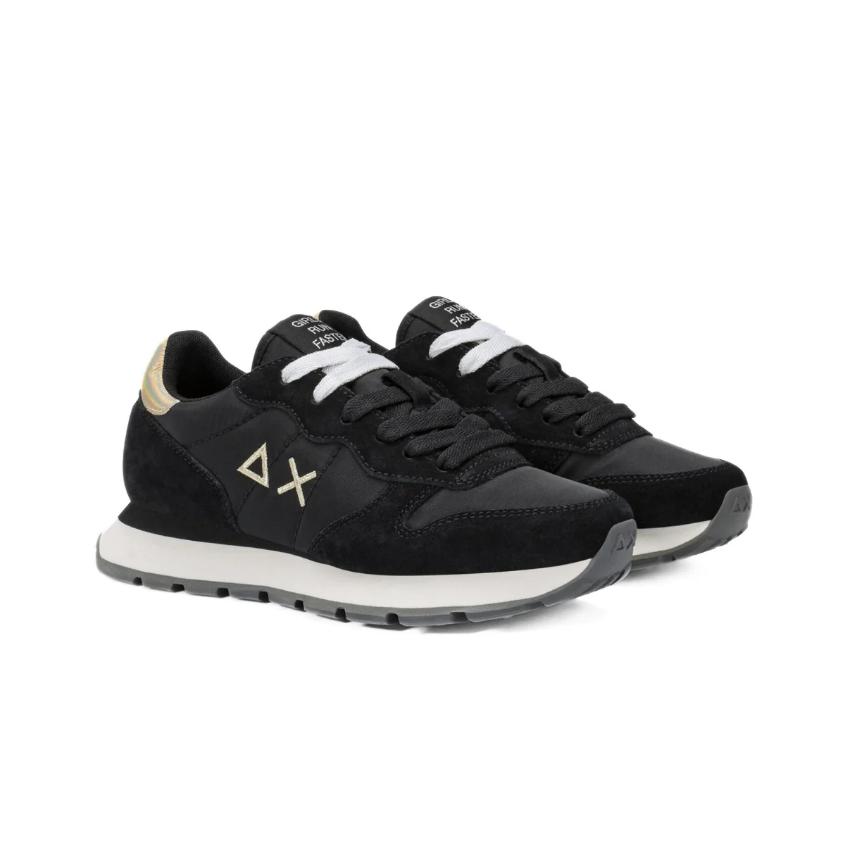 Una perfetta sintesi di ispirazione sport, lifestyle dinamico e glamour moderno: la sneaker Ally Gold Silver è l’icona SUN68 riletta con dettagli laminati che illuminano il look. Dallo stile running, è realizzata in nylon e suede con fodera in micro mesh e morbido plantare estraibile. Suola in EVA fresata a mano e battistrada in gomma. Secondo laccio in dotazione.