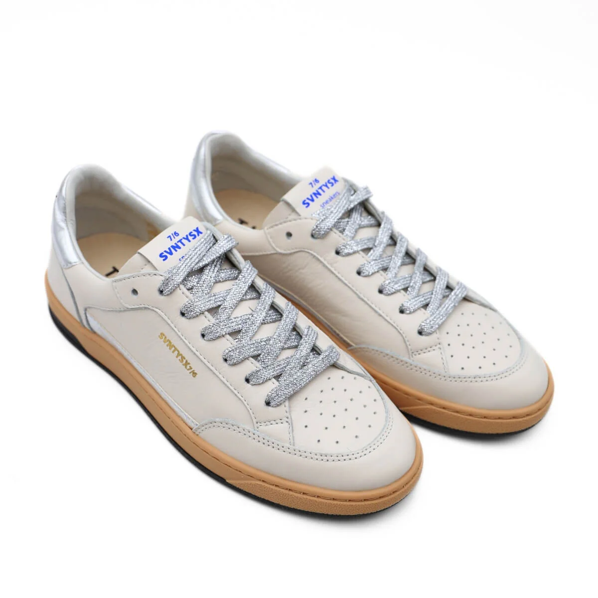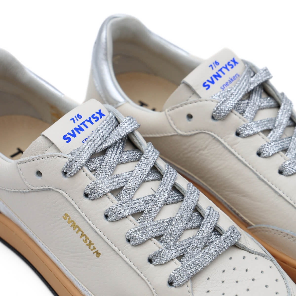 Realizzate in pelle di qualità con inserti effetto metallizzato, offrono una superficie morbida al tatto e una struttura solida ma confortevole. I dettagli argento e i lacci luminosi aggiungono un tocco brillante che valorizza la base bianca senza appesantire l’insieme, mantenendo un’estetica armoniosa e moderna.