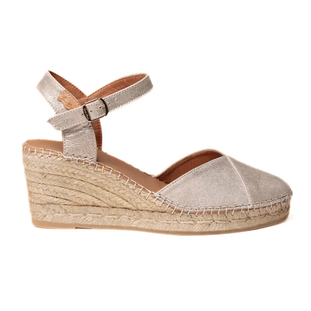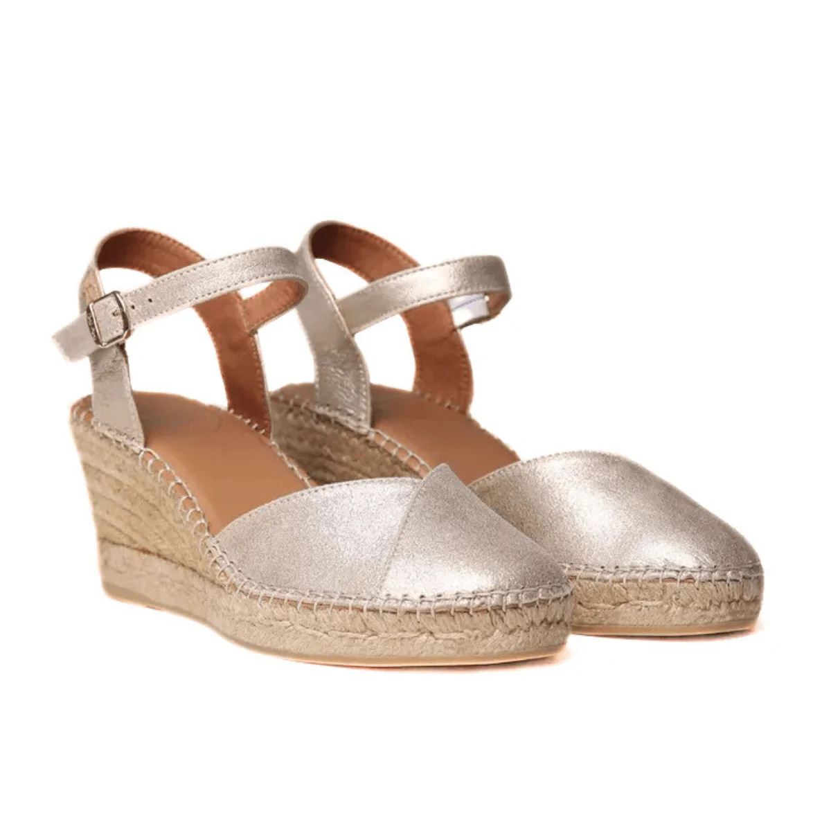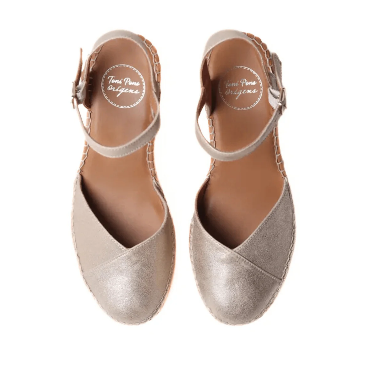 Zeppa in corda di TONI PONS, realizzato con puntale in similpelle laminata oro, con cinturino regolabile alla caviglia. Sottopiede in pelle e suola in gomma, con zeppa in corda (7cm).
