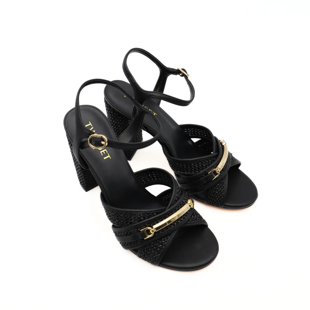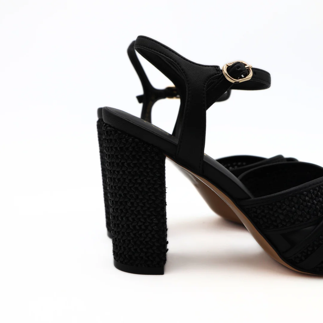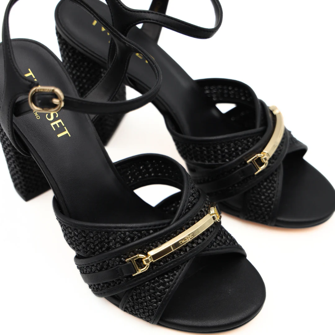 Sandalo da donna di TWINSET realizzato in tessuto raffia nero, con cinturino regolabile in pelle alla caviglia. Interno e sottopiede rivestito in pelle. Suola in gomma e tacco rivestito in pelle, 10cm.
