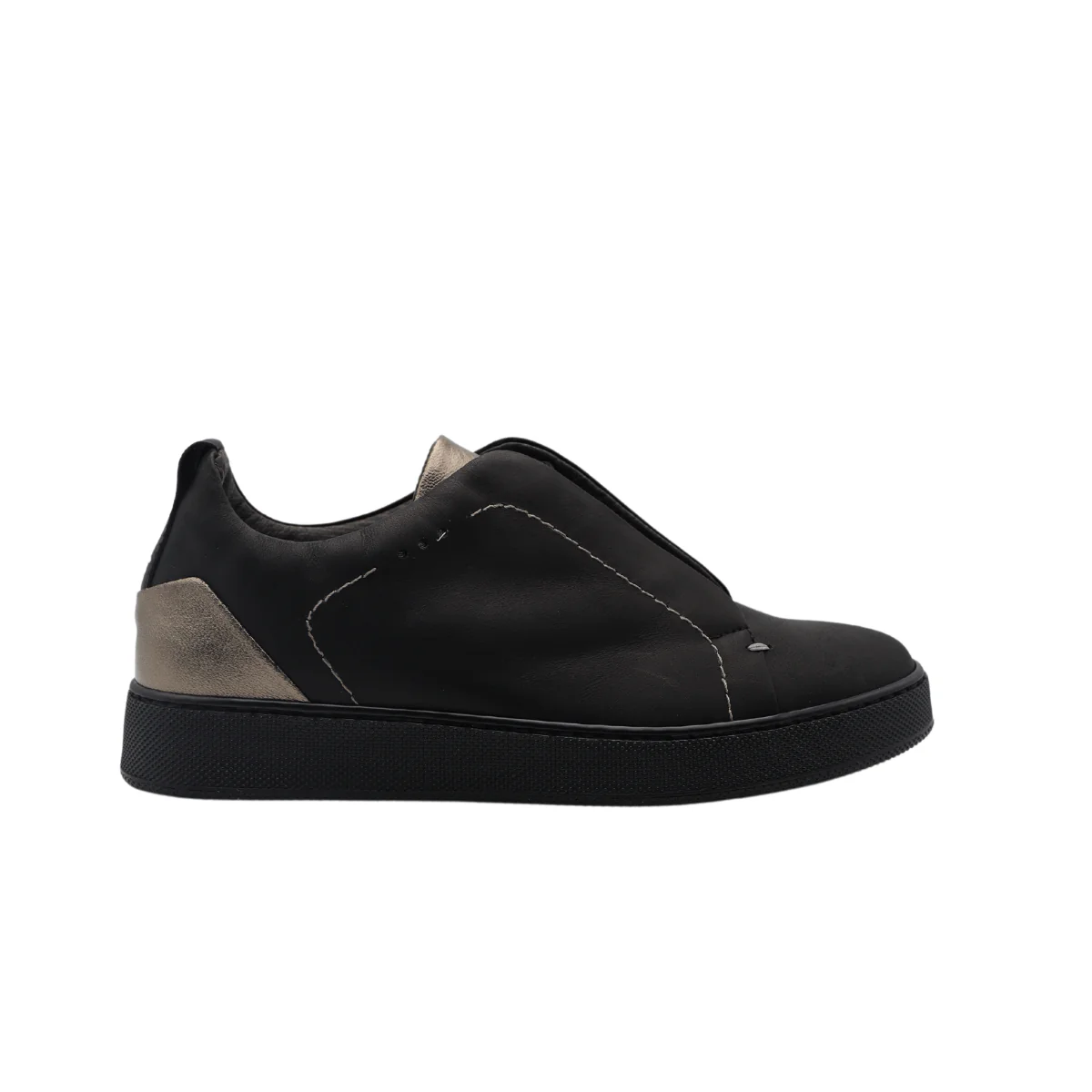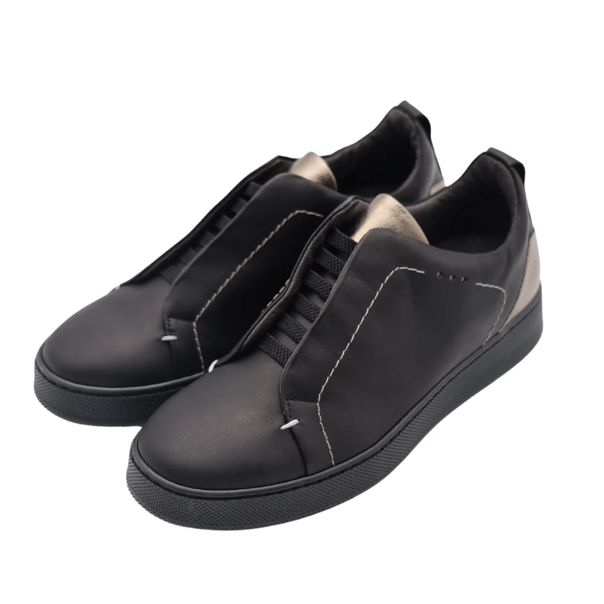 Slipon donna di TYKO. Realizzata in pelle nera con inserto in pelle laminata color oro sulla linguetta e sul tallone, Interno foderato e sottopiede, estraibile, in pelle. Suola in gomma.